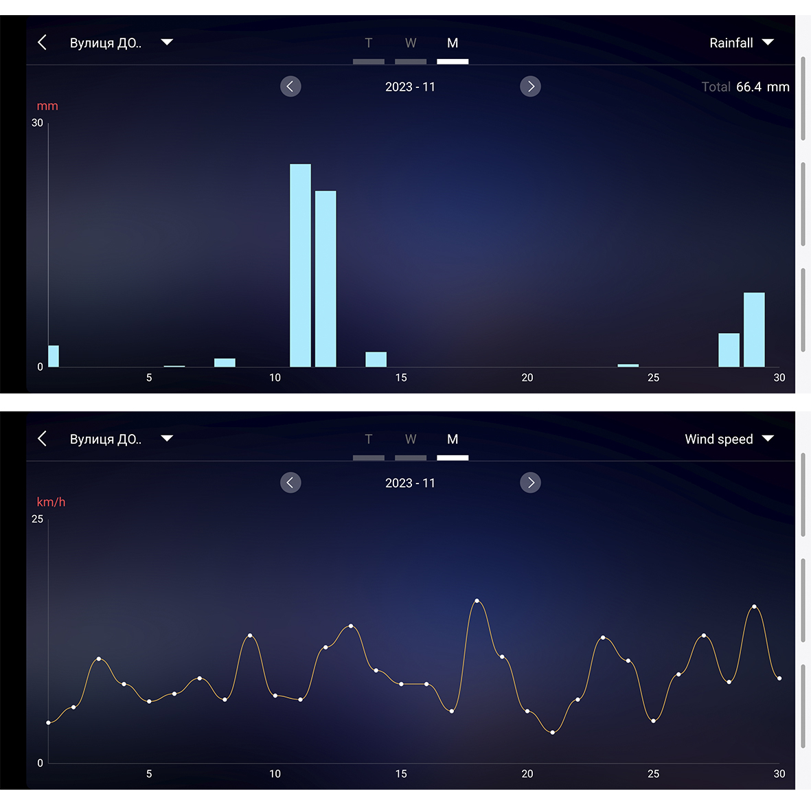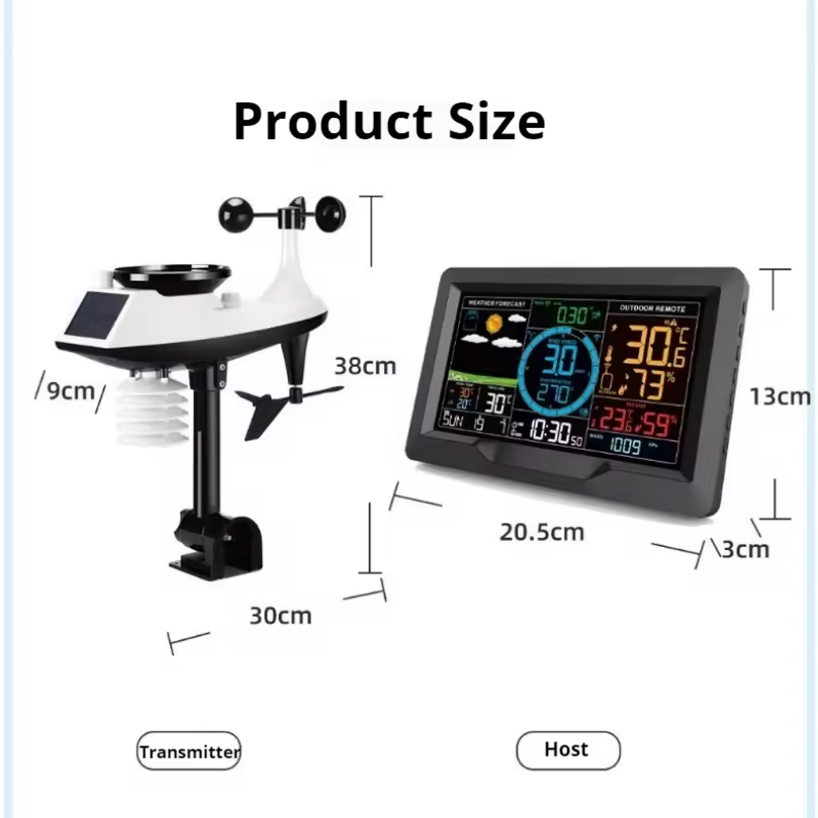 * Дані про кількість опадів із записами історії * Дані про вітер: поточна та максимальна швидкість * Історія швидкості вітру * Напрямок вітру * Настроювані сповіщення: температура, вологість, вітер і дощ * Вічний календар із днями тижня * Будильник 12/24 години відображення часу * Відображення температури в °C/°F * Максимальна/мінімальна пам’ять для гігрометра та термометра * Діапазон температур у приміщенні: від +32°F до +122°F (0°C до 50°C) * Діапазон внутрішнього гігрометра: (20%-95%) * Розмір РК-дисплея: 92,5*166,5 мм * Розмір виробу: 205*130*32 мм * Джерело живлення змінного/постійного струму 230/DC5V в комплекті, 2 x AA батарейки 1,5V для автономного живлення (не входять в комплект)