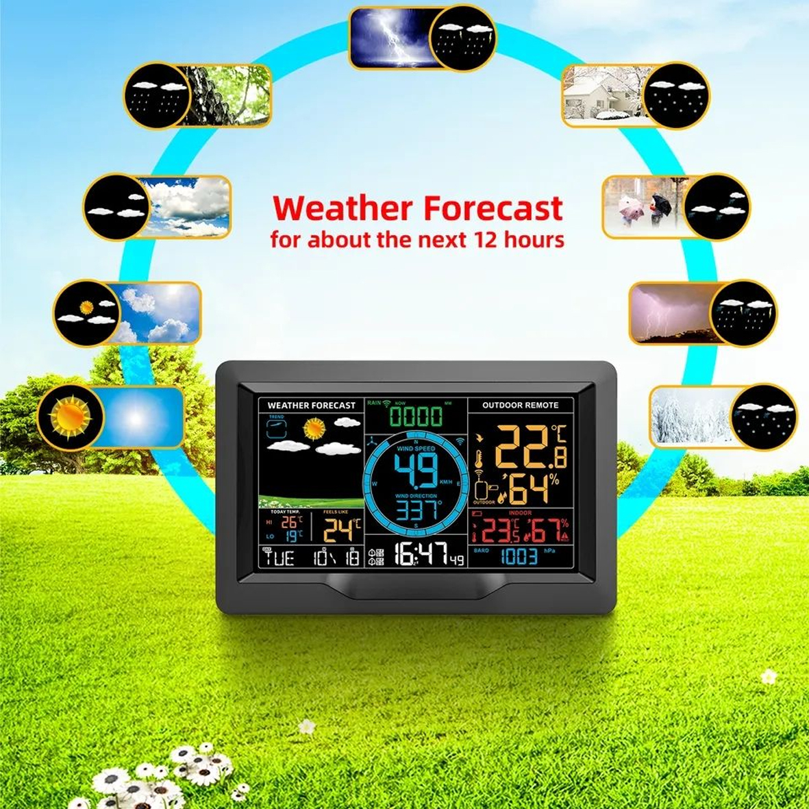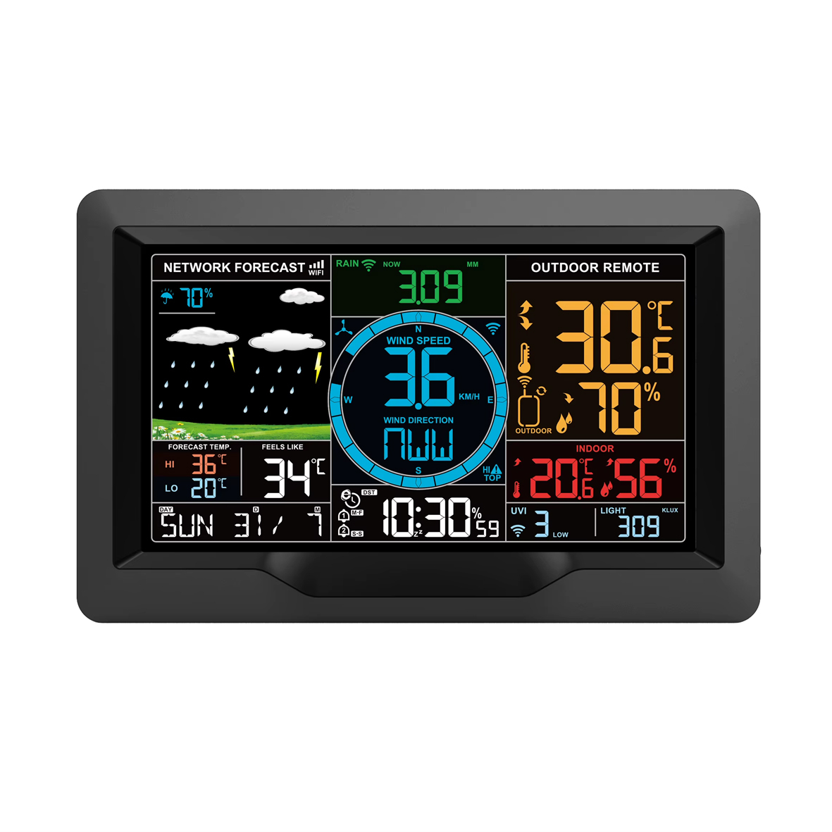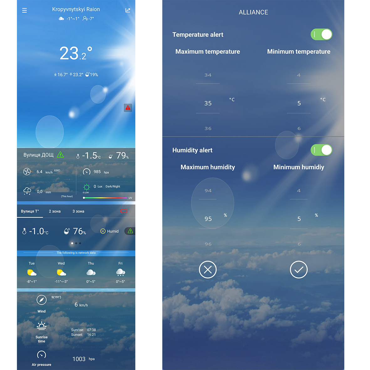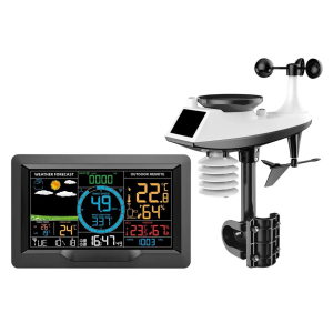 Метеостанція від Alliance Group - це сучасний багатофункціональний інструмент для професійного моніторингу погоди назовні та комфорту в приміщеннях будь якого типу. Станція оснащена кольоровим дисплеєм із підсвічуванням, що дозволяє комфортно використовувати її у будь-який час доби. Вона визначає температуру, вологість, тиск, швидкість і напрям вітру, кількість та інтенсивність опадів, а також рівень освітленості та ультрафіолетовий індекс. Станція має функції вимірювання точки роси, теплового індексу та коефіцієнта охолодження вітром. Це важливо для людей із хронічними захворюваннями, оскільки при перевищенні комфортних значень на дисплеї з'являється попередження. Метеостанція підключається до Інтернету через Wi-Fi і синхронізується з серверами точного часу та погодними серверами. Це дозволяє отримувати актуальні метеозведення та попередження про погіршення погоди. Також станція підключається до мобільного додатку WeatherSense на смартфоні, за допомогою якого ви можете віддалено спостерігати за усіма показниками, переглядати історію показань за годину, день, тиждень, місяць за допомогою зручних діаграм, та робити прогнози на тривалий час а також налаштовувати сигнали сповіщень на телефоні при досягненні певних показників. Зовнішній модуль є мультисенсором, який вимірює температуру, вологість, силу та напрямок вітру, кількість опадів, рівень освітленості, ультрафіолетовий індекс і встановлюється на вулиці, а основний модуль – у приміщенні. Максимальна відстань між станцією і зовнішнім модулем – 100 метрів, але реальна відстань залежить від об’єктів, що перекривають проходження сигналу від зовнішнього датчика. Станція постійно перевіряє значення атмосферного тиску і його основі будує графік, показує зміна його значення. Відстежує такі параметри, як коливання температури, тиску та вологості, станція прогнозує погодні тенденції на найближчі 12-24 години. Значки вказують на очікувану погоду. Метеостанція також підтримує функцію DCF, яка синхронізує час метеостанції з франкфуртським атомним годинником. В результаті показання годинника завжди будуть точними.