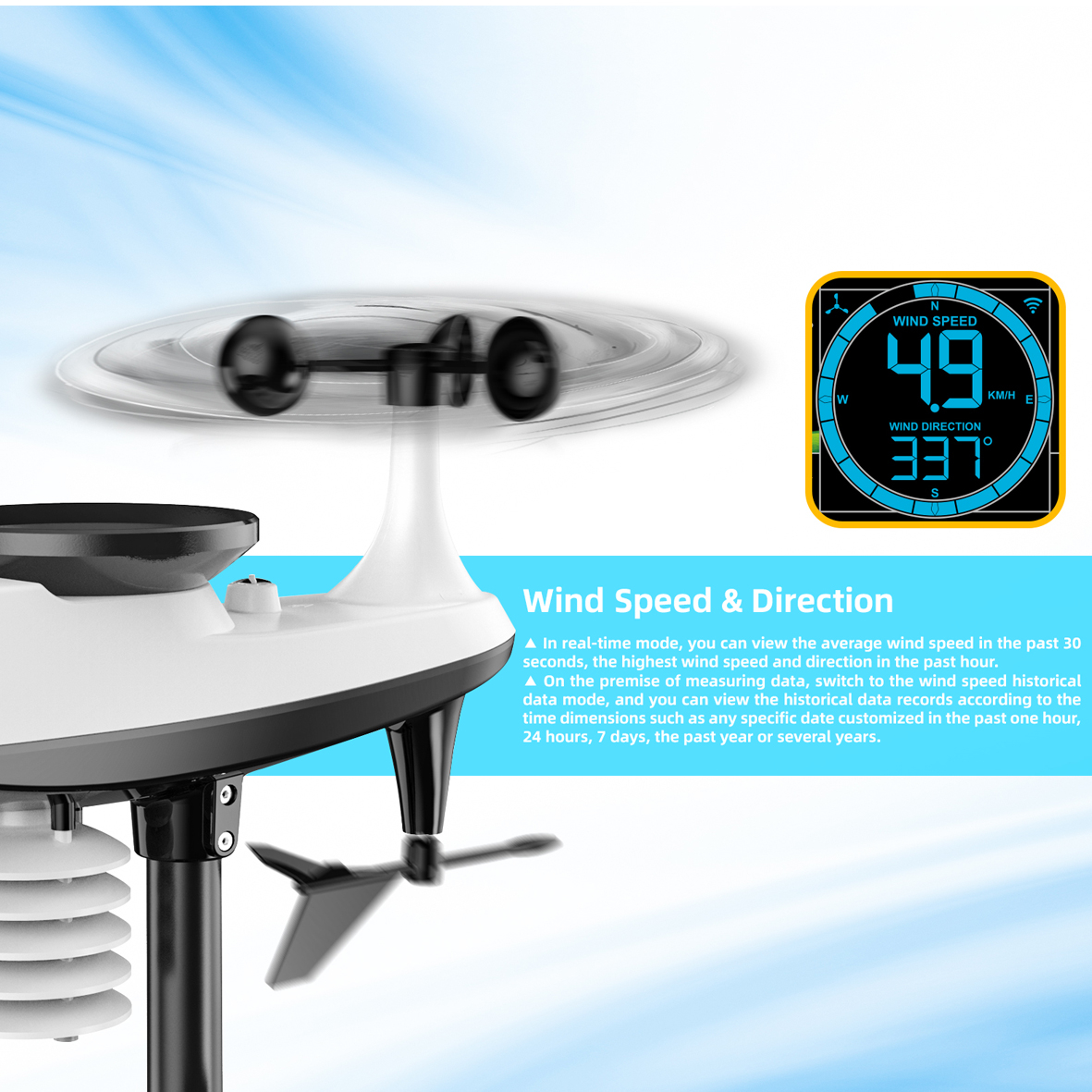 * Діапазон швидкості вітру: від 0 до 111,8 миль/год (0-180 км/год) * Напрямок вітру: від 0° до 359° * Кількість опадів: від 0 до 393,7 дюйма (0 до 9999 мм) * Діапазон зовнішньої температури: від -40 °F до 140 °F (від -40 °C до 60 °C) * Діапазон зовнішнього гігрометра: (20%-95%) * Дальність передачі: до 100 метрів (відкритий простір) * Розмір виробу: 350*47*135 мм * Живлення від 3 лужних батарейок типу "AA" (не входять в комплект) Корисне відео