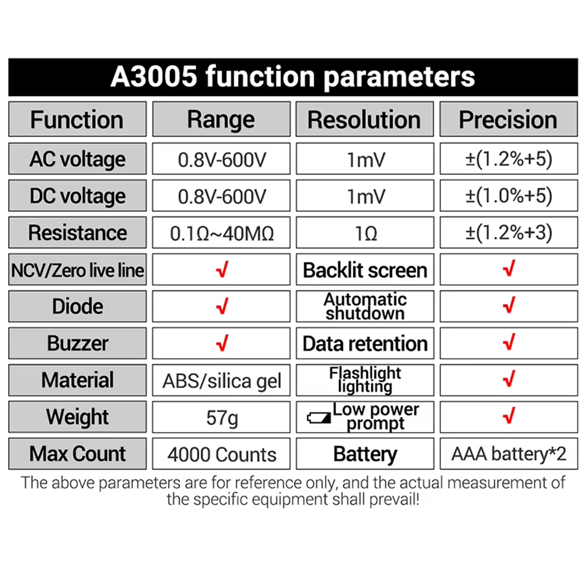 Живлення: дві батареї типу AAA (у комплект не входять). Характеристики ANENG A3005: