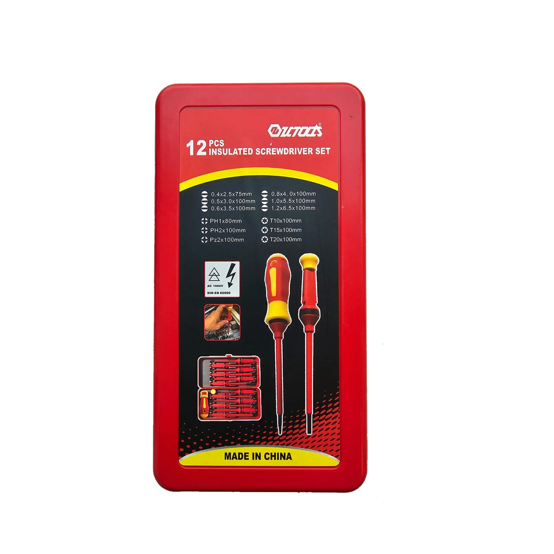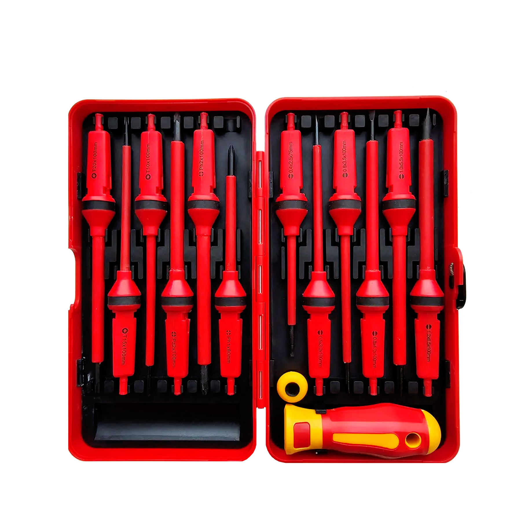 Набір викруток діелектричних 12 одиниць для монтажних робіт оснащений рукояткою та набором змінних діелектричних стрижнів. Конструкція має головку, що обертається, і ергономічну рукоятку з протиковзного матеріалу. Наявність на ручці спеціальної кнопки дозволяє швидко змінювати насадки. Всі викрутки сертифіковані DIN EN 60900, що вимагає, щоб кожен окремий стрижень був випробуваний за 1000 Вольт. Набір викруток діелектричних 12 одиниць включає в себе: Стержні 2,5x0,4 / 3,0x0,5 / 3,5x0,6 / 4,0x0,8 / 5,5x1 / 6,5x1,2 / PZ2 / РН1 / РН2 / Torx 10 / 15 / 20. Комплектація набору: Рукоятка E-SMART 95х32 мм; Стержні - 12шт; Міцний кейс 230х30х56 мм.