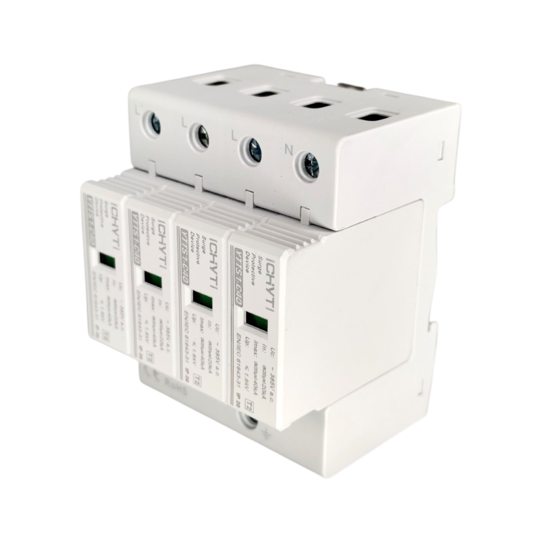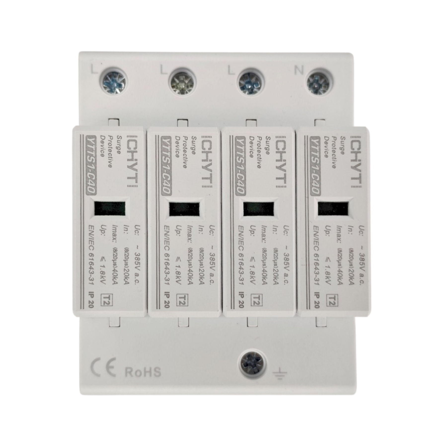 Обмежувач перенапруги SPD AC 385V 20~40KA 4полюси Обмежувач перенапруги постійного струму CHYT 4P 385V — це пристрій для захисту електричних систем від перенапруг, викликаних грозовими розрядами та іншими непередбачуваними подіями. Цей розрядник забезпечує ефективний захист для сонячних електростанцій, систем зберігання енергії та інших пристроїв на постійному струмі. Основні характеристики: Кількість полюсів: 4P Номінальна напруга: 385V AC Номінальний розрядний струм (In): 20kA Максимальний розрядний струм (Imax): 40kA Рівень захисту напруги (Up): ≤ 1.8kV Ступінь захисту корпусу: IP20 Застосування: Захист сонячних панелей у фотоелектричних системах. Захист інверторів та інших компонентів систем постійного струму.