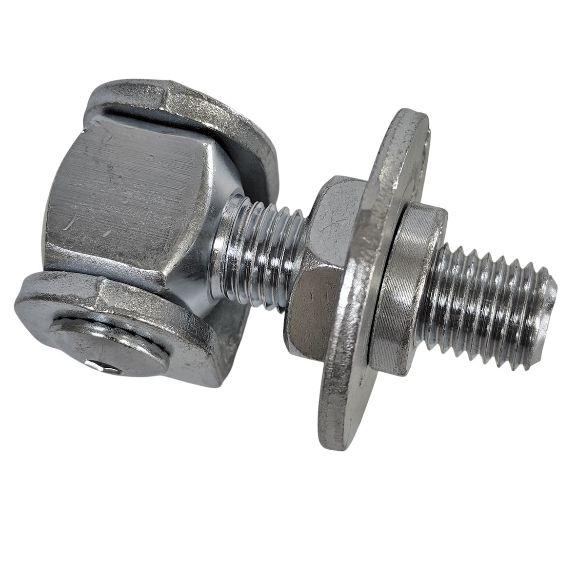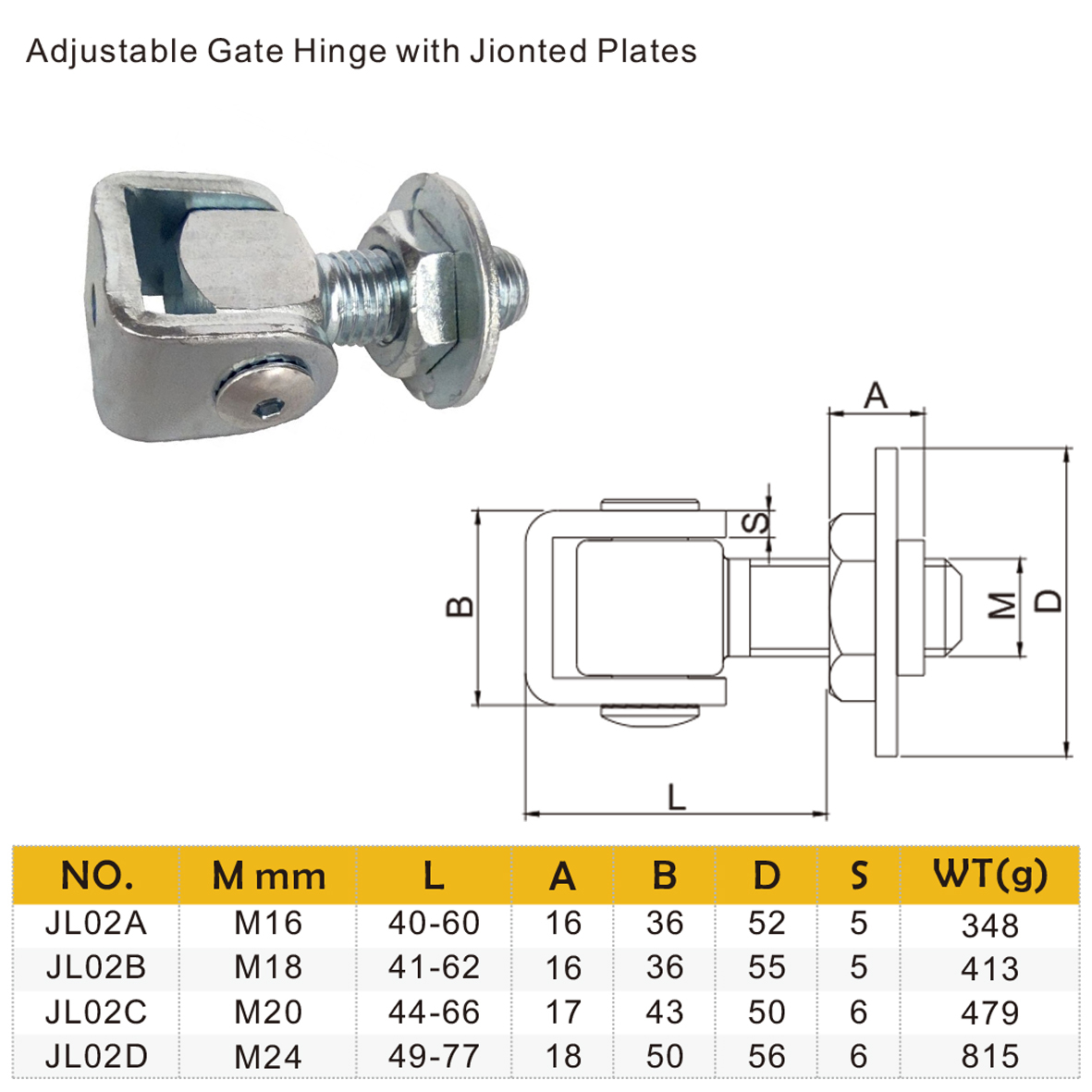 Петля 1 ступінь регулювання, M18 (JL02F) для воріт — міцна металева петля з болтовим кріпленням, антивандальним фіксатором і можливістю відкривання до 180°. Забезпечує регулювання по висоті та глибині для зручного монтажу. Переваги: