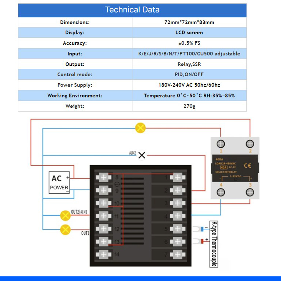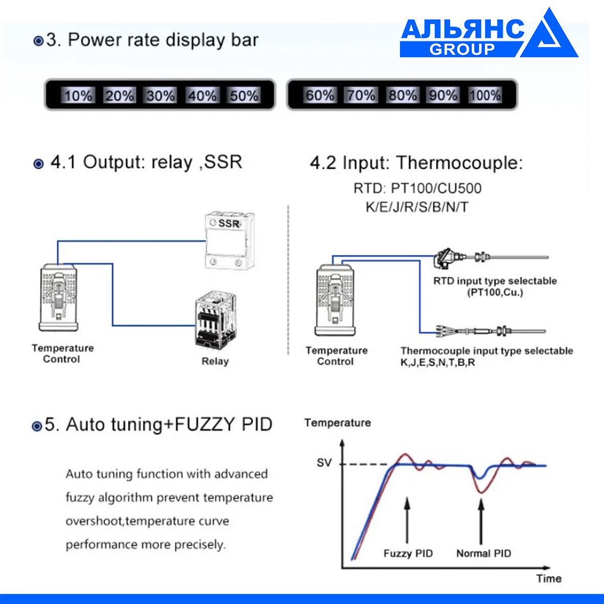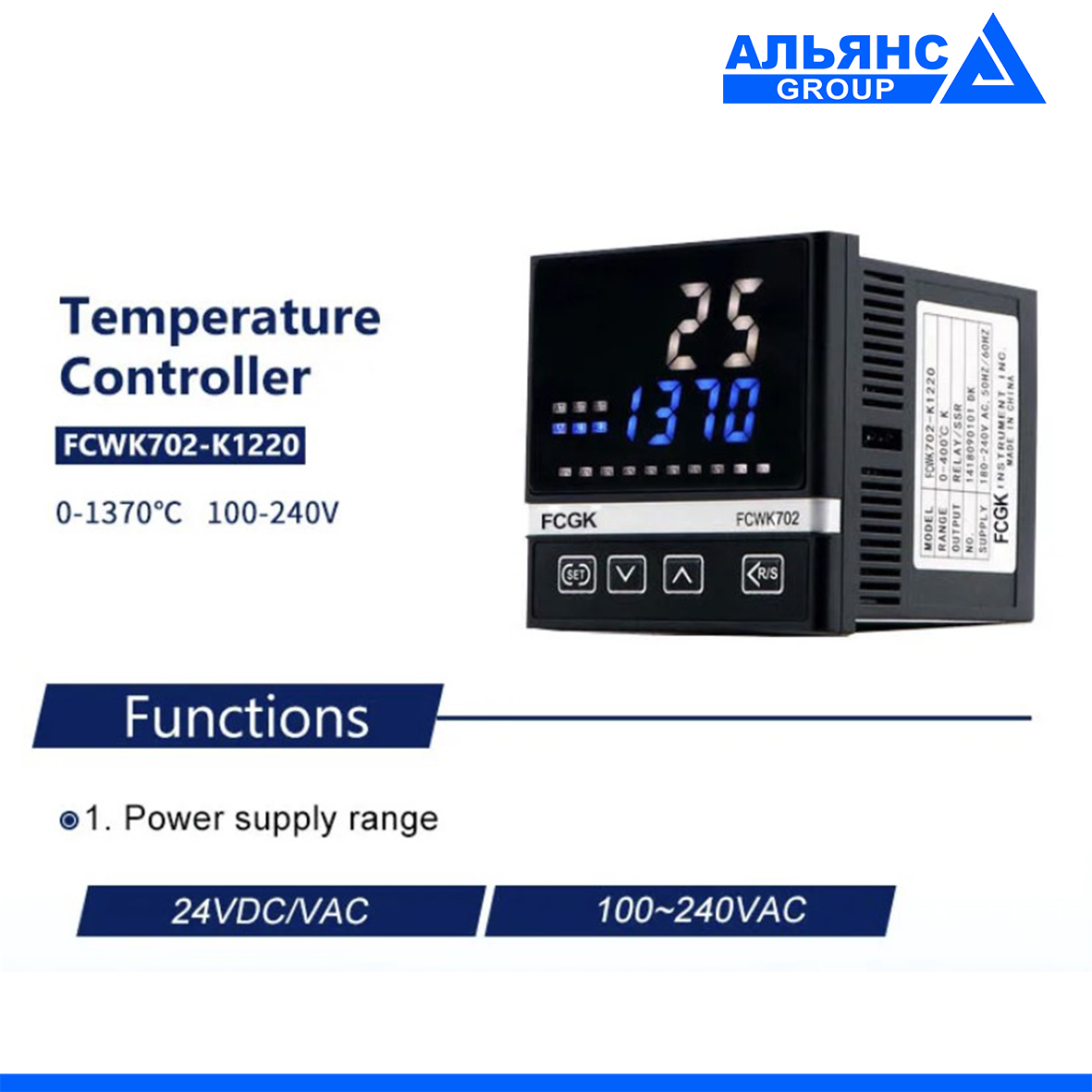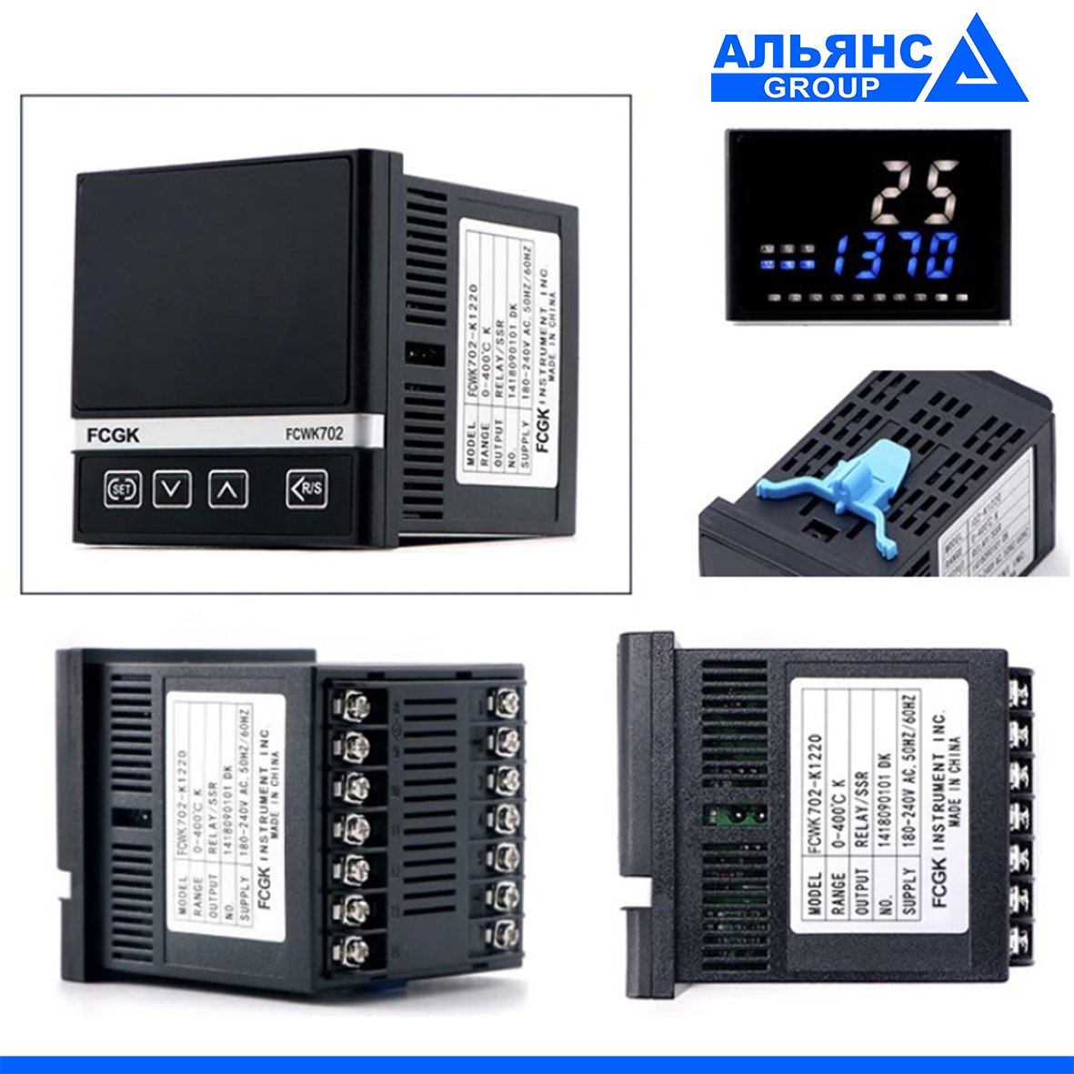 PID регулятори температури з широким набором функцій. Основні характеристики цифрового PID регулятора температури FCWK-702: - Яскравий LCD дисплей, IP65 панель - Входи rtd: pt100, cu50; tc: K, J, E, S, N, T, B, R - Виходи: 1 вихід SSR (DC) + 1 вихід реле - Наявність auto-tuning режиму - Живлення: 110-240v - Розмір : 72 мм × 72 мм. Корисне PDF Корисне відео