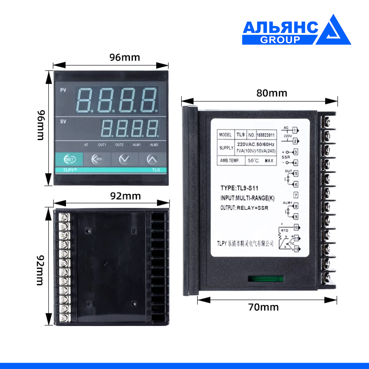 PID регулятори температури з широким набором функцій. Основні характеристики цифрового PID регулятора температури TL9-S11: - Живлення – 220 VAC. - Вихід – реле (сухі контакти) + SSR вихід DC для твердотільного реле. - Можна під'єднати наступні датчики та сигнали до універсального входу (K,E,J,T,S,R,B,N,PT100) або аналогового входу (4-20mA,DC 0-10v) - Широкий набір функцій для PID регулювання. - Можна вивести сигнал тривоги, коли відхилення, значення процесу, задане значення або змінене значення досягають заданого значення. - Розмір панелі 96 мм × 96 мм.