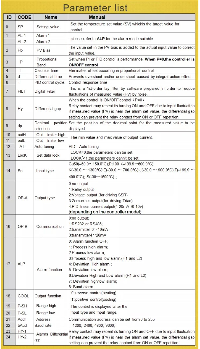 PID регулятори температури RAMP and SOAK KCM-9P2WGRS (9P2WARS) з таймером та широким набором функцій. Функції цифрового PID регулятора температури з часовими функціями набору, витримки температури та охолодження (RAMP and SOAK) 1. Можна під'єднати наступні датчики та сигнали до універсального входу (K,E,J,T,S,R,B,N,PT100) або аналогового входу (4-20mA,DC 0-10v). 2. Можна легко встановити оптимальні константи ПІД шляхом виконання AT (автоматичної настройки) за допомогою методу граничного циклу або режиму керування ON-OFF. 3. Можна вивести сигнал тривоги, коли відхилення, значення процесу, задане значення або змінене значення досягають заданого значення. 4. З будь-якою моделлю, яка підтримує комунікації, можна використовувати комунікації, Modbus-RTU 5. З будь-якою моделлю, яка забезпечує значення процесу передачі як вихід передачі від 4 до 20 мА або від 1 до 5 В. 6. Робота програмного керування дозволяє виконувати певні операції з контрольованим об'єктом шляхом програмування рівнів сегмента (встановленого значення сегмента) і відстеження виконання програми. 7. Системною одиницею часу можуть бути секунди або хвилини (максимум 9999 хвилин на сегмент) 8. Може бути виконано з «0» або з будь-якого сегмента. 9. Може бути виконано автоматично відразу після ввімкнення живлення. 10. Можна виконати або завершити з передньої панелі 11. Можна відновити після збою живлення. 12. Можна налаштувати на повторення після завершення програми 13. Може бути налаштований на СТОП після завершення програми Розмір панелі 160x80мм
