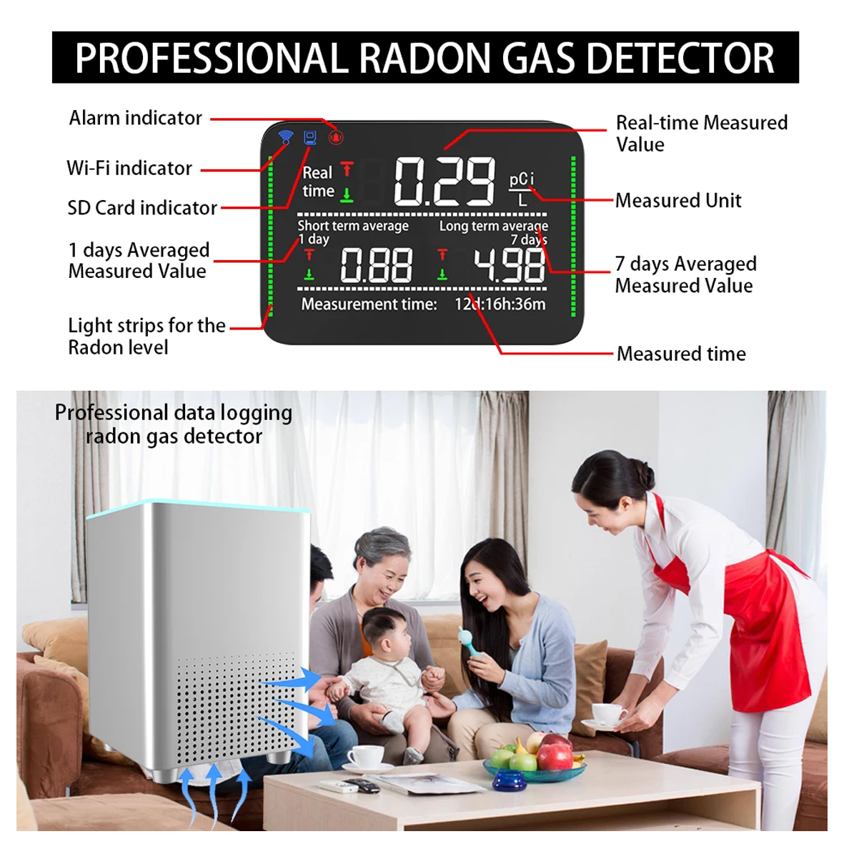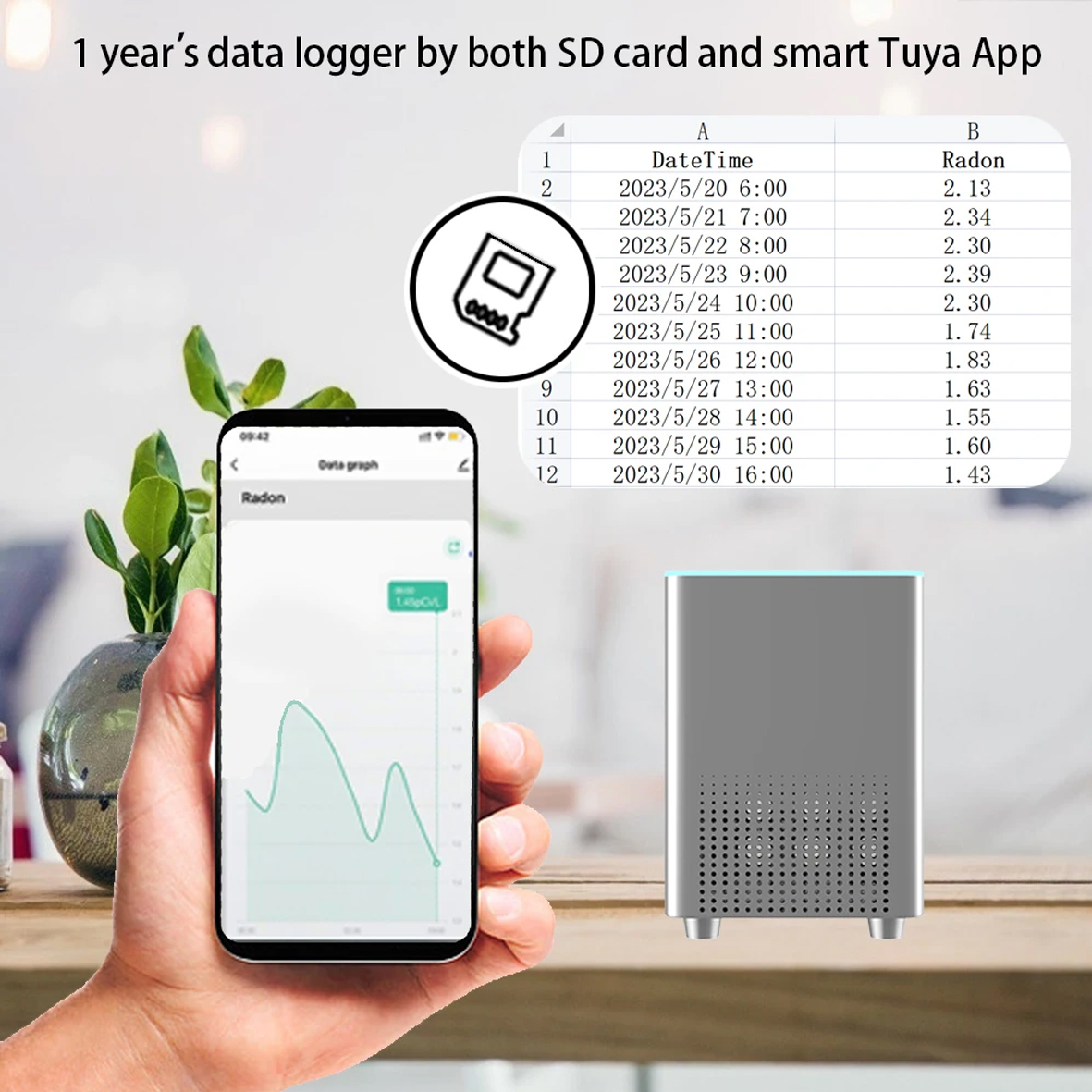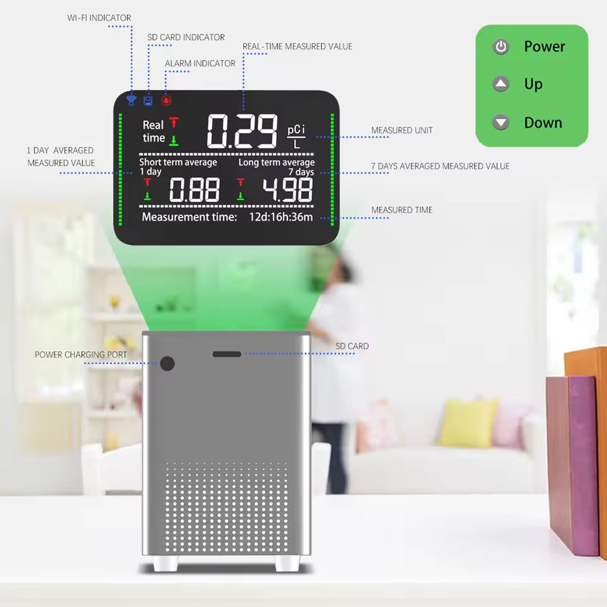 Найновіший за функціоналом SMART пристрій для вимірювання концентрації радону в усіх типах приміщень. Підходить як для побутового, так і для професійного моніторингу. Дозволяє контролювати концентрацію радону як в швидкому періоді (протягом 1-7днів), так і в тривалому (моніторинг може тривати роками). Особливістю пристрою є можливість підключення до мережі інтернету через вбудований модуль WiFi, за допомогою чого вся інформація передається на хмарний сервер. Користувач за допомогою популярного додатку Tuya або SmartLife на своєму смартфоні може в онлайн режимі контролювати результати вимірювань, проглядати діаграми змін концентрації радону, управляти налаштуваннями пристрою, встановлювати рівні для сигналізації підвищеного та високого рівнів концентрації радону. Дані моніторингу також зберігаються на SD карті, яка підключається до вбудованого слоту пристрою. Прибор має кольоровий дисплей, на який виводиться вся інформація щодо моніторингу, а також різнокольорову підсвітку корпусу, яка змінює колір (зелений, жовтий, червоний) в залежності від виявленої концентрації радону.