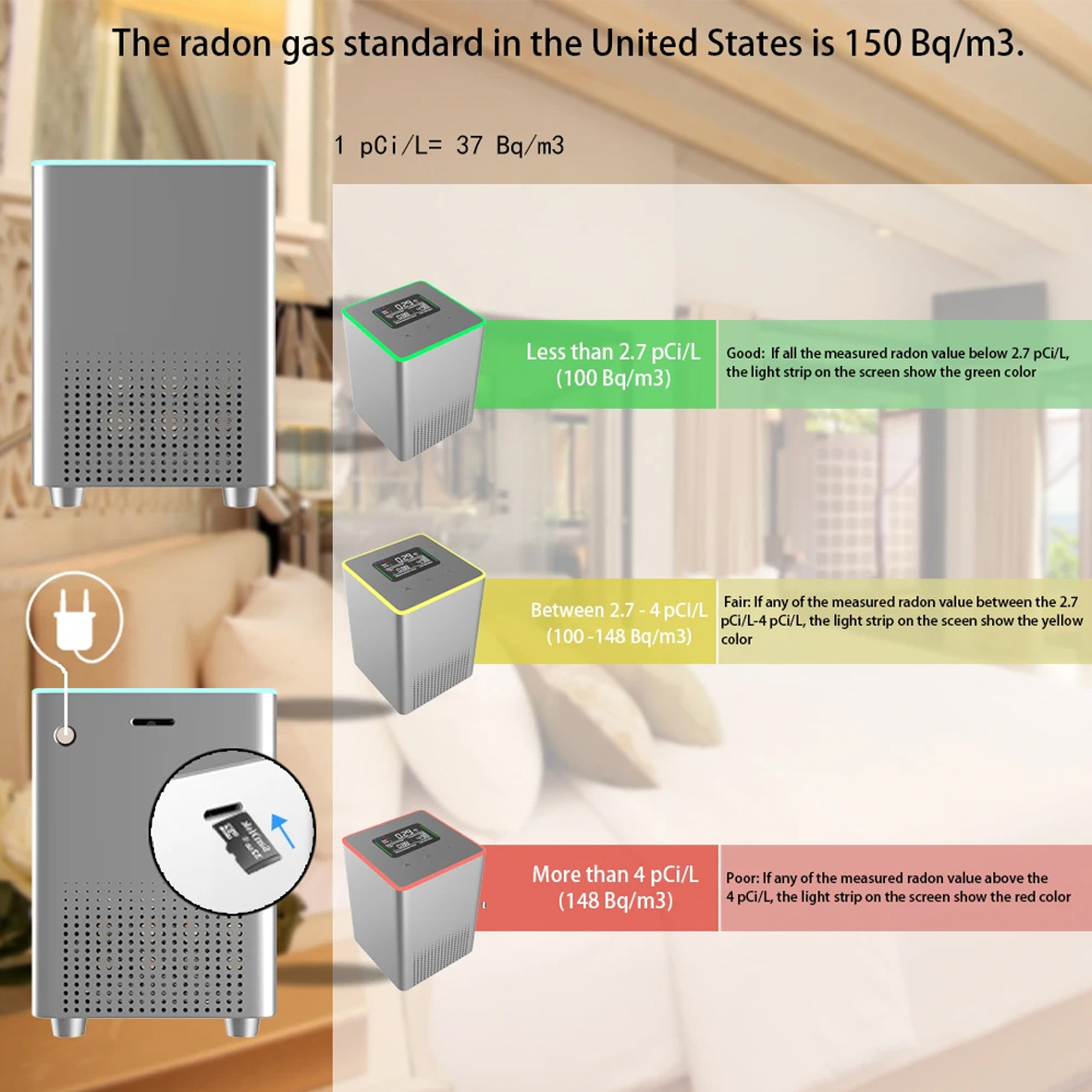 Радон , невидимий радіоактивний газ без запаху та потенційно шкідливий, викликає серйозне занепокоєння через його науково доведений зв’язок із раком легенів . Вплив радону зазвичай кількісно виражається в беккерелях на кубічний метр (Бк/м³). Однак у Сполучених Штатах загальновживаною одиницею вимірювання є пікокюрі на літр (pCi/L). 1 pCi/L дорівнює 37 Бк/м3.