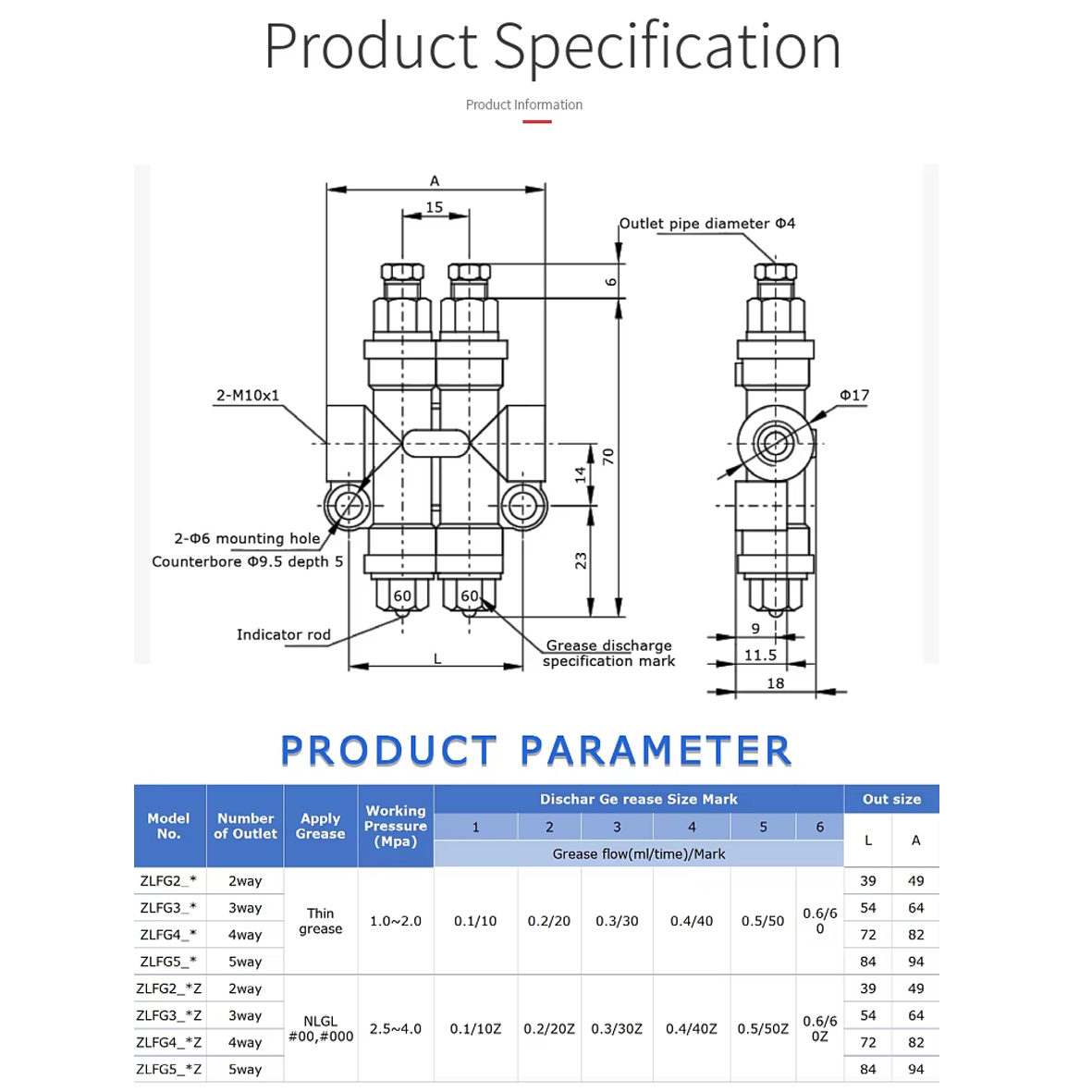 Прогресивний розподільник моделі ZLFG2-11 призначений для систем централізованого змащування рідким мастилом. Забезпечує послідовну подачу мастила на два виходи, що дозволяє рівномірно змазувати дві точки споживання. Працює за принципом прогресивного розподілу — подача мастила на кожен наступний вихід здійснюється після повного проходження мастила через попередній. Характеристики: