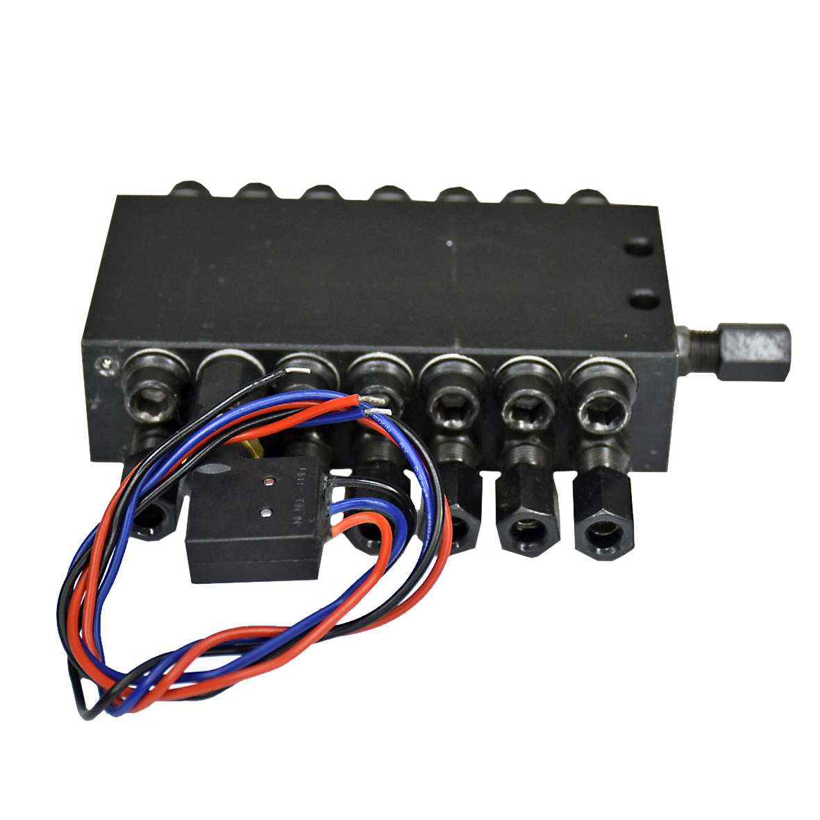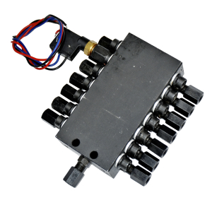 - Корпус розподільника (чорний або оцинкований блок) містить поршні, що послідовно подають мастило.