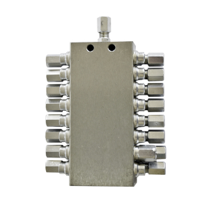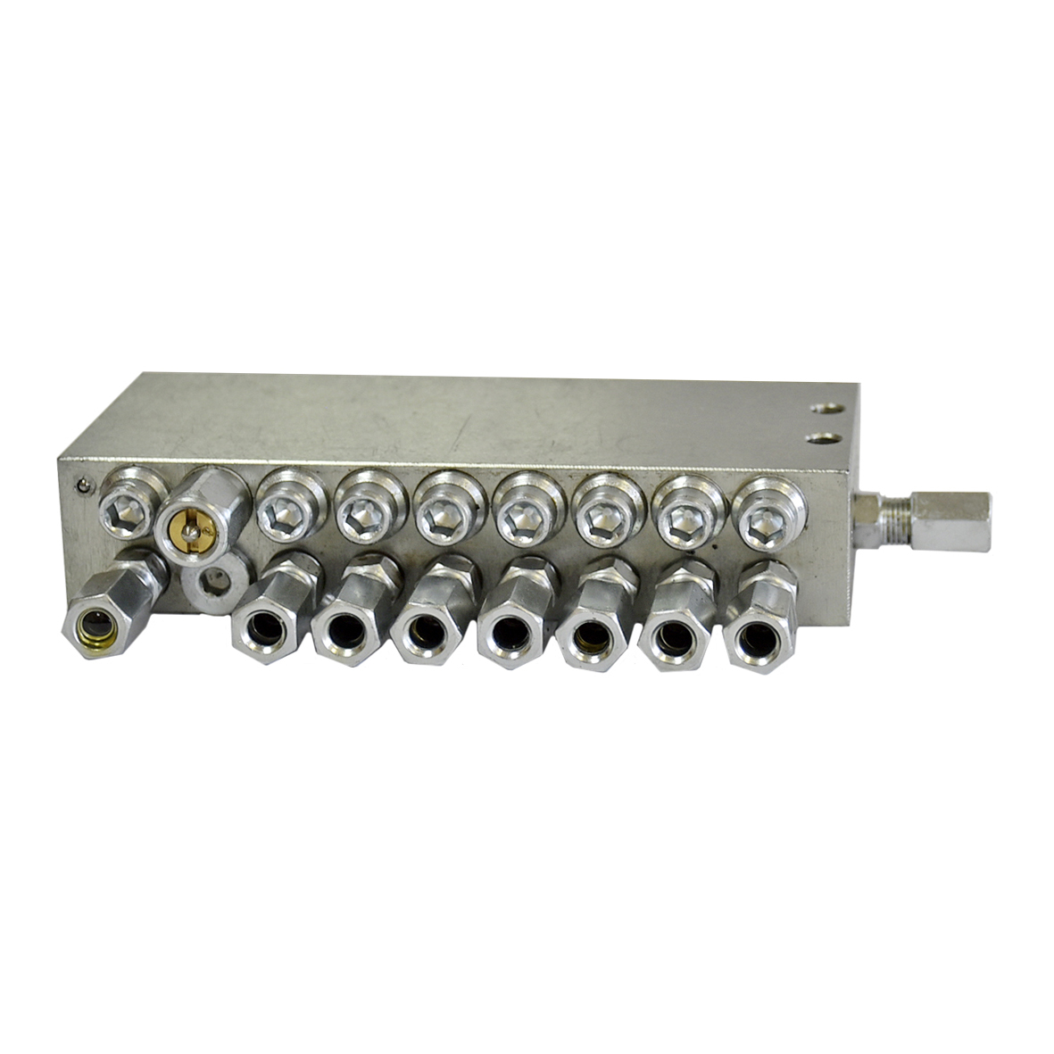 - Корпус розподільника (чорний або оцинкований блок) містить поршні, що послідовно подають мастило.