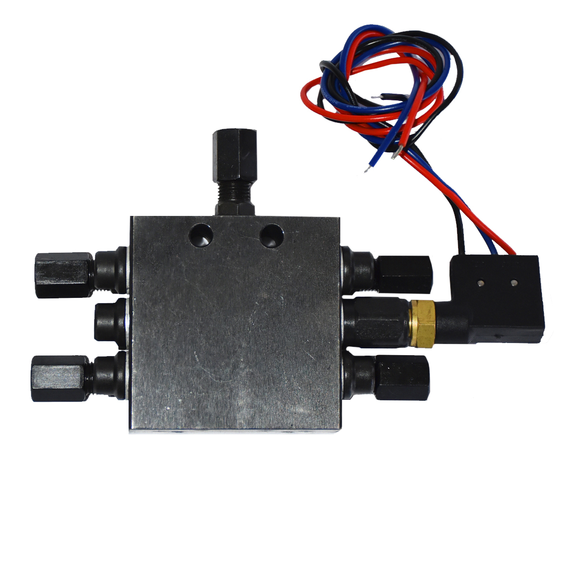 - Корпус розподільника (чорний або оцинкований блок) містить поршні, що послідовно подають мастило.