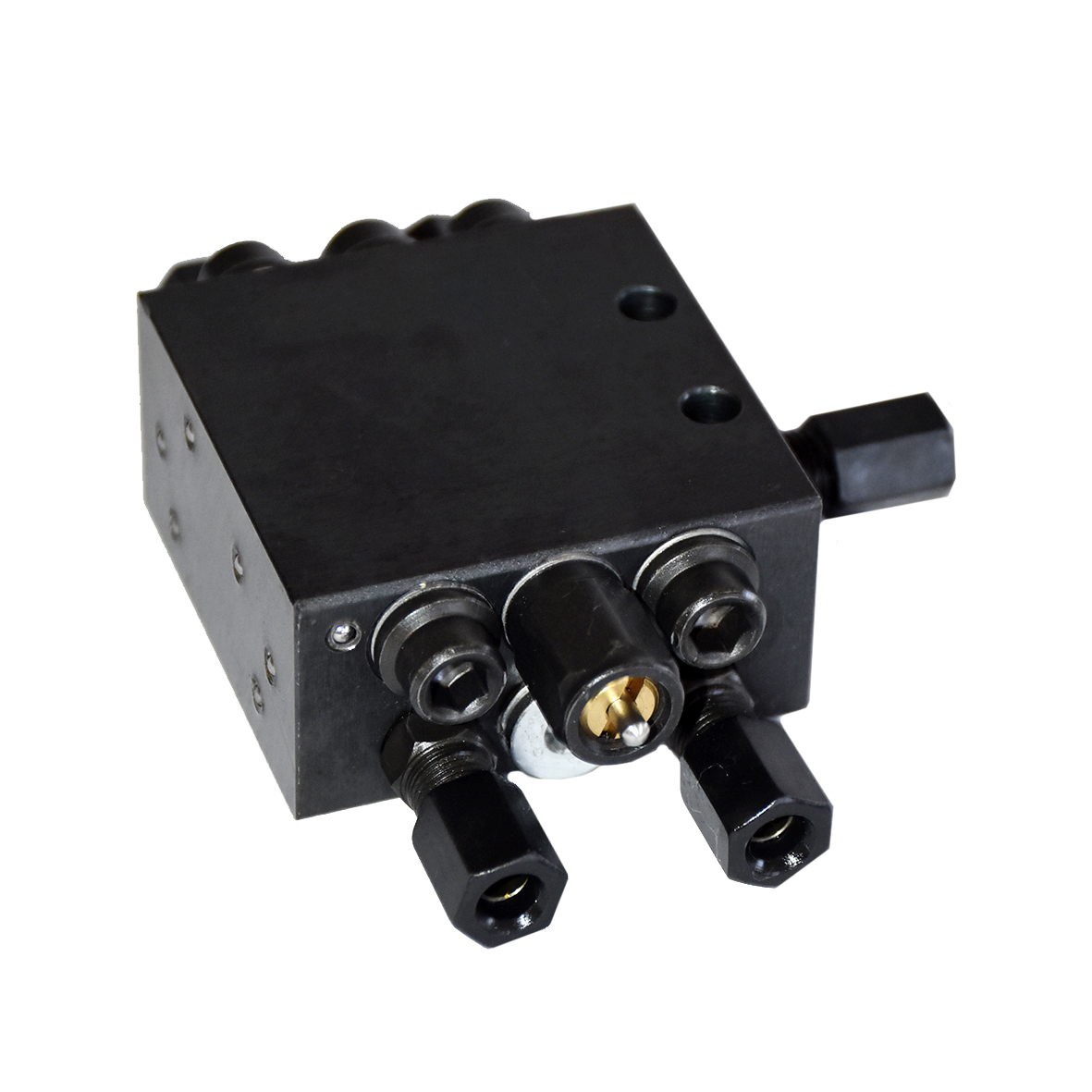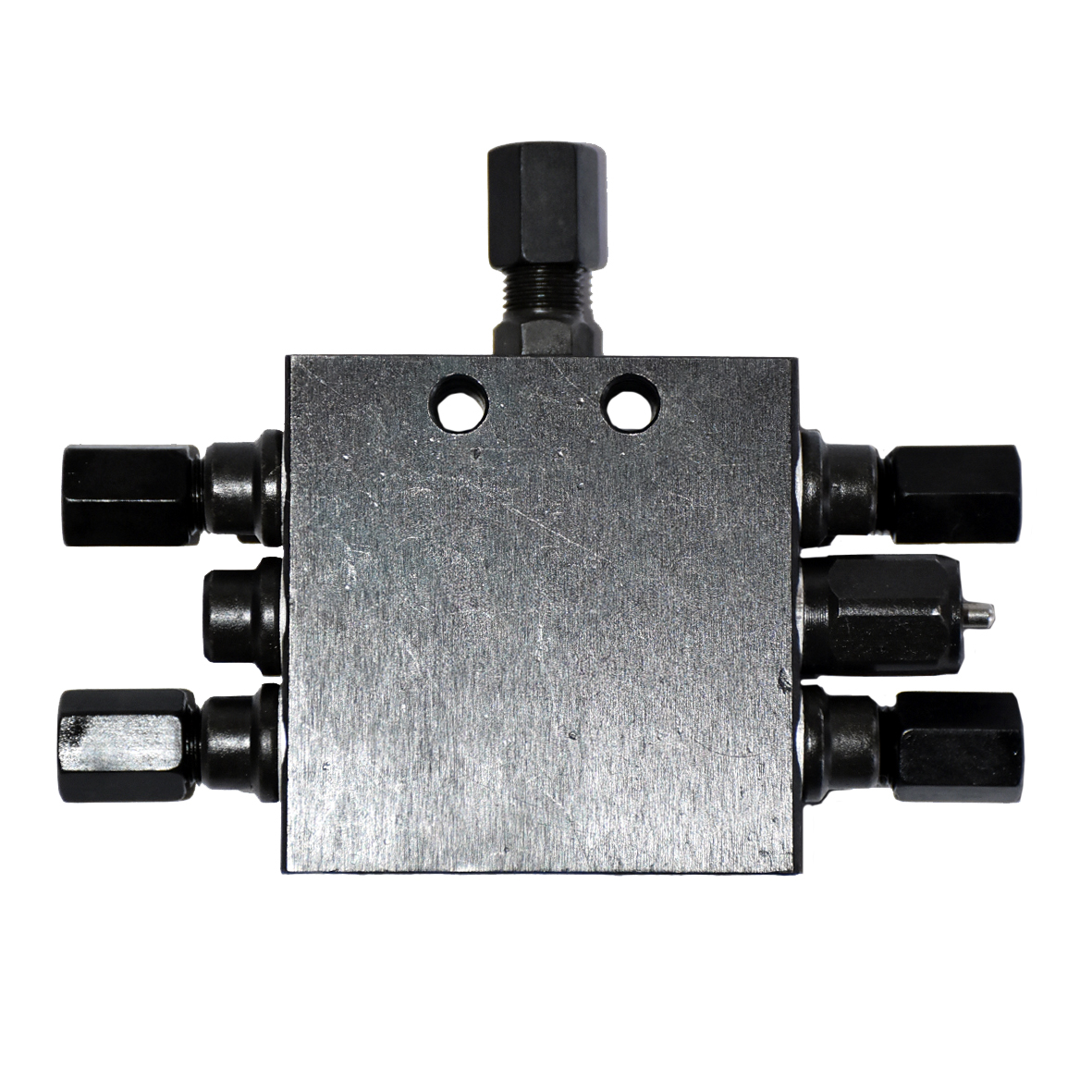 - Корпус розподільника (чорний або оцинкований блок) містить поршні, що послідовно подають мастило.