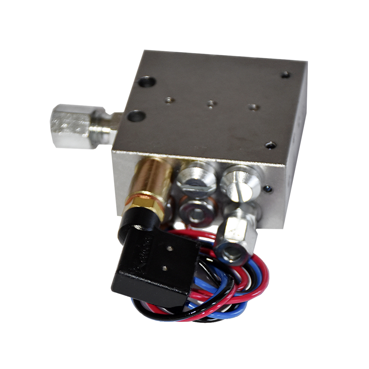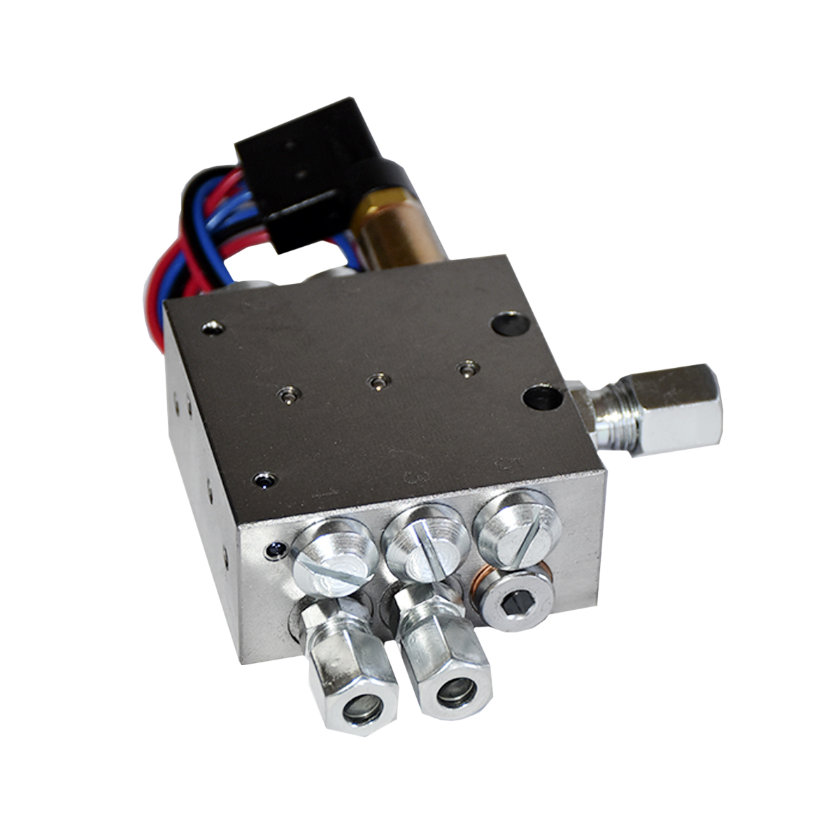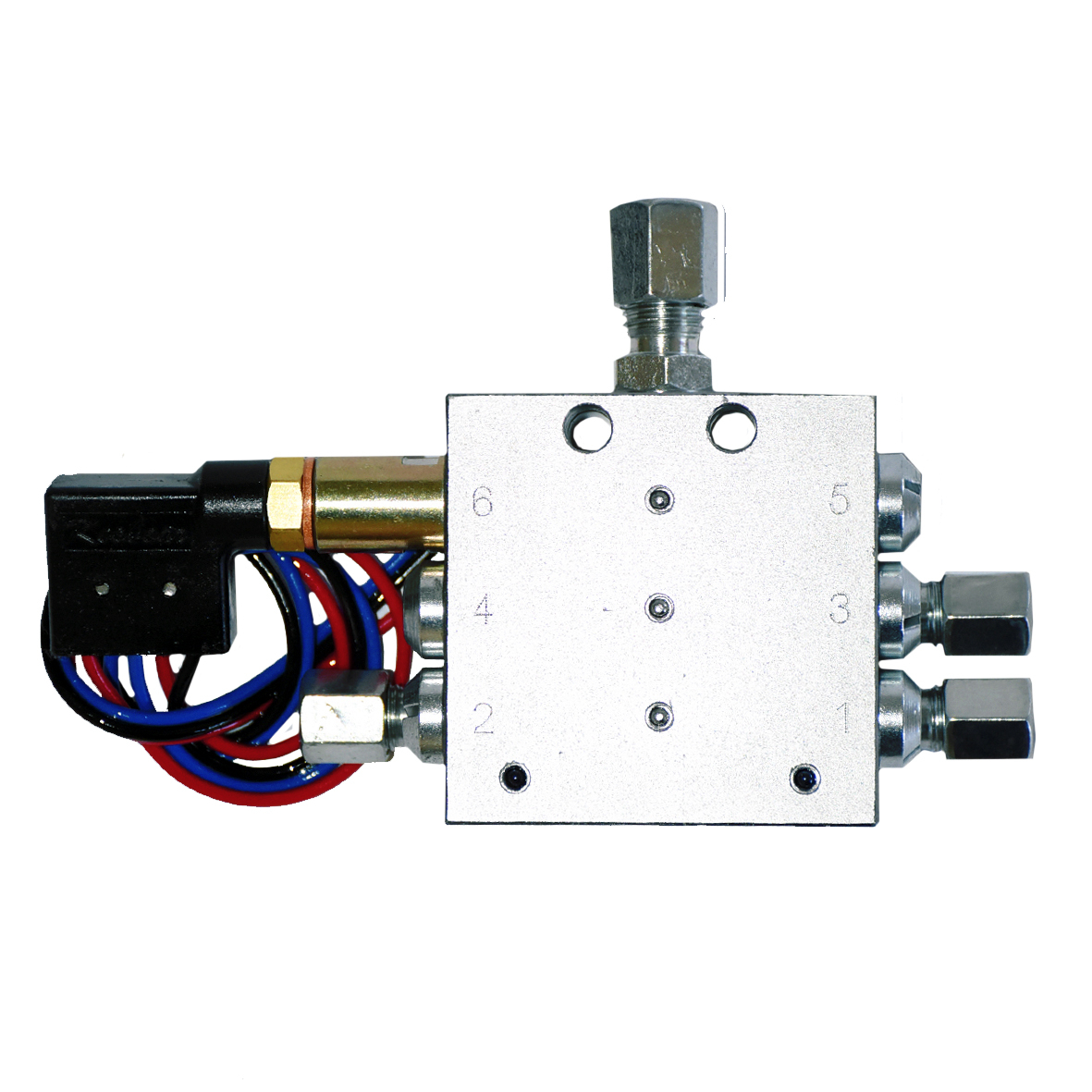 - Корпус розподільника (чорний або оцинкований блок) містить поршні, що послідовно подають мастило.