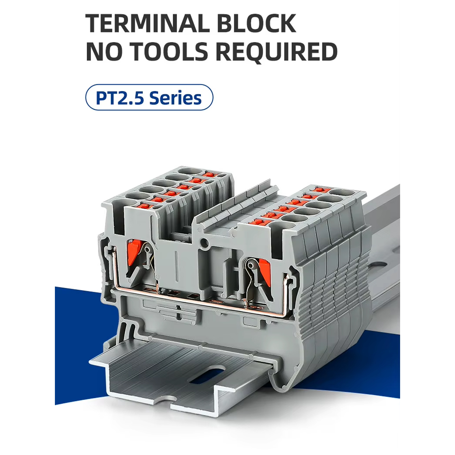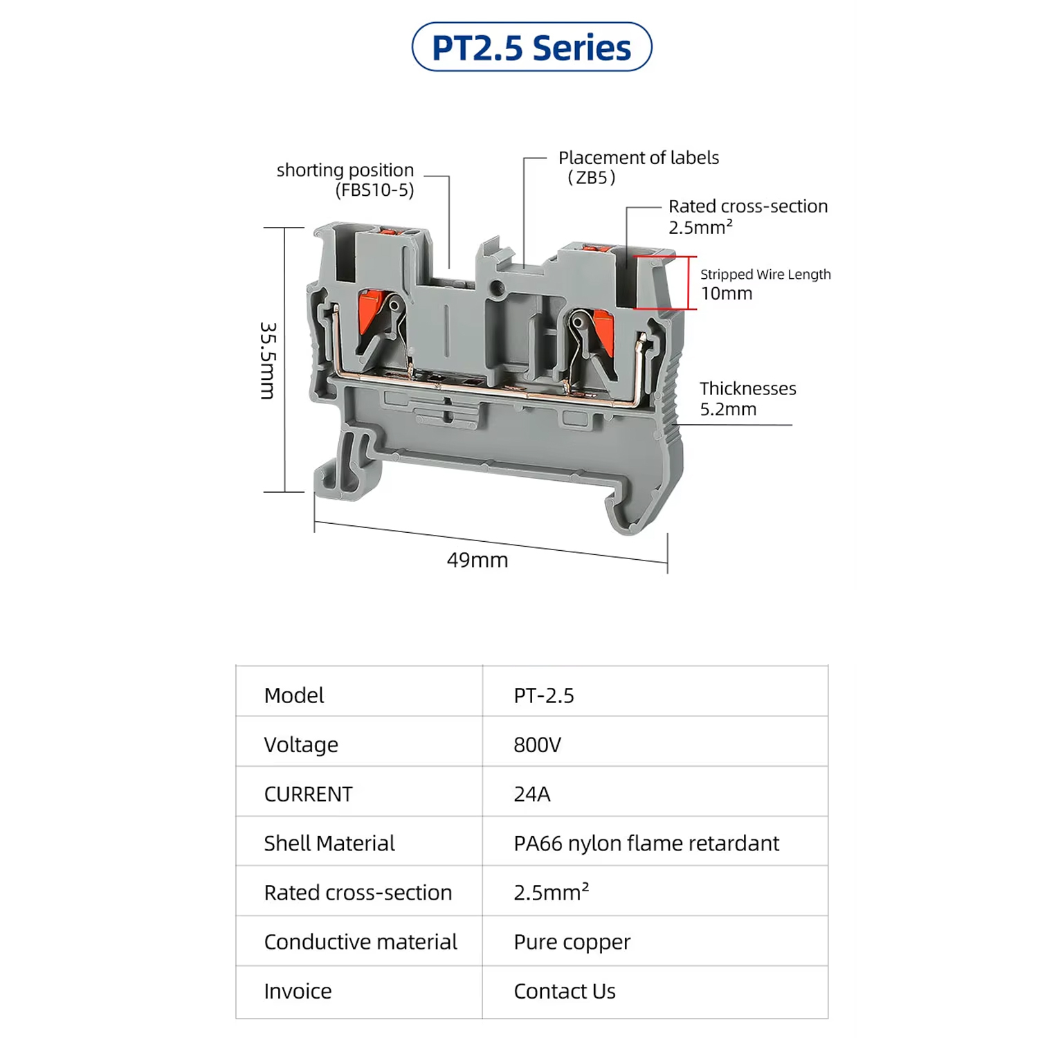 Прохідна клема PT 2.5 (1-рівнева) — призначена для надійного з’єднання та розподілу електричних провідників перерізом до 2,5 мм². Забезпечує стабільний контакт, зручний монтаж на DIN-рейку та компактне розміщення в електрощитах. Підходить для використання в промислових і побутових електромонтажних системах.