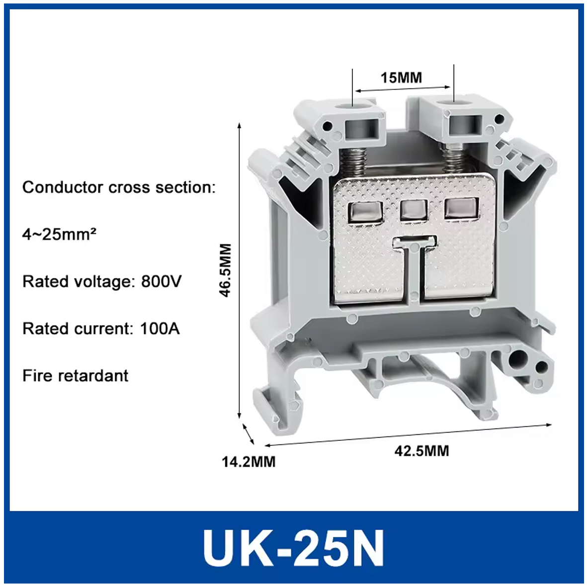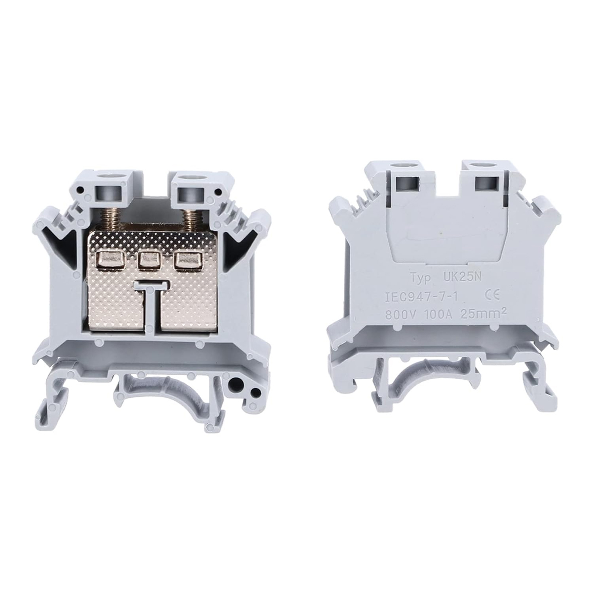 UK-25N — це високоякісна прохідна клема, призначена для надійного з'єднання провідників у розподільчих щитах та промислових автоматизованих системах. Монтується на стандартну DIN-рейку, забезпечуючи зручність інсталяції та стабільний електричний контакт. Технічні характеристики: