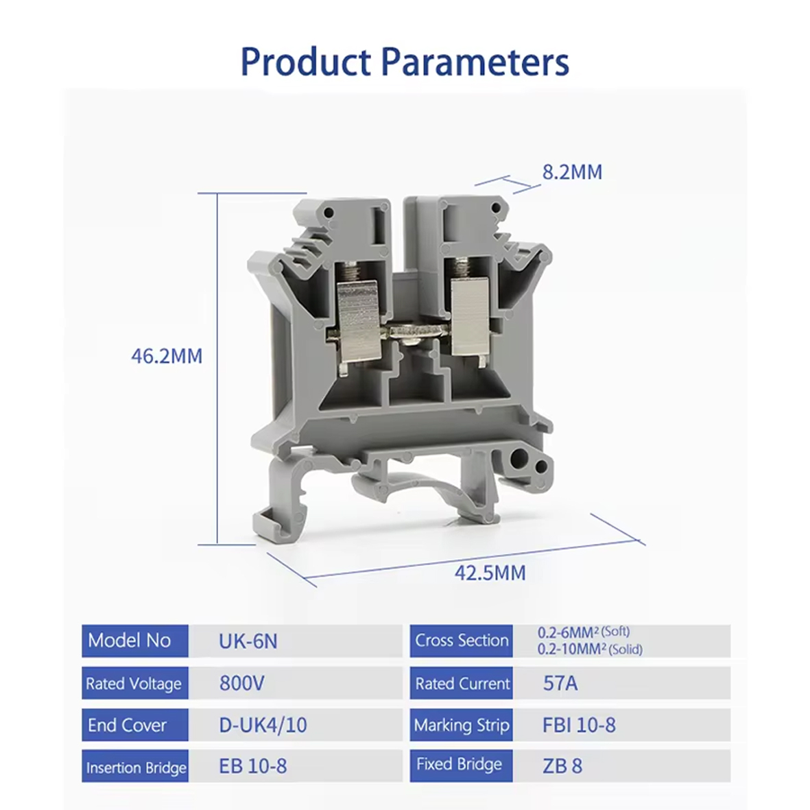 UK-6N – це надійна прохідна клема, призначена для монтажу на DIN-рейку. Вона забезпечує просте та безпечне з'єднання одножильних та багатожильних провідників перерізом до 6 мм². Ідеально підходить для використання в розподільчих щитах, автоматизованих системах управління, електрощитах тощо. Основні характеристики: