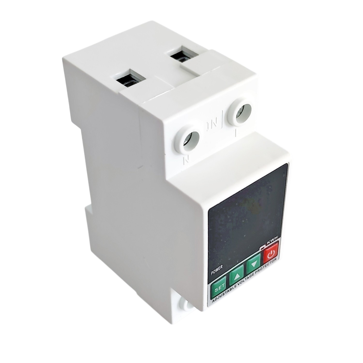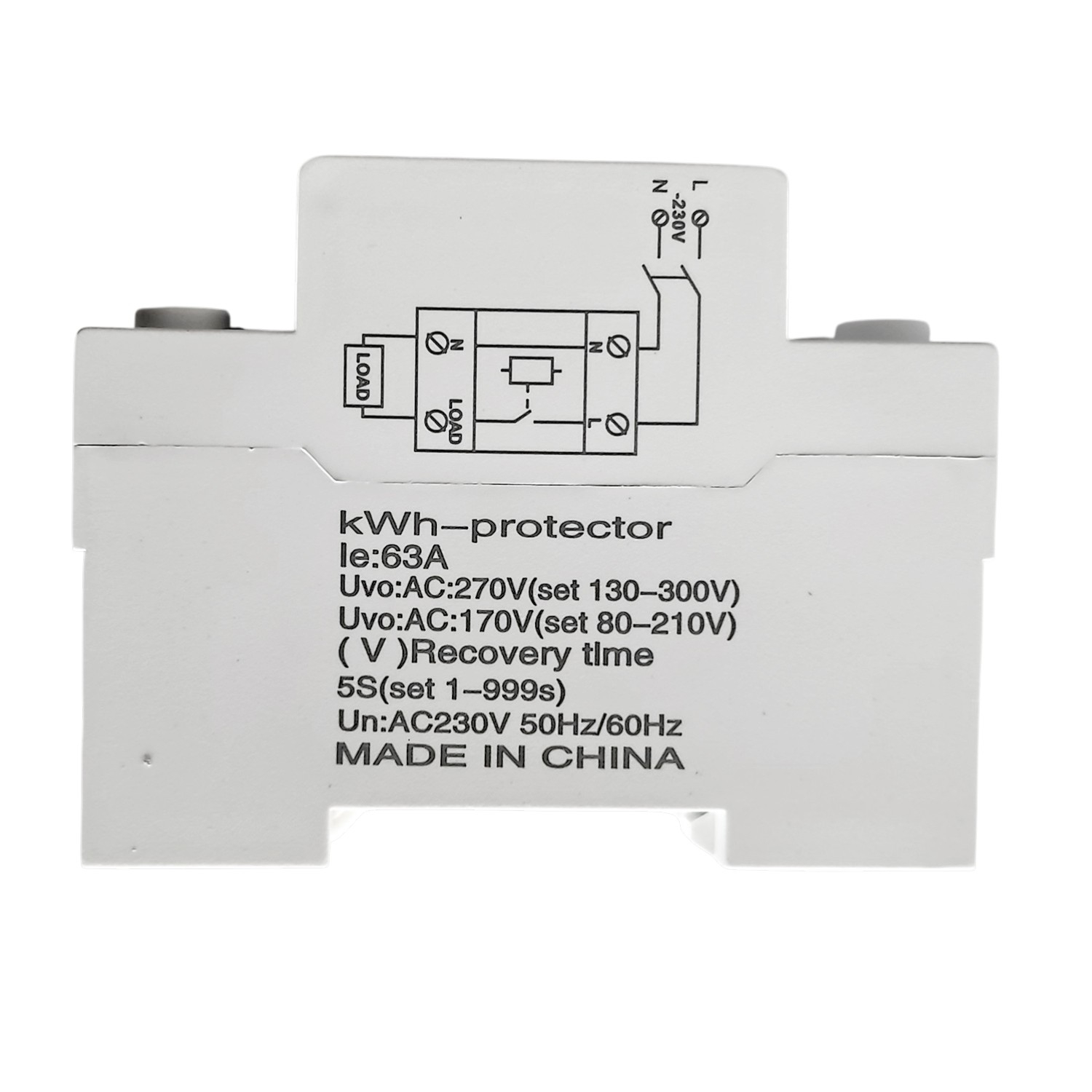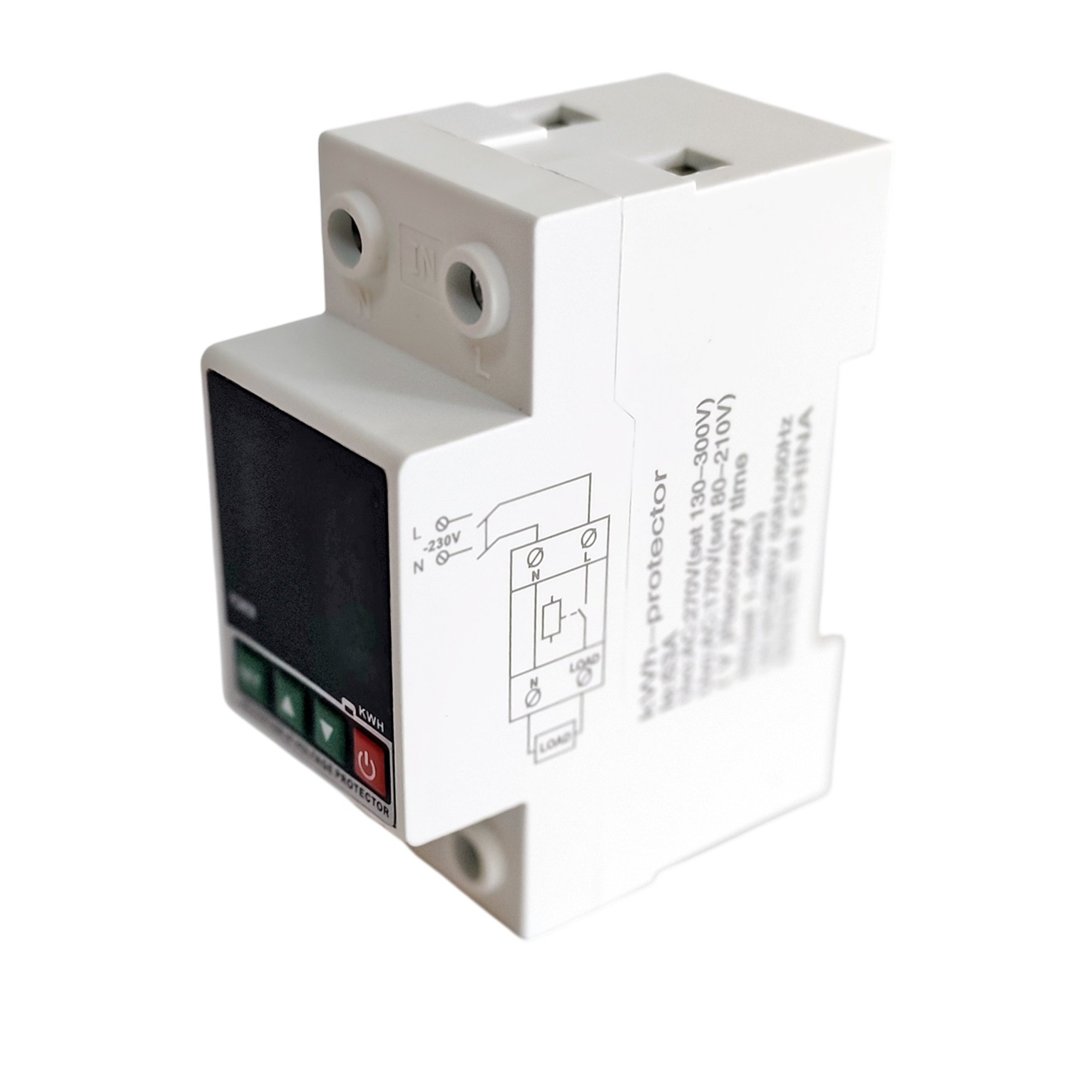 Реле захисту електроживлення використовується для повного контролю параметрів електросистеми по вхідній напрузі, струму(току) і частоті. Може використовуватись як для побутових, так і для промислових споживачів. Пристрій має потужну контактну групу, яка дозволяє без додаткових реле (пускачів/контакторів) відмикати об’єкт електроживлення від мережі в разі відхилення від мінімальної/максимальної вхідної напруги або відхилення від мінімальної/максимальної сили струму. Контролер захисту електроживлення має цифровий дисплей, на якому відображаються поточні значення напруги і сили струму в мережі. Реле має простий інтерфейс, за допомогою якого можна налаштувати значення мінімальної/максимальної вхідної напруги або мінімальної/максимальної сили струму, часу перемикання, режиму запуску тощо. Параметри реле: Номінальна напруга живлення: AC220V Діапазон робочої напруги: AC80В~440В (Одна фаза) Номінальна частота: 50/60Гц Діапазон налаштування перенапруги (>В): 240В~300В Знижена напруга: 140В~210В Поточний: 1-63А Номінальна напруга: 400В Температура експлуатації: -55℃ ~55℃ Вологість: ≤ 50% при 40°C (без урахування конденсації) Температура зберігання: -30℃ ~70℃ Технічні параметри: Діапазон налаштувань Значення вимкнення при перенапрузі: 240В~300В Значення вимкнення при зниженій напрузі: 140В~210В Скидання часу затримки: 1с~300с Час затримки запуску: 1с~300с Технічна специфікація: 15А 25А 32А 40А 50А 63А Номінальний робочий струм: (В.А) 15 25 32 40 50 63 Максимальний робочий струм Imax: (А. протягом 10 хв) 25 30 40 50 60 80 Макс.потужність навантаження (кВт): 3,6 5,5 7 8,8 11 13,9