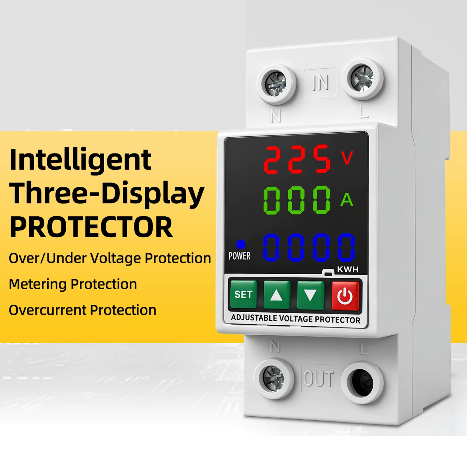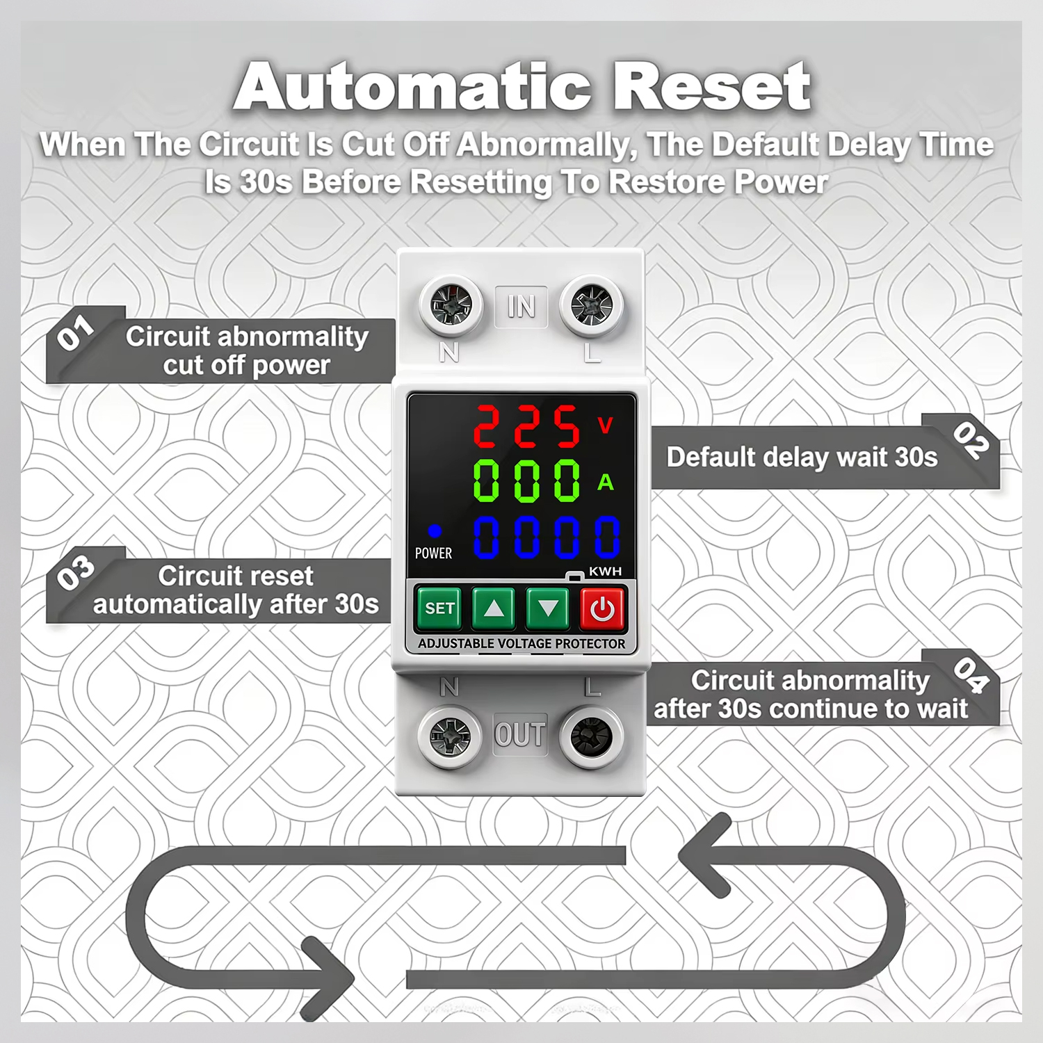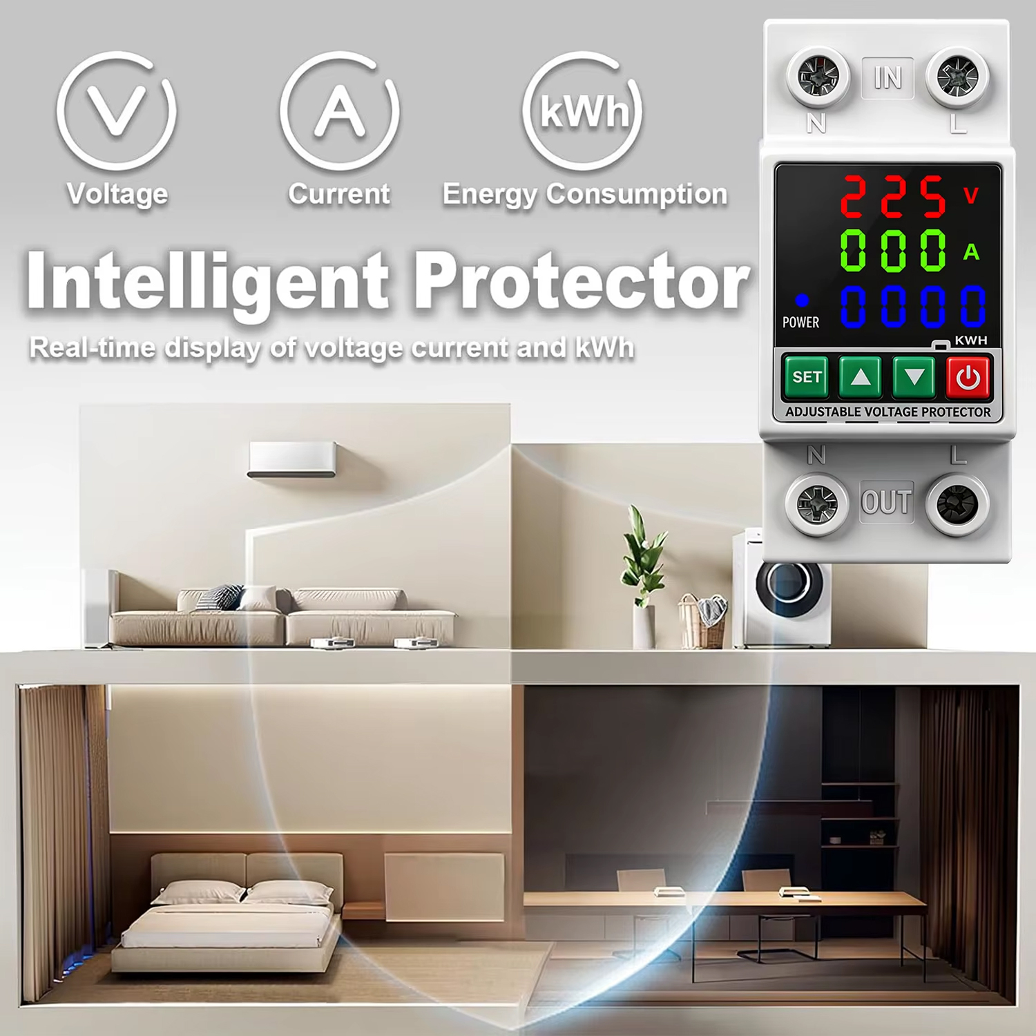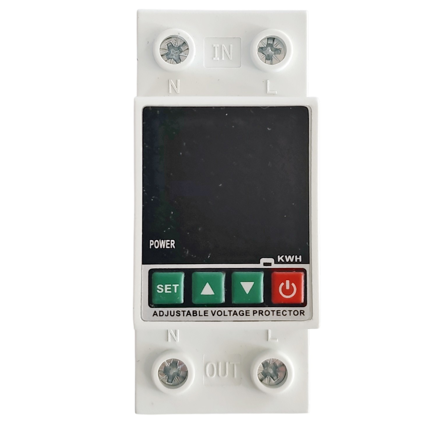 Реле захисту електроживлення використовується для повного контролю параметрів електросистеми по вхідній напрузі, струму(току) і частоті. Може використовуватись як для побутових, так і для промислових споживачів. Пристрій має потужну контактну групу, яка дозволяє без додаткових реле (пускачів/контакторів) відмикати об’єкт електроживлення від мережі в разі відхилення від мінімальної/максимальної вхідної напруги або відхилення від мінімальної/максимальної сили струму. Контролер захисту електроживлення має цифровий дисплей, на якому відображаються поточні значення напруги і сили струму в мережі. Реле має простий інтерфейс, за допомогою якого можна налаштувати значення мінімальної/максимальної вхідної напруги або мінімальної/максимальної сили струму, часу перемикання, режиму запуску тощо. Параметри реле: Номінальна напруга живлення: AC220V Діапазон робочої напруги: AC80В~440В (Одна фаза) Номінальна частота: 50/60Гц Діапазон налаштування перенапруги (>В): 240В~300В Знижена напруга: 140В~210В Поточний: 1-63А Номінальна напруга: 400В Температура експлуатації: -55℃ ~55℃ Вологість: ≤ 50% при 40°C (без урахування конденсації) Температура зберігання: -30℃ ~70℃ Технічні параметри: Діапазон налаштувань Значення вимкнення при перенапрузі: 240В~300В Значення вимкнення при зниженій напрузі: 140В~210В Скидання часу затримки: 1с~300с Час затримки запуску: 1с~300с Технічна специфікація: 15А 25А 32А 40А 50А 63А Номінальний робочий струм: (В.А) 15 25 32 40 50 63 Максимальний робочий струм Imax: (А. протягом 10 хв) 25 30 40 50 60 80 Макс.потужність навантаження (кВт): 3,6 5,5 7 8,8 11 13,9