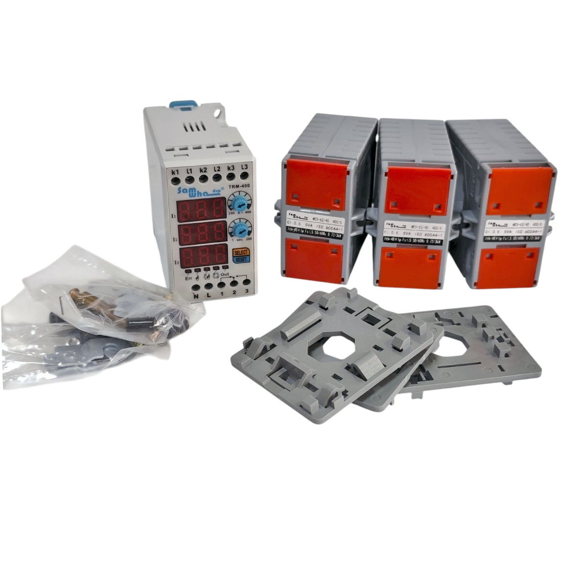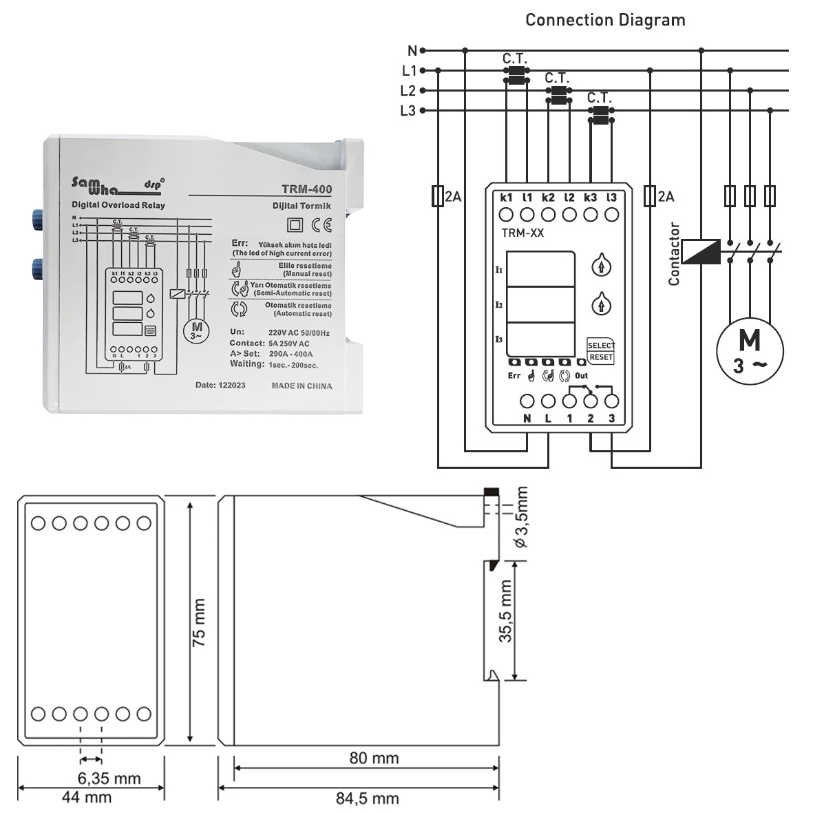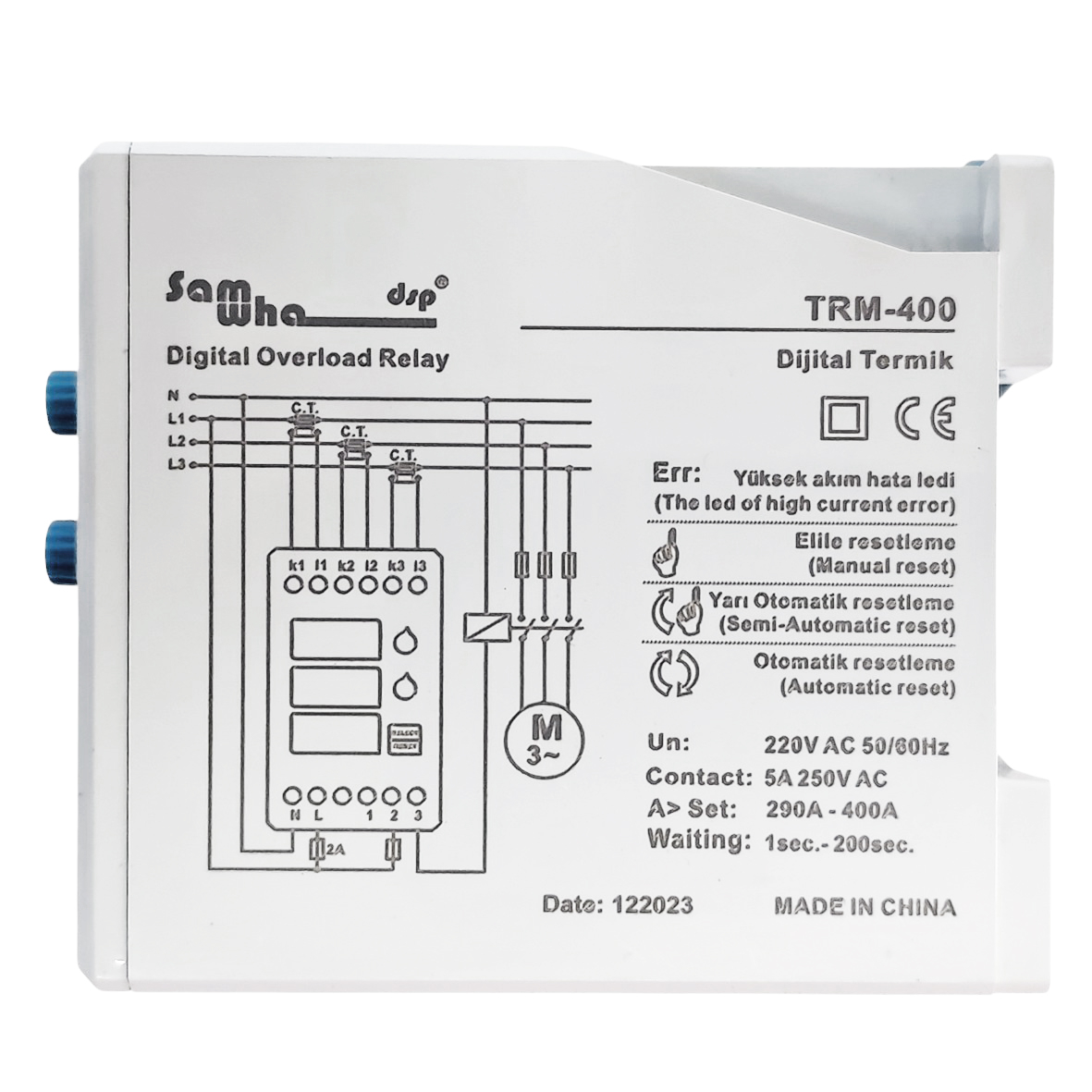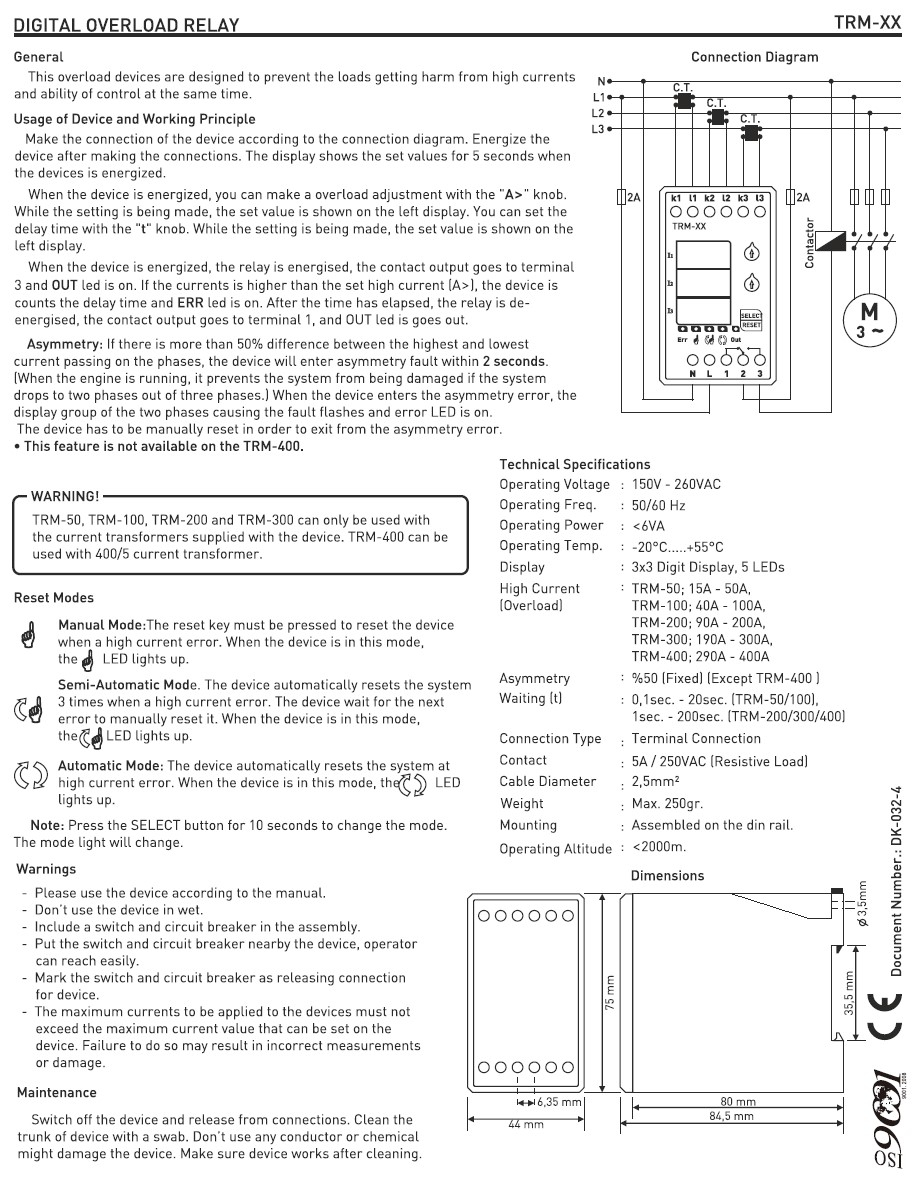 Реле захисту струму використовується для контролю параметрів електросистеми по струму. Реле призначено для запобігання та керування навантаженнями від пошкодження через високий струм, захищає від 50% асиметрії фіксованого струму, має регульований час затримки помилок. Режим роботи реле - автоматичний, напівавтоматичний, ручний, в комплект поставки входять трансформатори струму. На відміну від звичайних запобіжників або автоматичних вимикачів електронне реле захисту струму дозволяє точно задати числові параметри спрацювання по перевищенню струму (задається максимальний струм і час затримки зворотного включення), має числові індикатори поточної сили струму по кожній фазі, дозволяє після спрацювання автоматично повернутися до "робочого" положення, а також задати тимчасові параметри роботи системи. Реле струму має невеликі габарити порівняно з автоматами і легко встановлюється в будь яку систему управління. В реле реалізовано 3 програми повернення в "робочий" режим - РУЧНИЙ, НАПІВАВТОМАТ, АВТОМАТ. Параметри реле: Робоча напруга 150VAC - 260VAC Робоча частота 50/60 Гц Робоча потужність <6ВА Робоча температура -20°C ..... +55°C Цифровий дисплей 3х3-значний дисплей + 5 індикаторів-світлодіодів Діапазон налаштування струму перевантаження : ТРМ-25 0,1А – 25А ТРМ-50 15А - 50А ТРМ-100 40А - 1 ООА ТРМ-200 90А - 200А ТРМ-300 190А - 300А ТРМ-400 290А - 400А Захист по асиметрії фаз 50% фіксований, крім TRM-400 Діапазон регулювання часу очікування (т) : ТРМ-25/50/100 0,1сек. - 20сек. ТРМ-200/300/400 1,0сек. - 200сек. Тип підключення Клемне підключення Контакти 5A/ 250 В змінного струму (резистивне навантаження) Діаметр кабелю 2,5 мм.кв. Вага приблизно 250гр. Розміри цифрового блоку 44мм/75мм/84,5мм (ширина/висота/глибина)