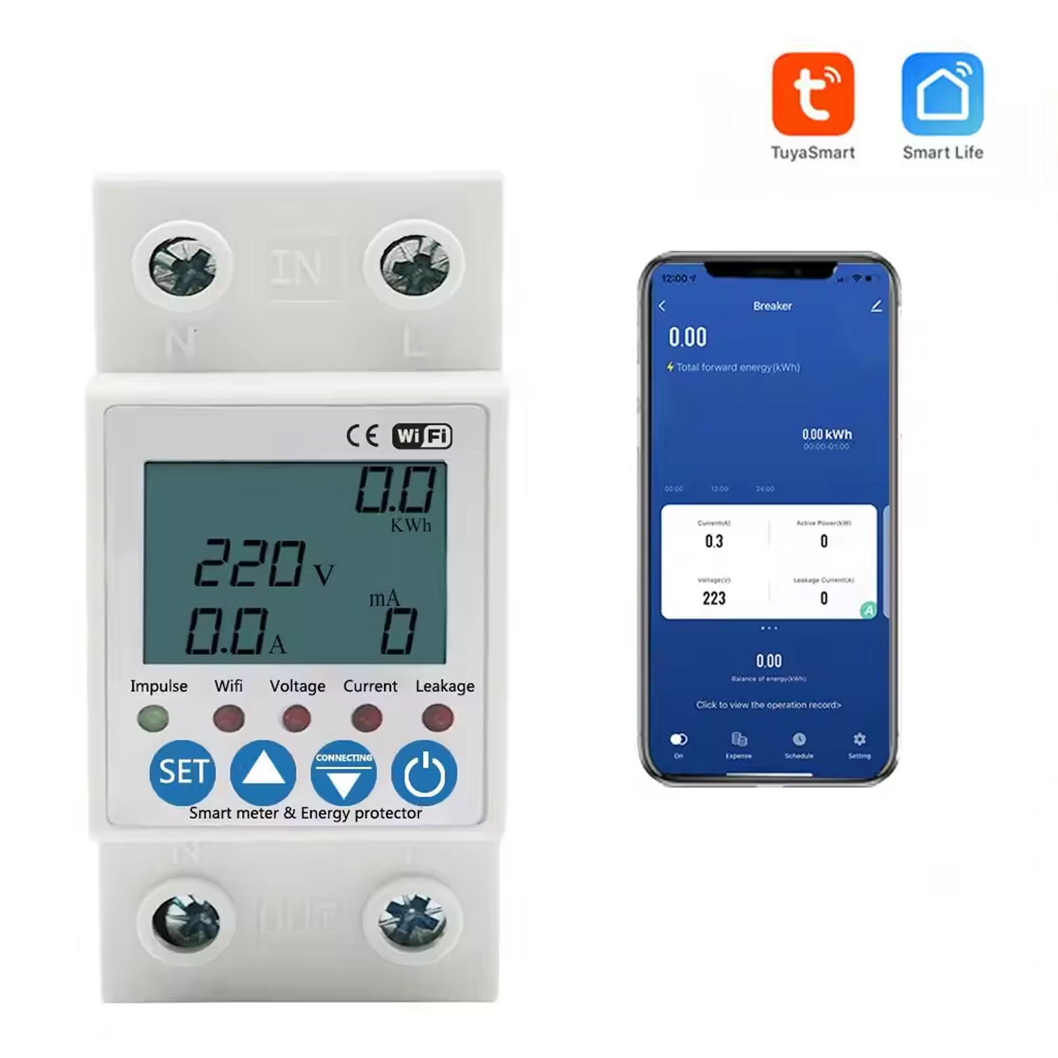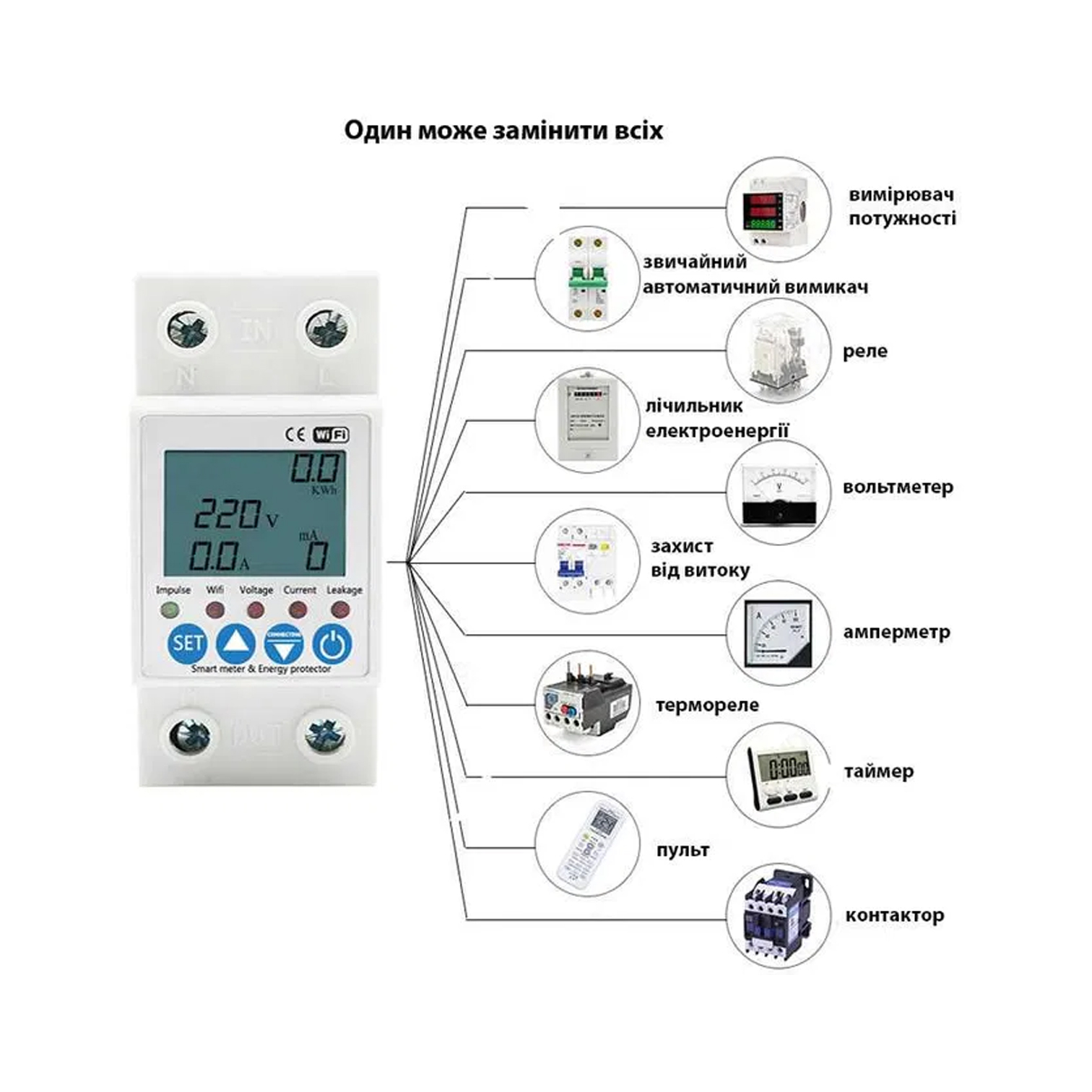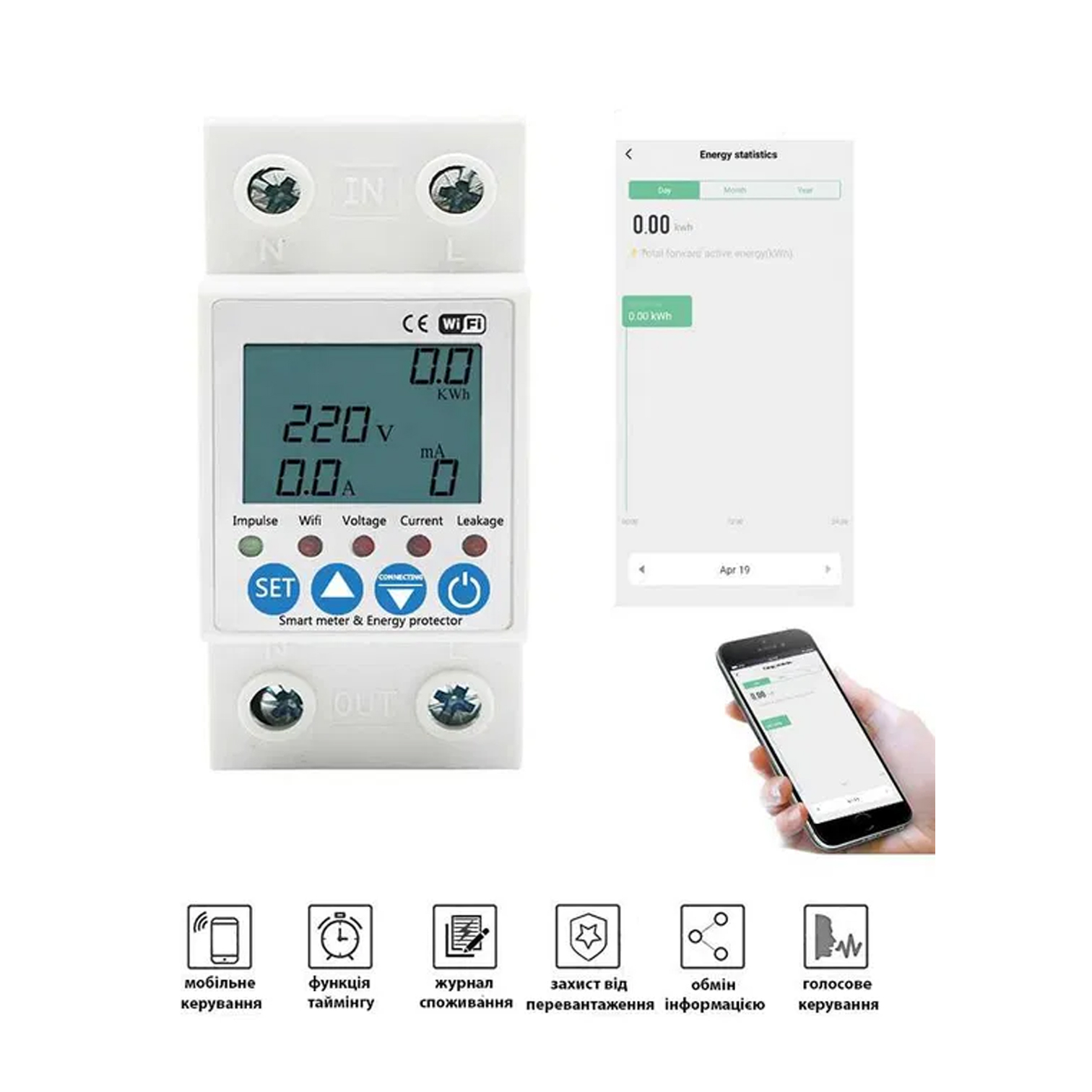 Розумний лічильник електроенергії 1ф 63А використовується для повного контролю параметрів і захисту електросистеми по вхідній напрузі (В), струму (А), витратам електроенергії (КВт*год), струму витоку (УЗО mA). Може використовуватись як для побутових, так і для промислових споживачів з одно фазною електромережею. За допомогою вбудованого модуля WiFi легко приєднується до бездротової мережі і передає всі параметри до хмари на сервері. Ці параметри зручно контролюються в будь який момент з мобільного додатку SmartLife або TuyaSmart.Додаток дозволяє: