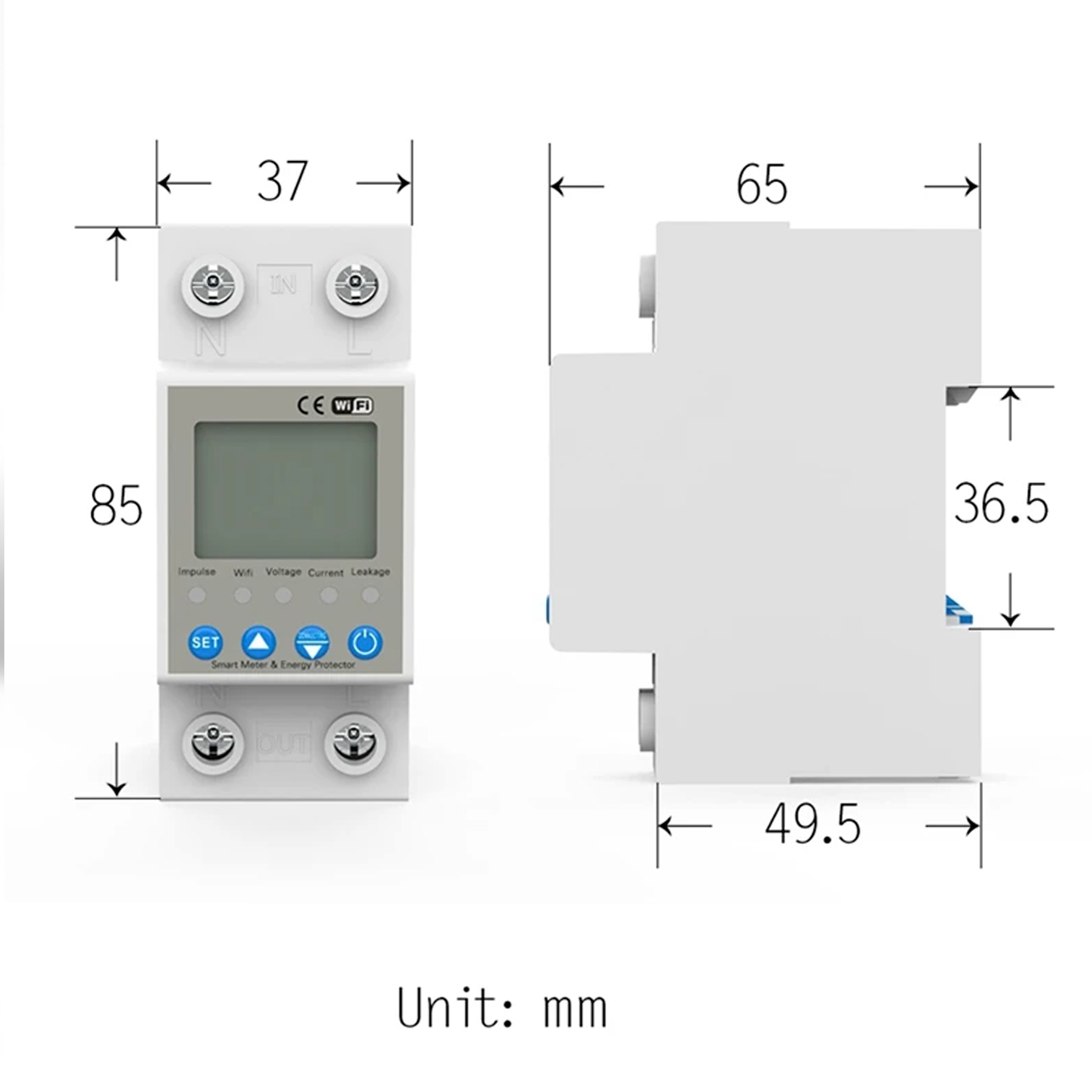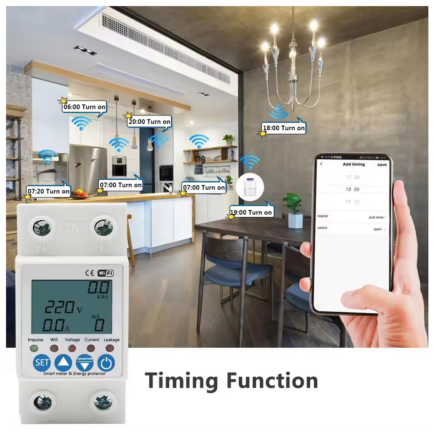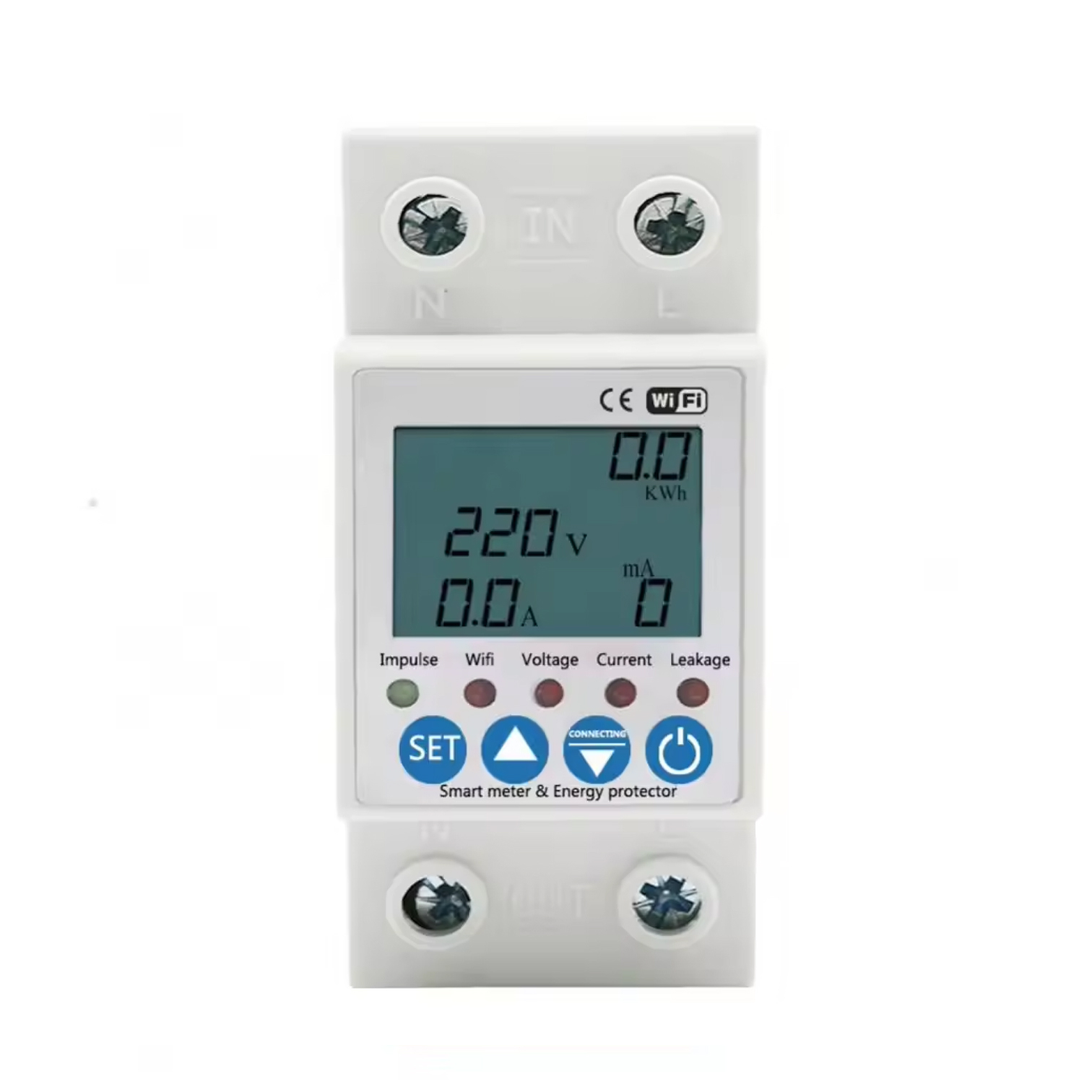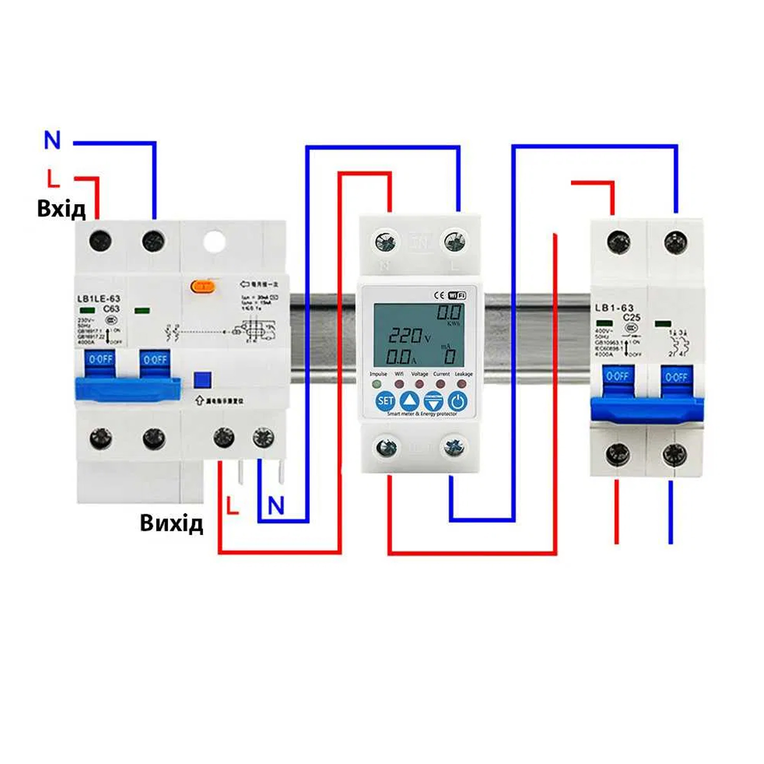 Розумний лічильник електроенергії 1ф 63А використовується для повного контролю параметрів і захисту електросистеми по вхідній напрузі (В), струму (А), витратам електроенергії (КВт*год), струму витоку (УЗО mA). Може використовуватись як для побутових, так і для промислових споживачів з одно фазною електромережею. За допомогою вбудованого модуля WiFi легко приєднується до бездротової мережі і передає всі параметри до хмари на сервері. Ці параметри зручно контролюються в будь який момент з мобільного додатку SmartLife або TuyaSmart.Додаток дозволяє: