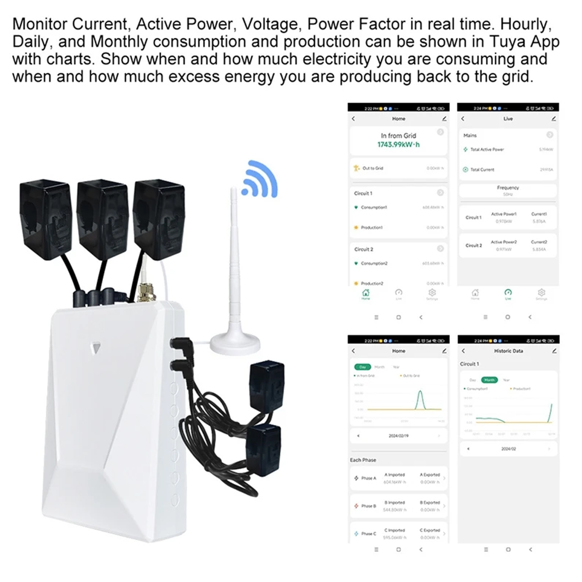 Розумний лічильник електроенергії використовується для повного контролю параметрів електросистеми по вхідній напрузі (В), струму (А) та витратам електроенергії (КВт*год) в 3-х фазних і однофазних (розділених по 3 фазам) електромережах. За допомогою додатку SmartLife або TuyaSmart можливо створювати різноманітні сценарії, алгоритми роботи, залежно від показників або параметрів лічильника для управління іншими пристроями в системі, оповіщення тощо. Основна особливість:
