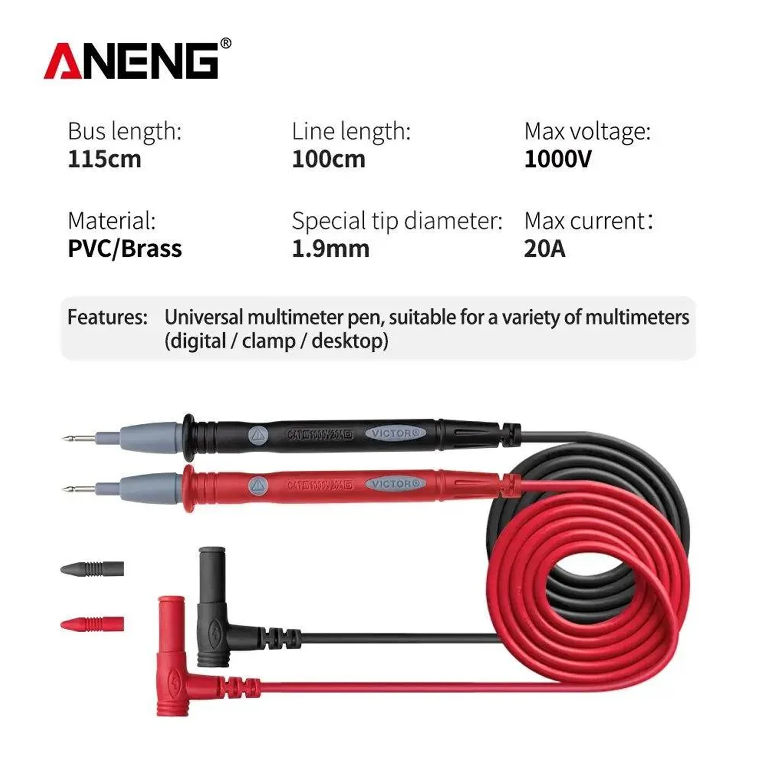 Щупи для тестера/мультиметра, 100см, 20А/1000V, PVC, нікельовані щупи, модель PT1003