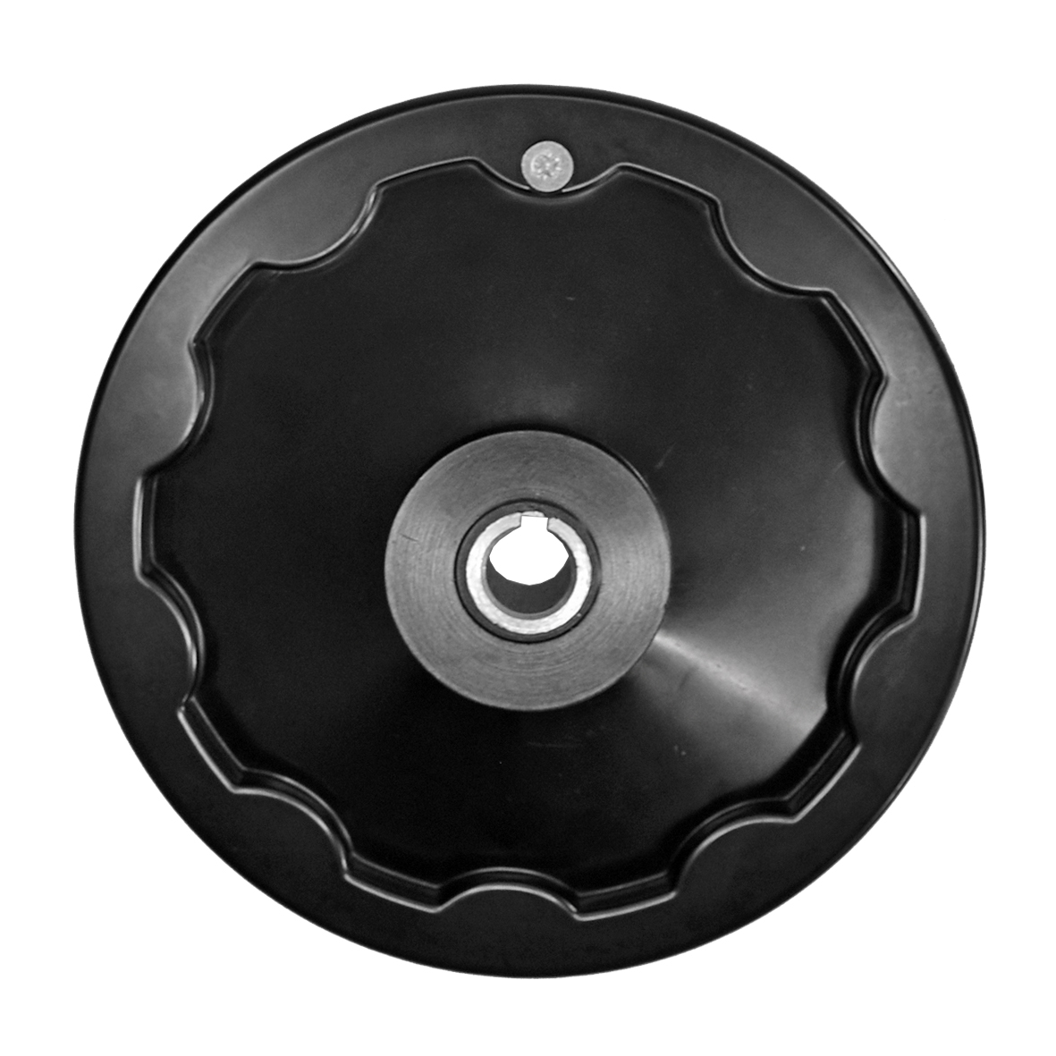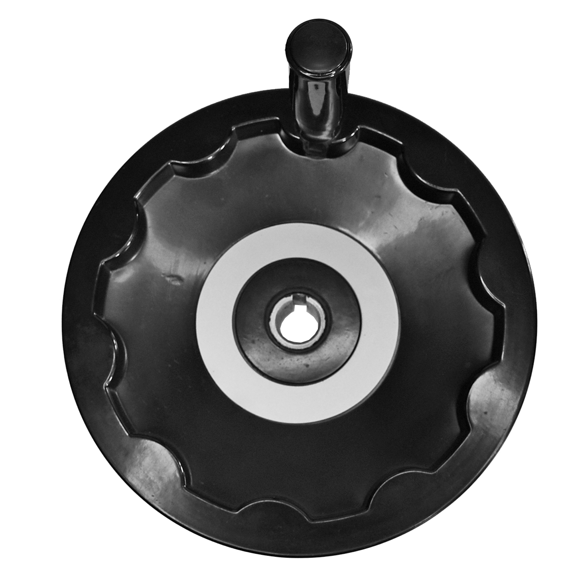 Дисковий маховик зі складною ручкою Верстатний дисковий бакелітовий штурвал зі шпоночним отвором. Циліндрична ручка обертається на гвинті, яким кріпиться до тіла маховика та для зручності складається. Матеріал: тіло — бакеліт, маточина — вуглецева сталь Стійкий до олій та мастильних матеріалів, органічних розчинників та інших агресивних середовищ.