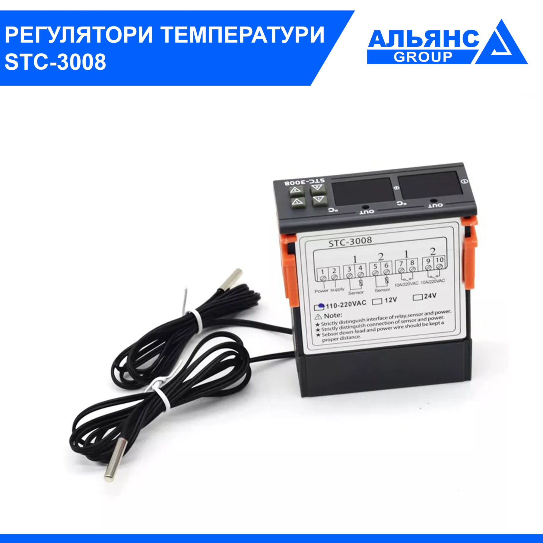 Терморегулятор STC – 3008 з 2 незалежними датчиками температури для вимірювання у 2 зонах, та 2 незалежними реле (нагрів/охолодження) з широким набором функцій Технічні параметри: - Діапазон вимірювання температури: -55 ℃ ~ 120 ℃ - Точність вимірювання температури: ±1 ℃ (-50 ℃ ~ 70 ℃) - Напруга живлення: 24VDC - Датчик: 2 датчики NTC - Температура робочого середовища для контролера: 0℃~60℃ - Відносна температура для роботи контролера: 20~85% (без інею) - Температурна роздільна здатність: 0,1 ℃ - Споживана потужність контролера становить менш як 3 Вт - Вихідна потужність реле: охолодження (10A/250VAC), нагрівання (10A/250VAC) - Розмір передньої панелі: 75*34,5 мм (довжина × ширина) - Загальні розміри: 75*34,5*85 мм (довжина × ширина × глибина) - Розмір монтажного отвору: 71*29 мм (довжина × ширина) - Довжина кабелю датчика: 1 метр (включаючи довжину зонда)