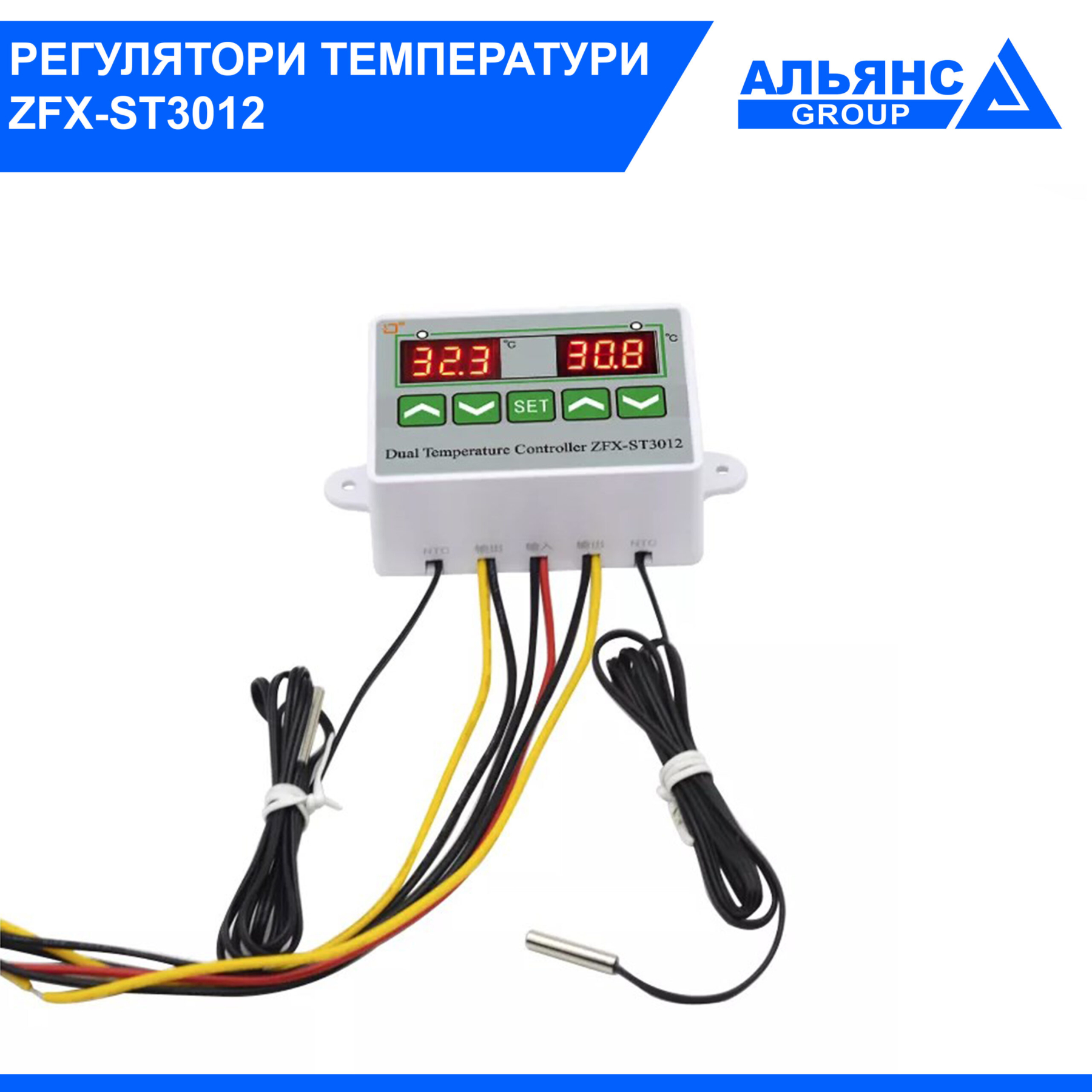 Терморегулятор ZFX-ST3012 24VDC Технічні параметри: - Діапазон регулювання температури: - 50 ℃ ~ 110 ℃ - Похибка вимірювання температури: ±0,5 ℃ - Модель датчиків: 2 незалежних датчики NTC (10K/3435) - Довжина кабелю датчиків 1 метр, розмір датчиків: ⌀4 мм*20 мм - Точність вимірювання: 1 ℃ - Контроль 2 зон в режимах нагрів / охолодження - Напруга живлення: 24 VDC - Робочий струм контролера: MAX 200mA - Струм контакту реле: 2 незалежних реле 5A/12V - Зберігання даних: Так - Робоча температура контролера: 0 ℃ ~ 50 ℃ - Загальні розміри: 76 (довжина) × 55 мм (ширина) × 31 мм (глибина) - Відстань гвинтів монтажних отворів: 78 мм Корисне PDF
