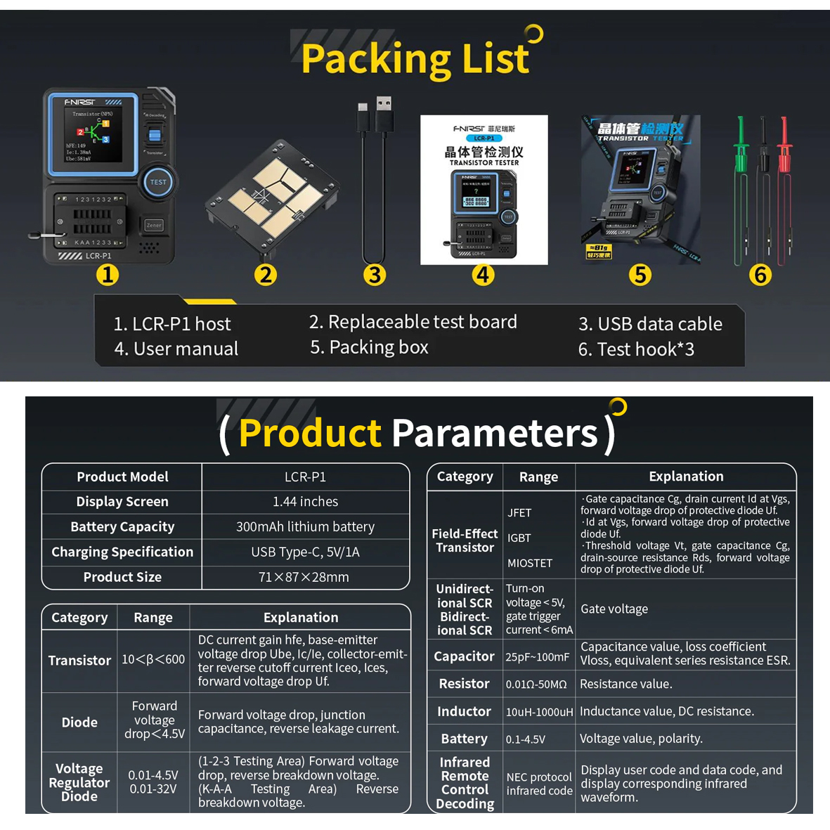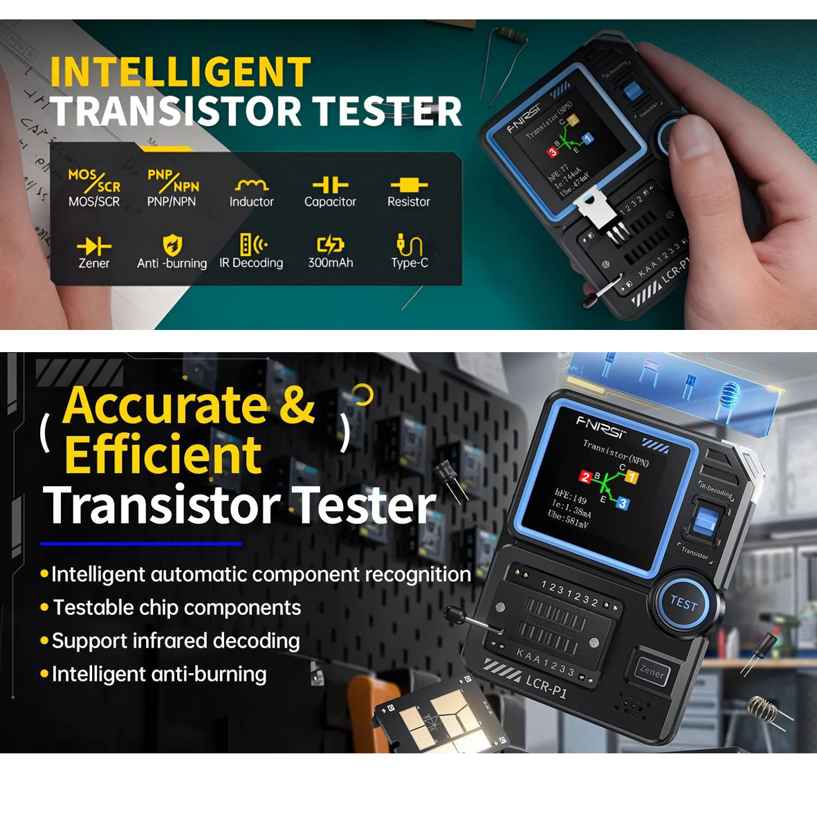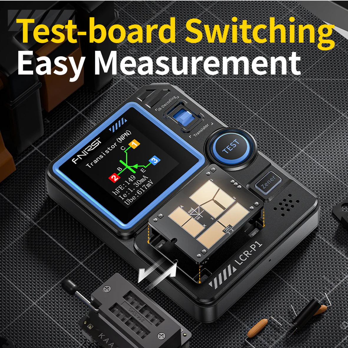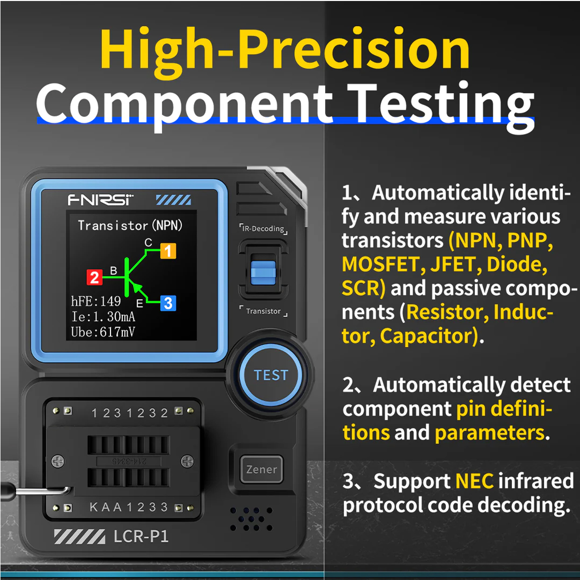 FNIRSI LCR-P1 — це високоточний багатофункціональний електронний вимірювальний прилад, розроблений спеціально для інженерів-електронщиків, техніків та ентузіастів, який призначений для виявлення та аналізу продуктивності та характеристик напівпровідникових компонентів, таких як транзистори, діоди, тріоди та польові транзистори (FET), вимірювання характеристик конденсаторів, котушок індуктивності, резисторів та акумуляторних батарей. Прилад оснащений кольоровим екраном та вбудованим акумулятором, він дозволяє проводити багатопараметричні вимірювання різних компонентів, автоматично ідентифікуючи їх та визначаючи розташування їх виводів, спрощуючи процес роботи та підвищуючи ефективність. Особливості: