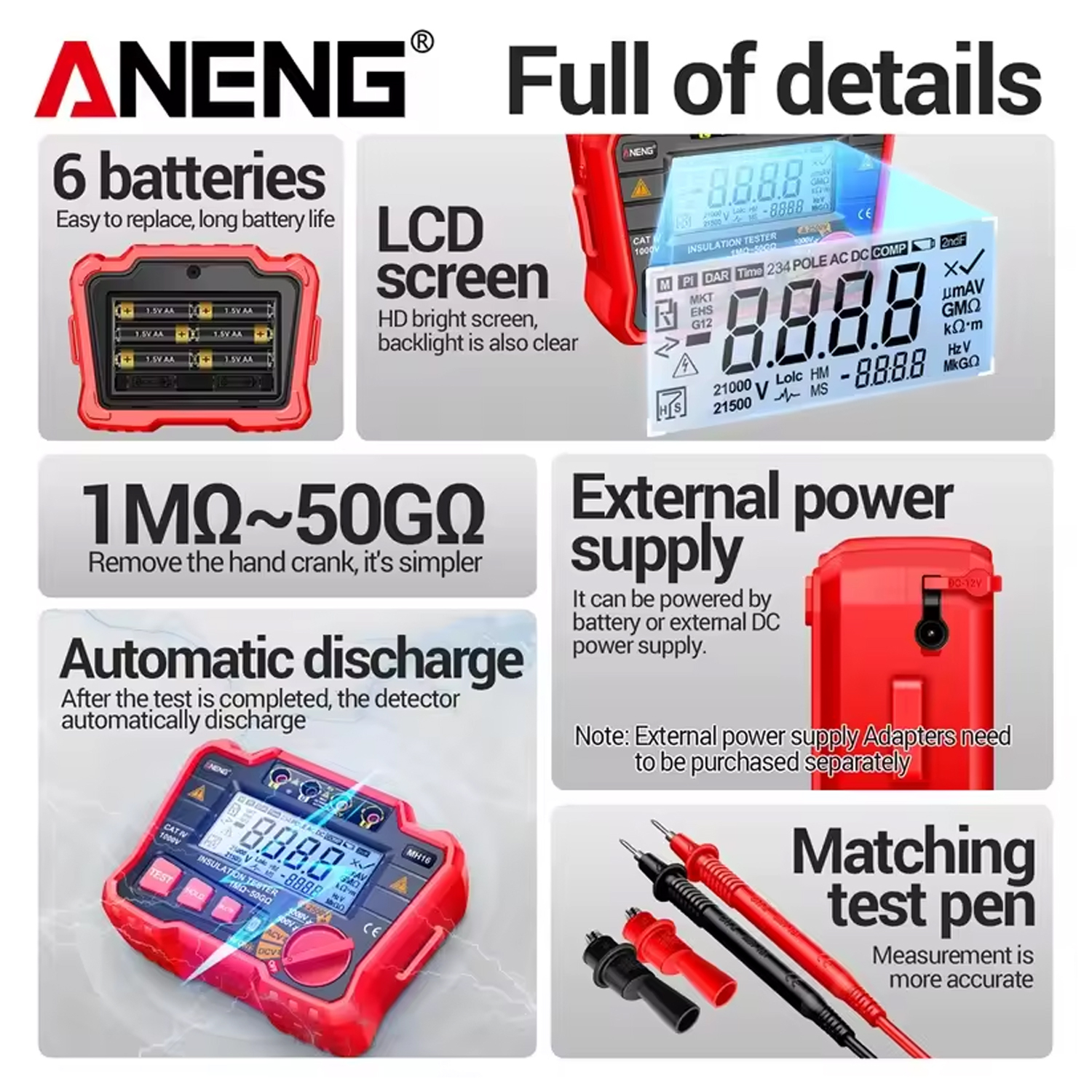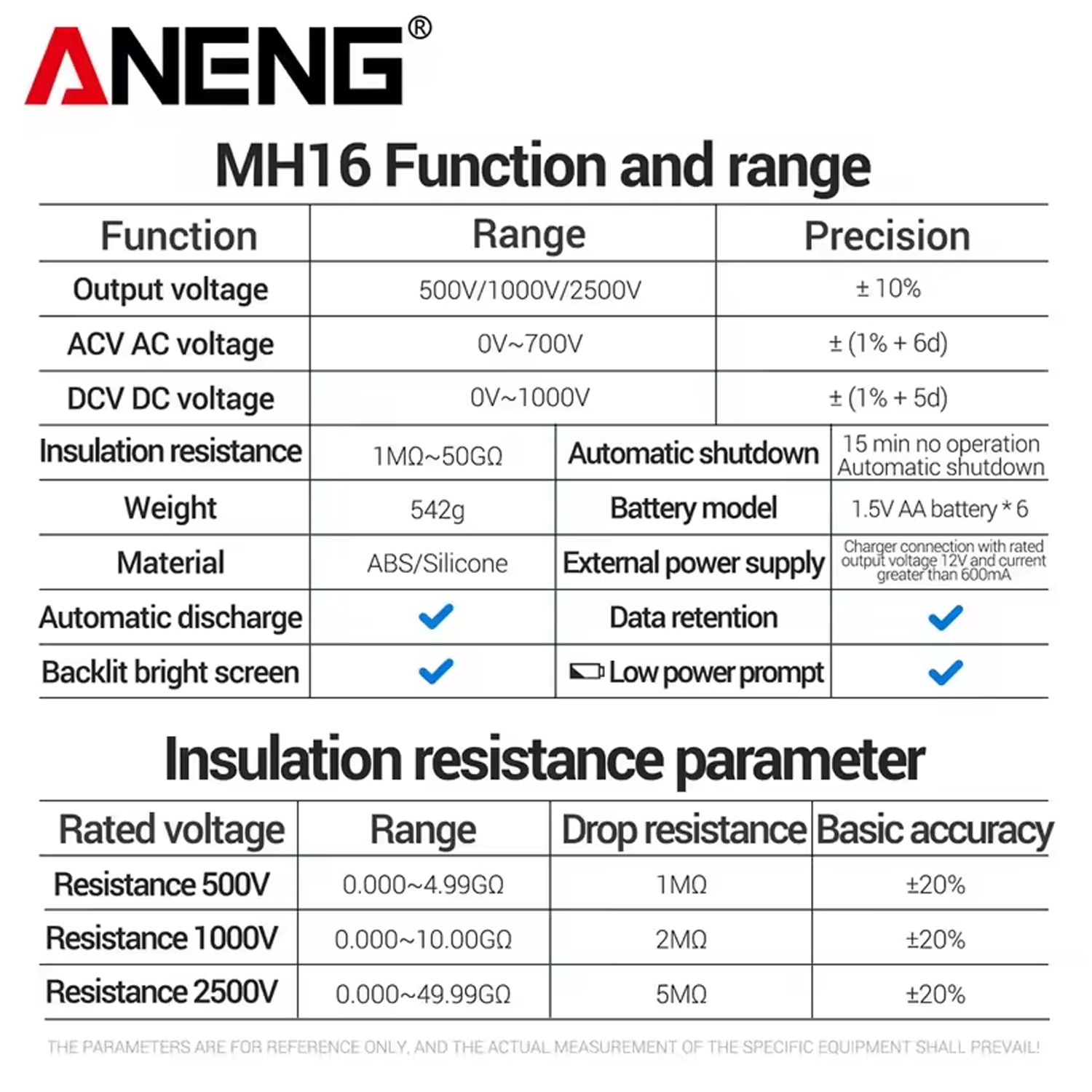 Aneng MH16 — це професійний вимірювальний прилад, призначений для тестування якості ізоляції високовольтного обладнання. Він є незамінним інструментом для електриків та інженерів, які обслуговують електродвигуни, трансформатори, кабельні лінії, генератори та комутаційну апаратуру. Прилад генерує високу напругу (до 2500В) для виявлення витоків струму та пошкоджень ізоляції, а також працює як точний вольтметр.