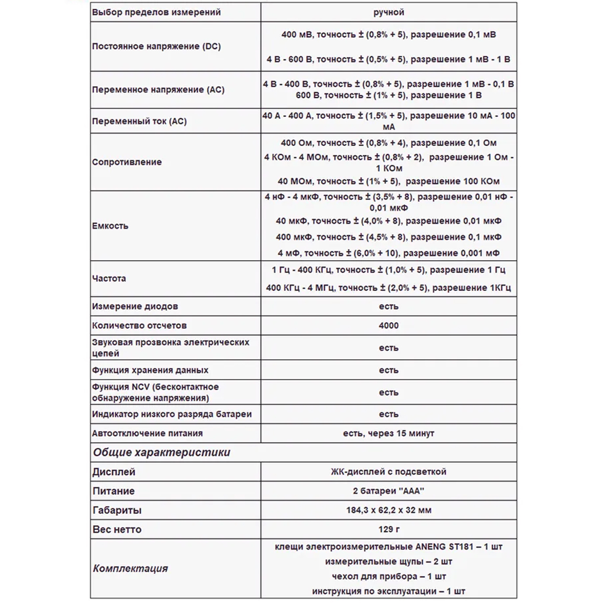 | ANENG ST181 | Діапазон вимірбвання | Похибка |