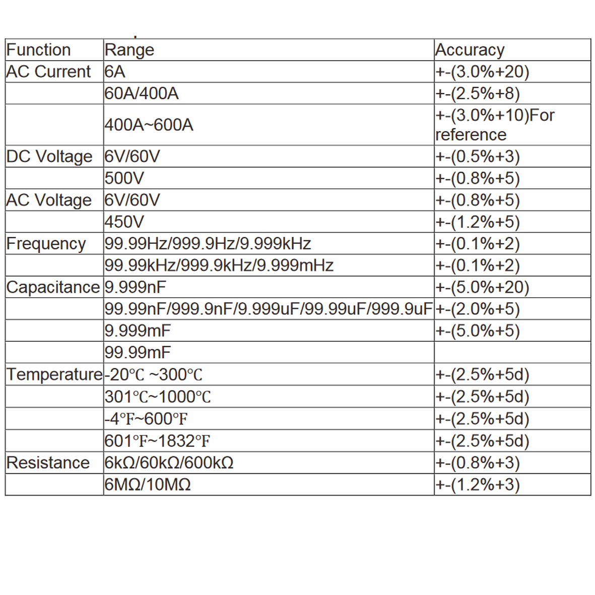 | AC Voltage | 6V/60V | +-(0.8%+5) |