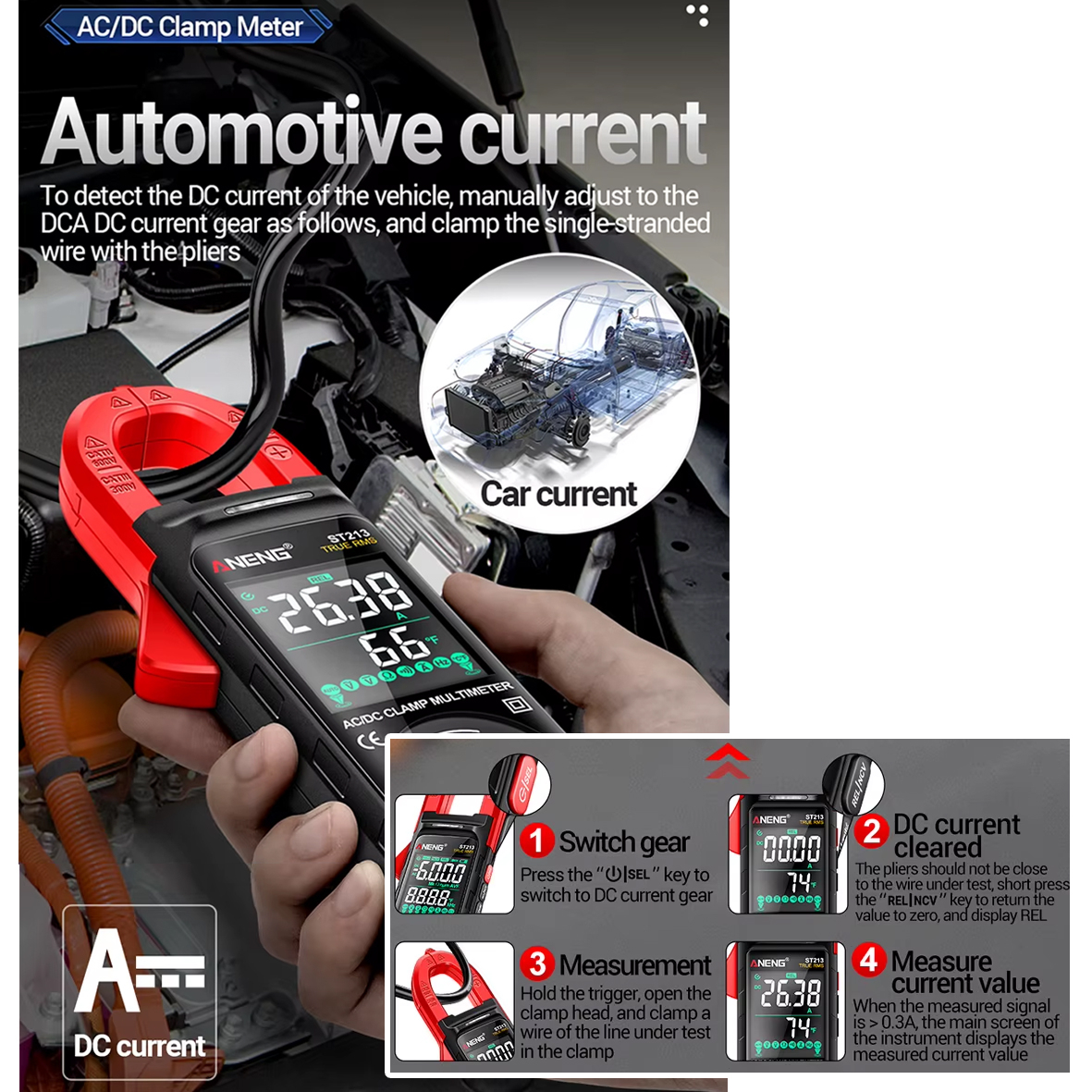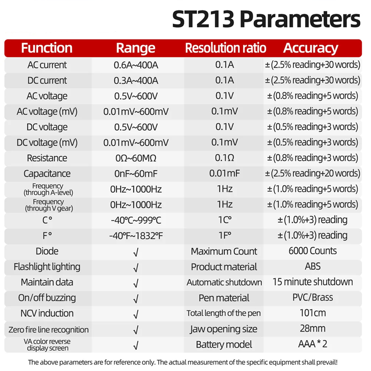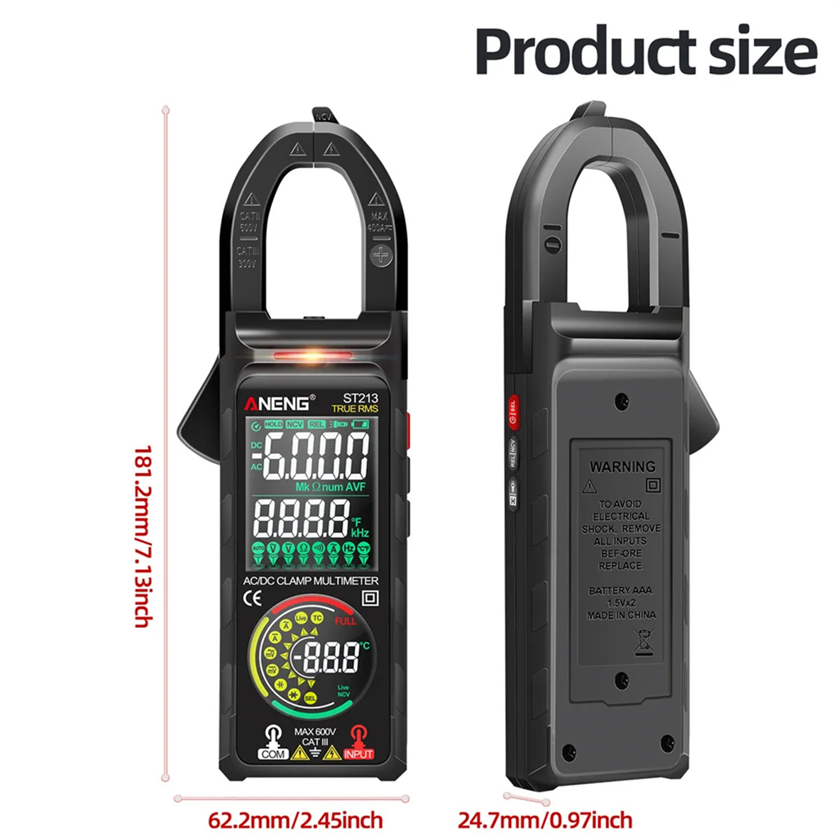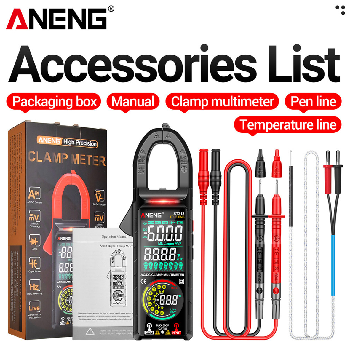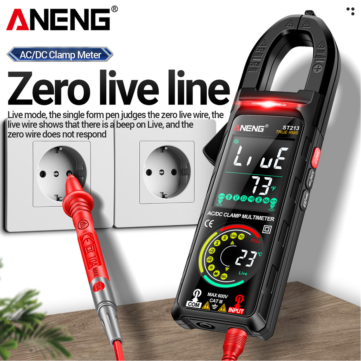 Струмовимірювальні кліщі Aneng ST213 призначені для вимірювання постійного та змінного струму, постійной та змінной напруги, вимірювання опору, ємності,частоти та температури. Кліщі токові Aneng ST213 можна застосовувати також для продзвінків електричних ланцюгів зі звуковим сигналом, продзвінки діодів і транзисторів. Кліщі струмовимірювальні Aneng ST213 забезпечені функцією NCV- пошуку прихованого проведення, функцією пошуку нульової шини, функцією автоматичного вимкнення живлення через 15 хв бездіяльності, є вбудований ліхтарик. Струмовимірювальні кліщі Aneng ST213 мають кольоровий РК-екран із підсвіткою, наочний і помітний за сонячного освітлення. Параметри приладу дають змогу застосовувати кліщі токові під час діагностики в автомобілі для вимірювання показників акумулятора. Характеристики токовимірювальних кліщів Aneng ST213: