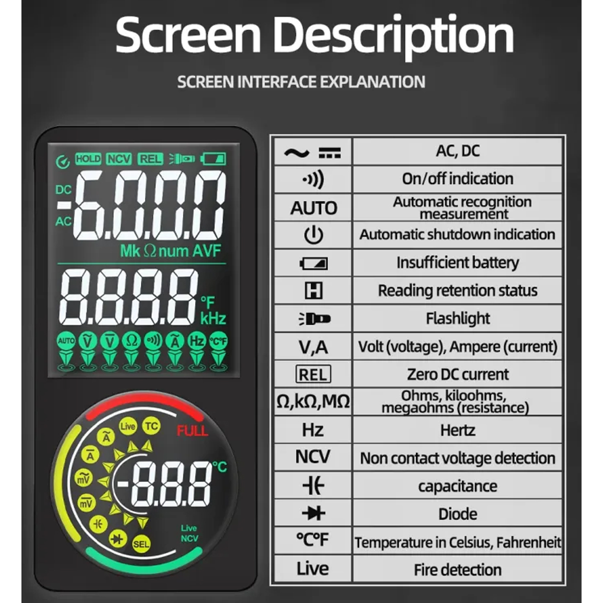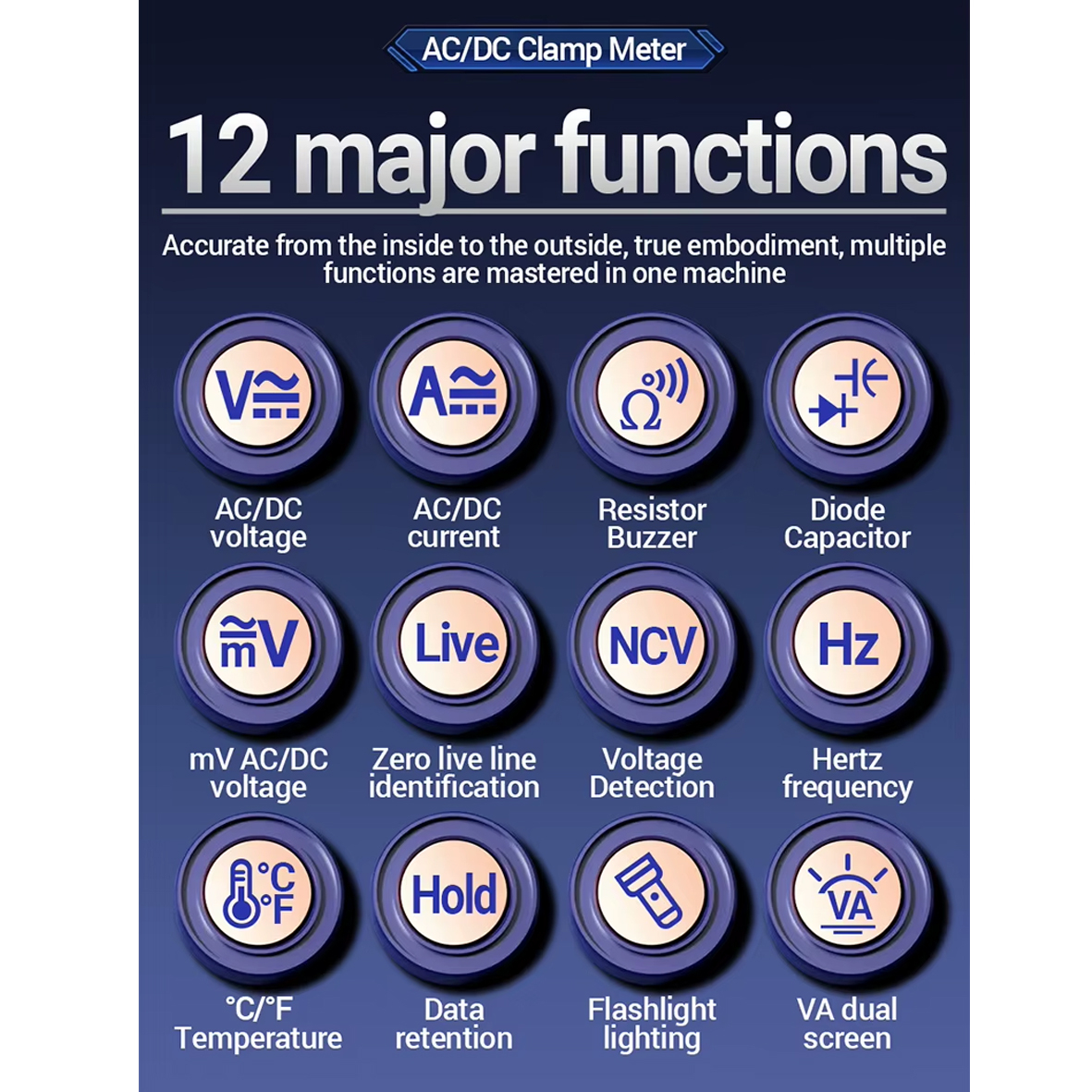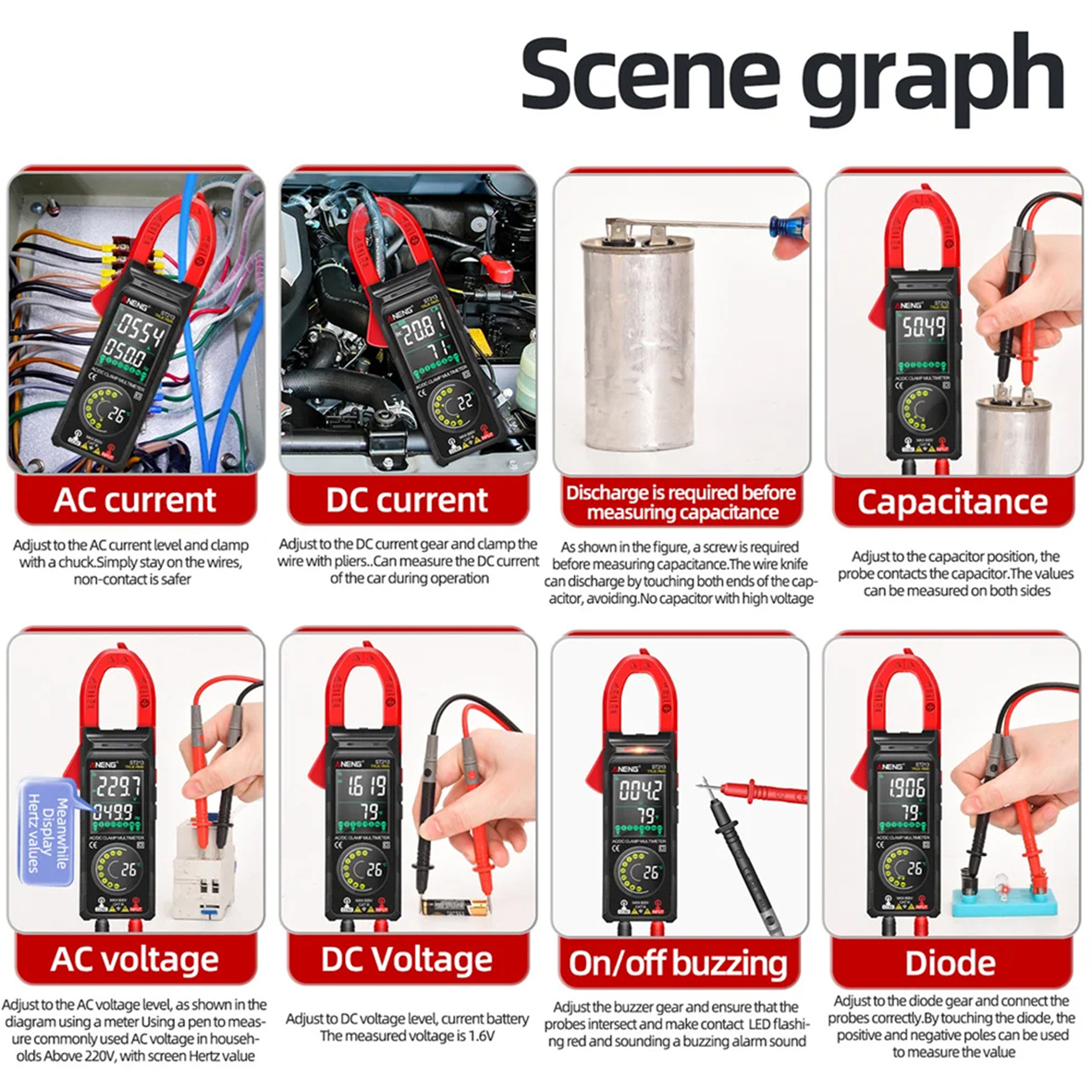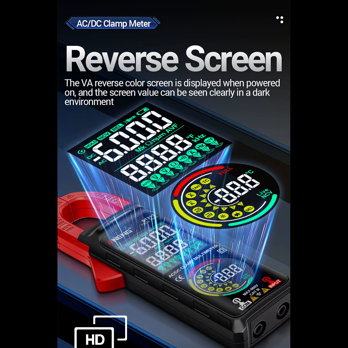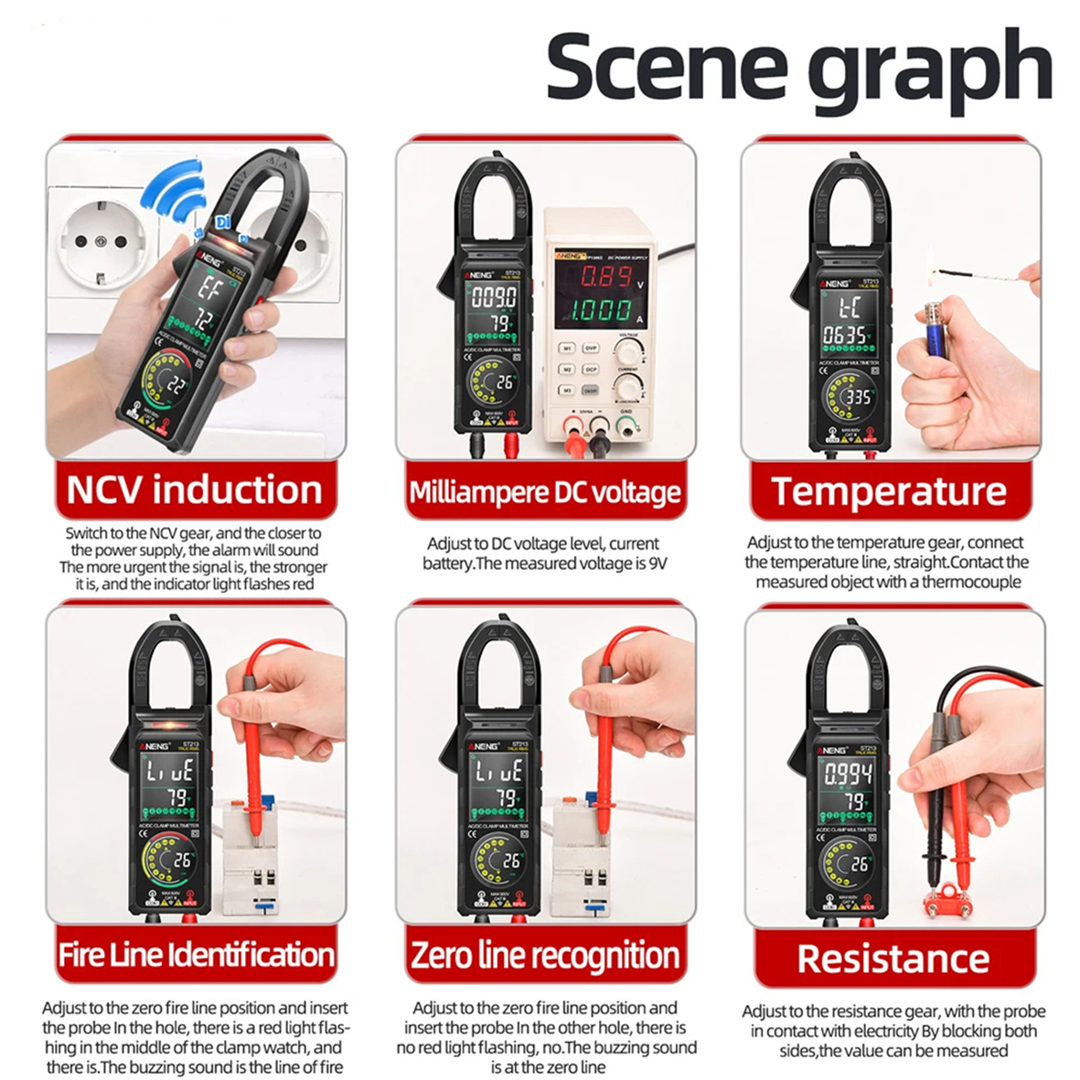 Струмовимірювальні кліщі Aneng ST213 призначені для вимірювання постійного та змінного струму, постійной та змінной напруги, вимірювання опору, ємності,частоти та температури. Кліщі токові Aneng ST213 можна застосовувати також для продзвінків електричних ланцюгів зі звуковим сигналом, продзвінки діодів і транзисторів. Кліщі струмовимірювальні Aneng ST213 забезпечені функцією NCV- пошуку прихованого проведення, функцією пошуку нульової шини, функцією автоматичного вимкнення живлення через 15 хв бездіяльності, є вбудований ліхтарик. Струмовимірювальні кліщі Aneng ST213 мають кольоровий РК-екран із підсвіткою, наочний і помітний за сонячного освітлення. Параметри приладу дають змогу застосовувати кліщі токові під час діагностики в автомобілі для вимірювання показників акумулятора. Характеристики токовимірювальних кліщів Aneng ST213:
