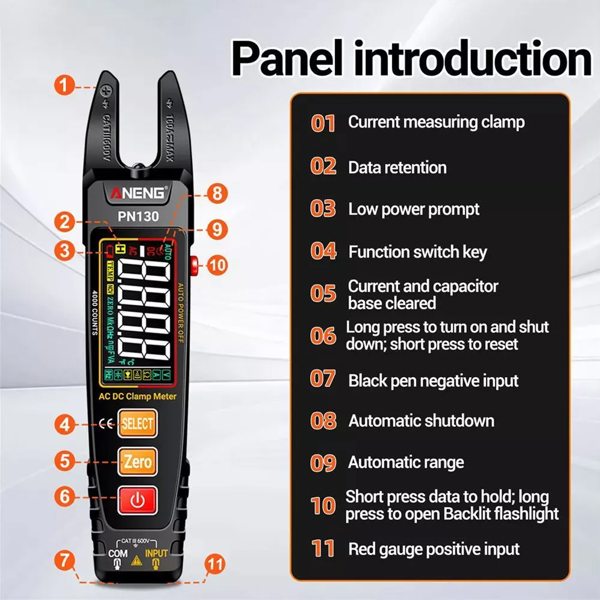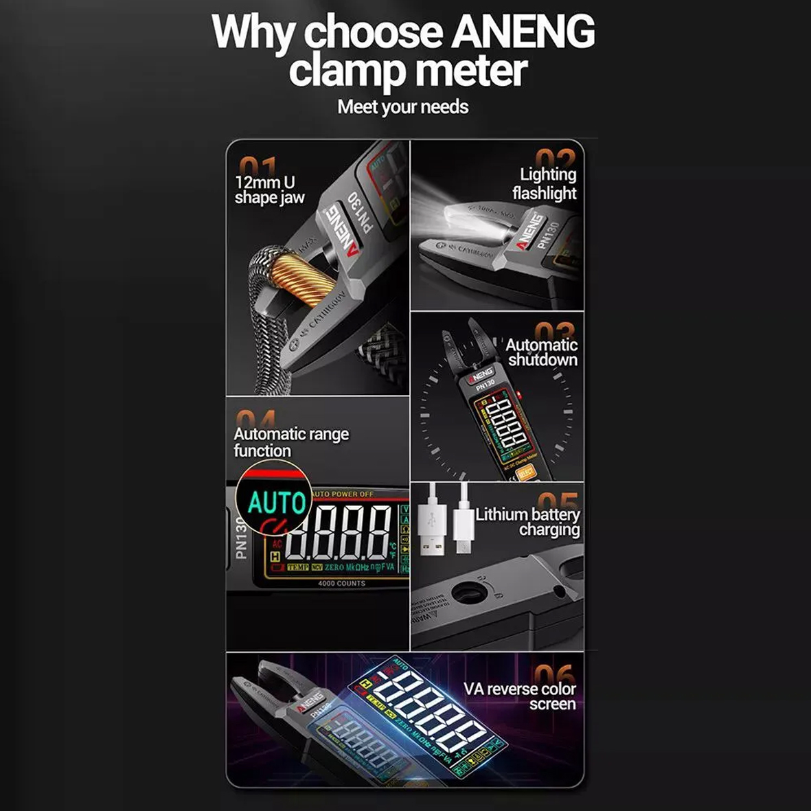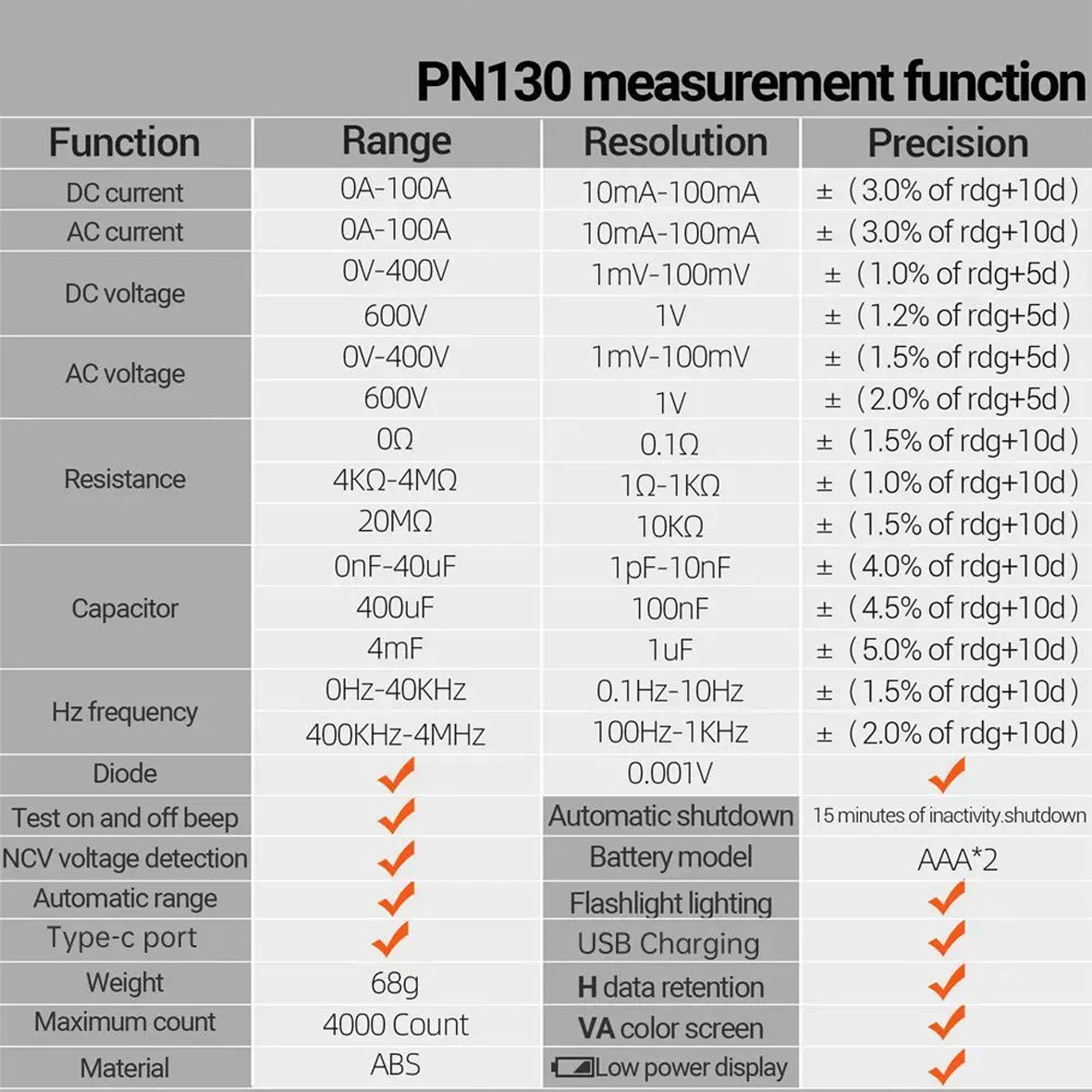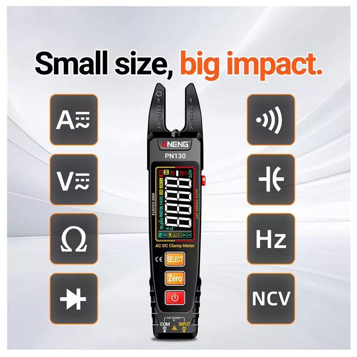 ANENG PN130 – це компактний та професійний вимірювальний прилад з кольоровим РК-дисплеєм та вбудованим акумулятором. Він призначений для точного вимірювання основних електричних параметрів: сили струму, напруги, опору, ємності та частоти. Особливості ANENG PN130: