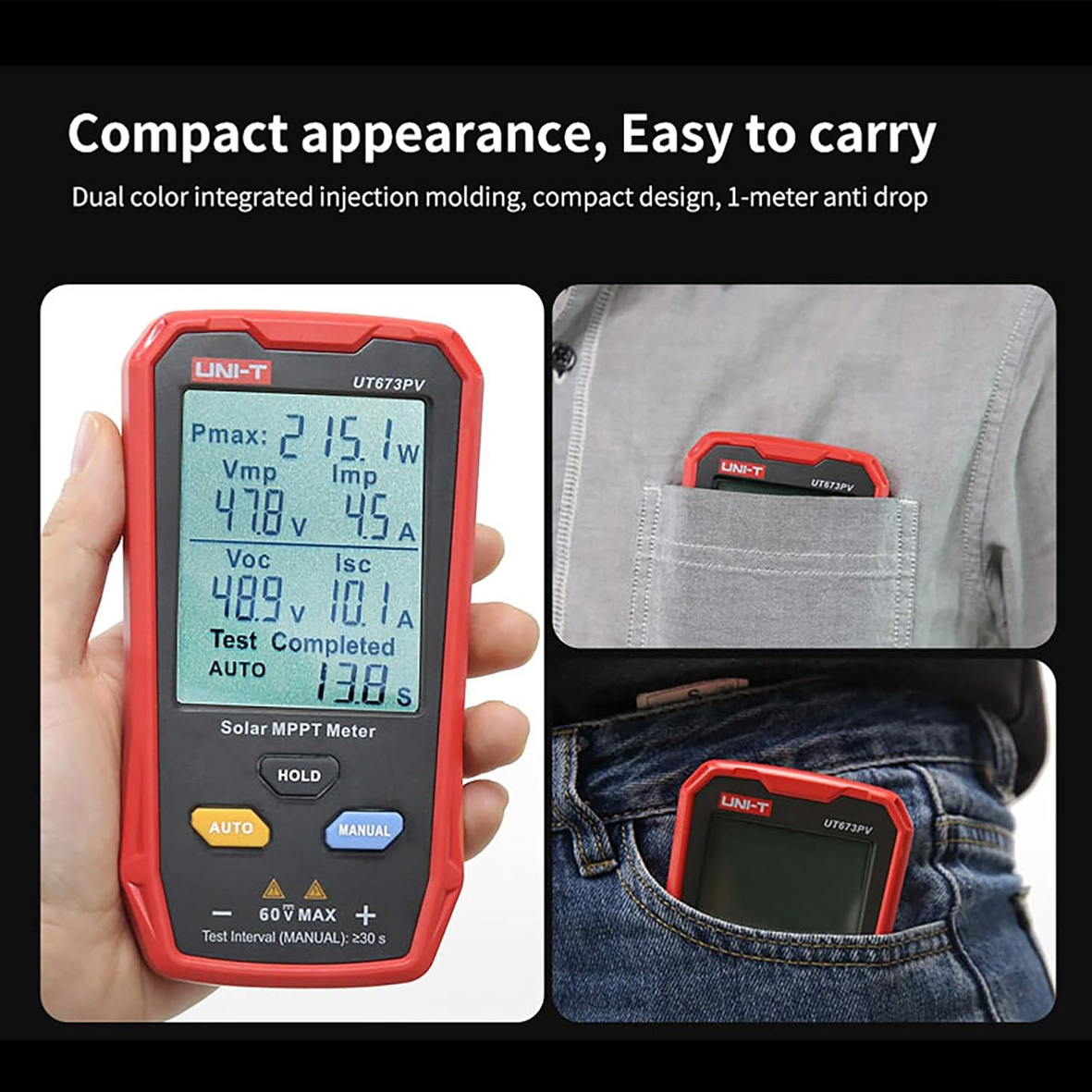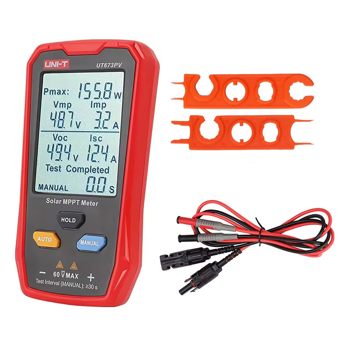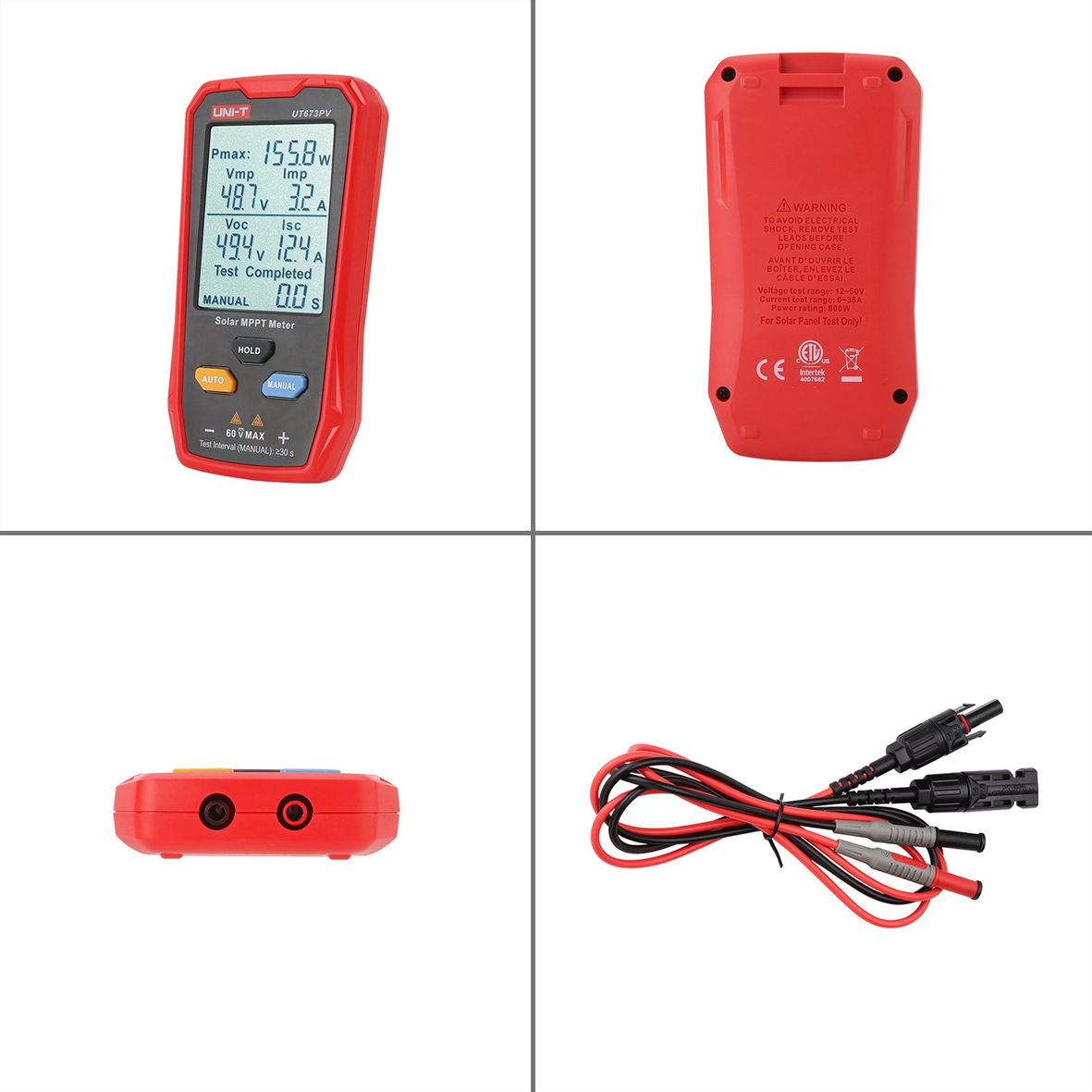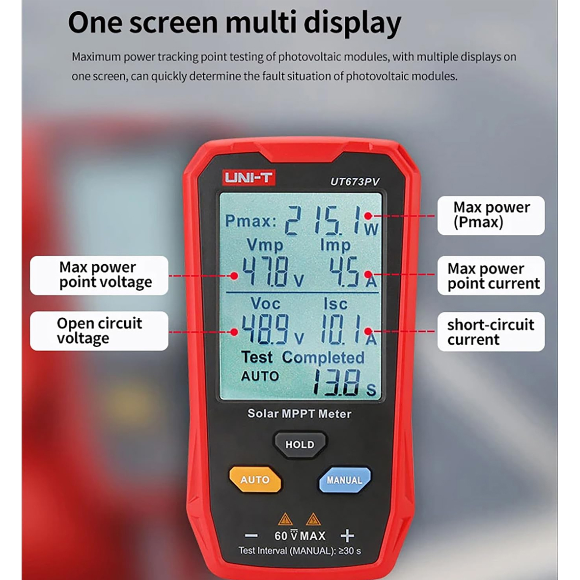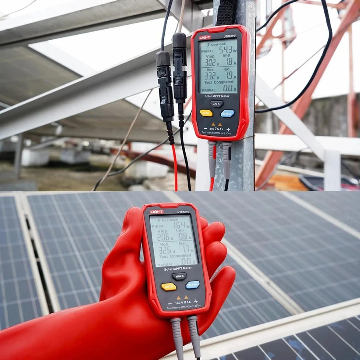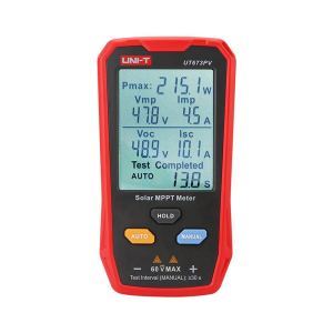 UNI-T UT673PV – це цифровий тестер для відстеження точки максимальної потужності (MPPT) фотоелектричних модулів, створений для роботи із сонячними панелями. Прилад може одночасно вимірювати максимальну потужність, пікову напругу та струм, напругу холостого ходу та струм короткого замикання сонячних панелей, виявляючи будь-які відхилення у їх роботі. Відстеження точки максимальної потужності (MPPT) є найважливішим індикатором при вимірюванні ефективності генерації електроенергії фотоелектричними установками. Відповідно, тестер UNI-T UT673PV призначений для використання переважно у виробництві, встановленні, обслуговуванні та тестуванні фотоелектричних панелей. Особливості : Автоматичні вимірювання основних параметрів роботи сонячних панелей;