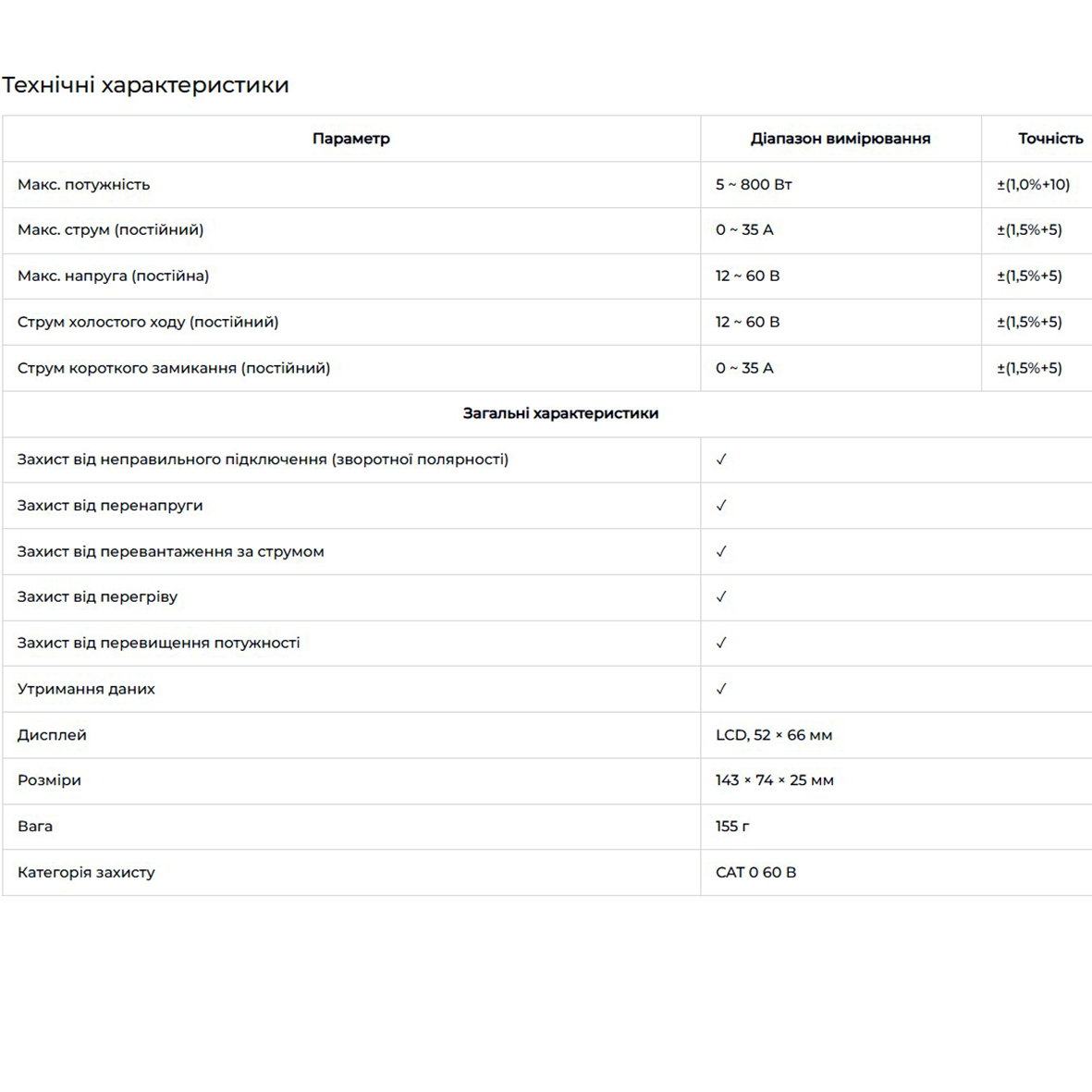 Струм короткого замикання (постійний) 0 ~ 35А, точність ±(1,5%+5); Загальні характеристики : Захист від неправильного підключення (зворотної полярності) ✓
