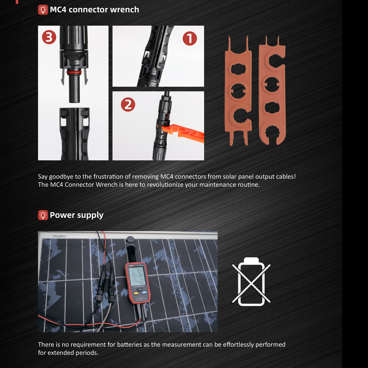 Оснащений комплектом тестових дротів з коннектором MC4 для сонячних панелей;