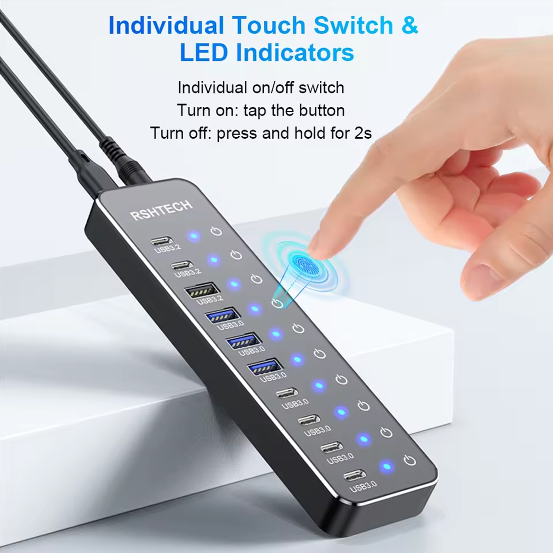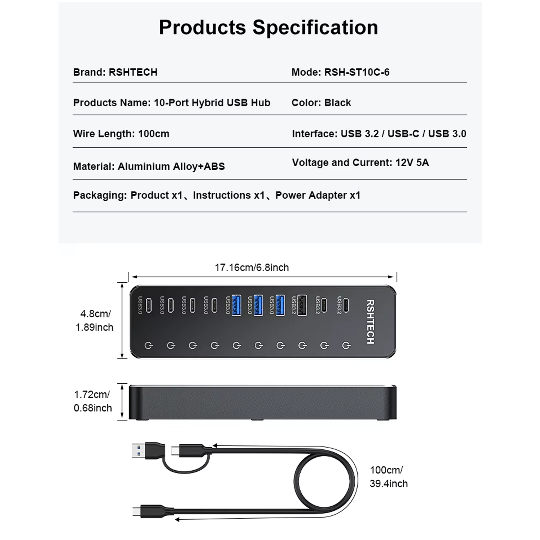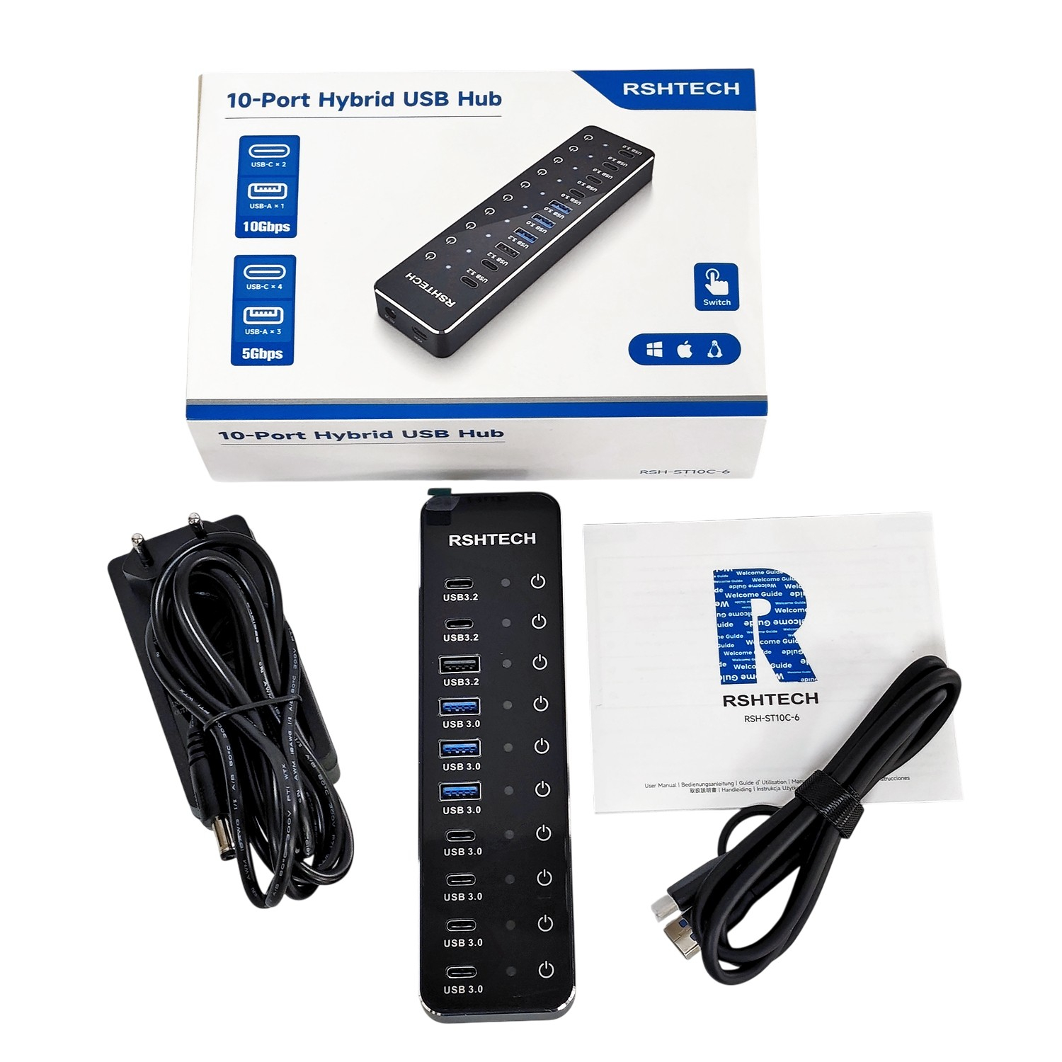 RSHTECH 3.2 Gen 2 Aluminum Hub — це ідеальне рішення для професіоналів, геймерів та творців контенту, яким потрібна безкомпромісна швидкість і стабільність. Цей активний 10-портовий хаб перетворює один порт вашого ПК чи ноутбука на потужну станцію підключення.