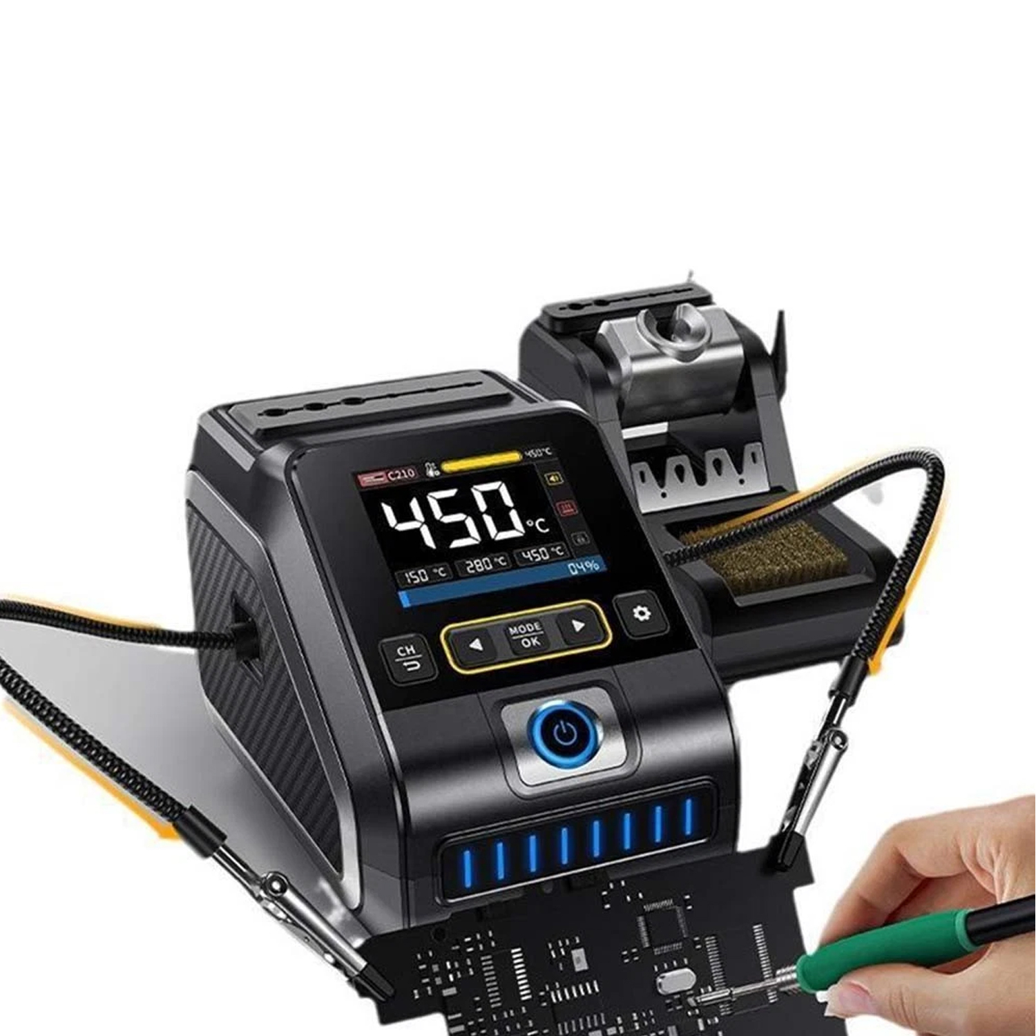 Паяльный зажим с гибкой роботизированной конечностью длиной 37 см – удобный инструмент для фиксации деталей во время пайки и ремонта электроники. Оснащен термоизоляцией для защиты от ожогов, прочной конструкцией без люфта и противоскользящей поверхностью. Гибкий механизм типа «гусиная шея» позволяет легко регулировать положение зажимов. Подходит для содержания печатных плат, мелких компонентов и металлических деталей.