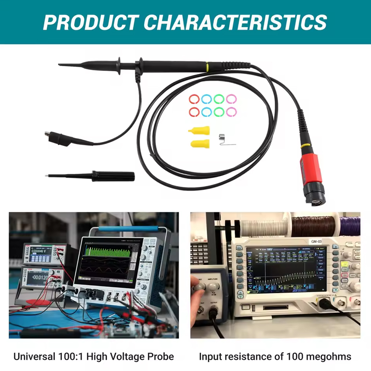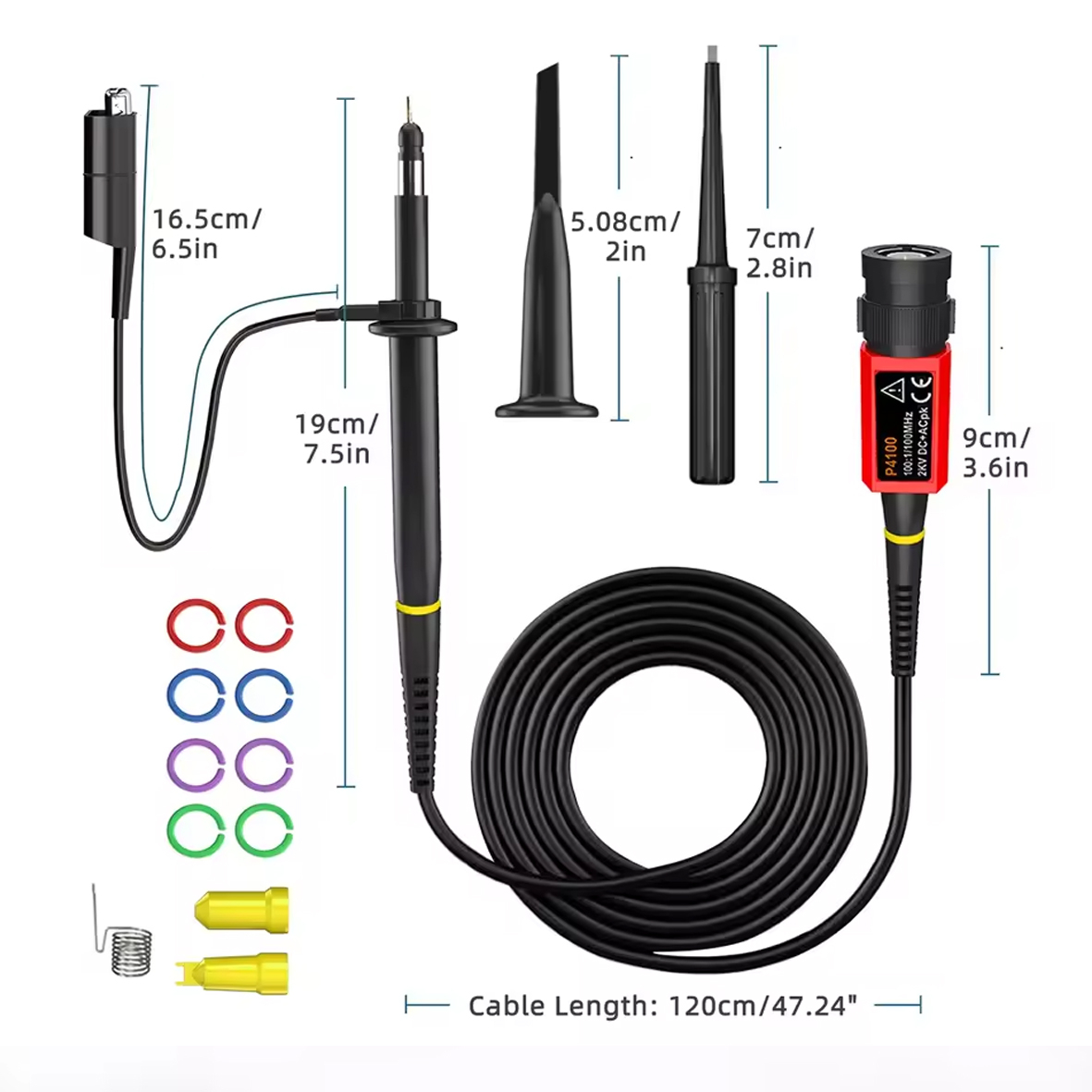 FNIRSI P4100 – это универсальный высоковольтный щуп для осциллографа с коэффициентом деления 100:1, предназначенный для точного измерения сигналов высокой частоты до 100 МГц и напряжения до 2000 В (Vp-p). Такой пробник идеально подходит для использования в лабораториях, сервисных мастерских, учебных заведениях и профессиональной работе с электроникой.